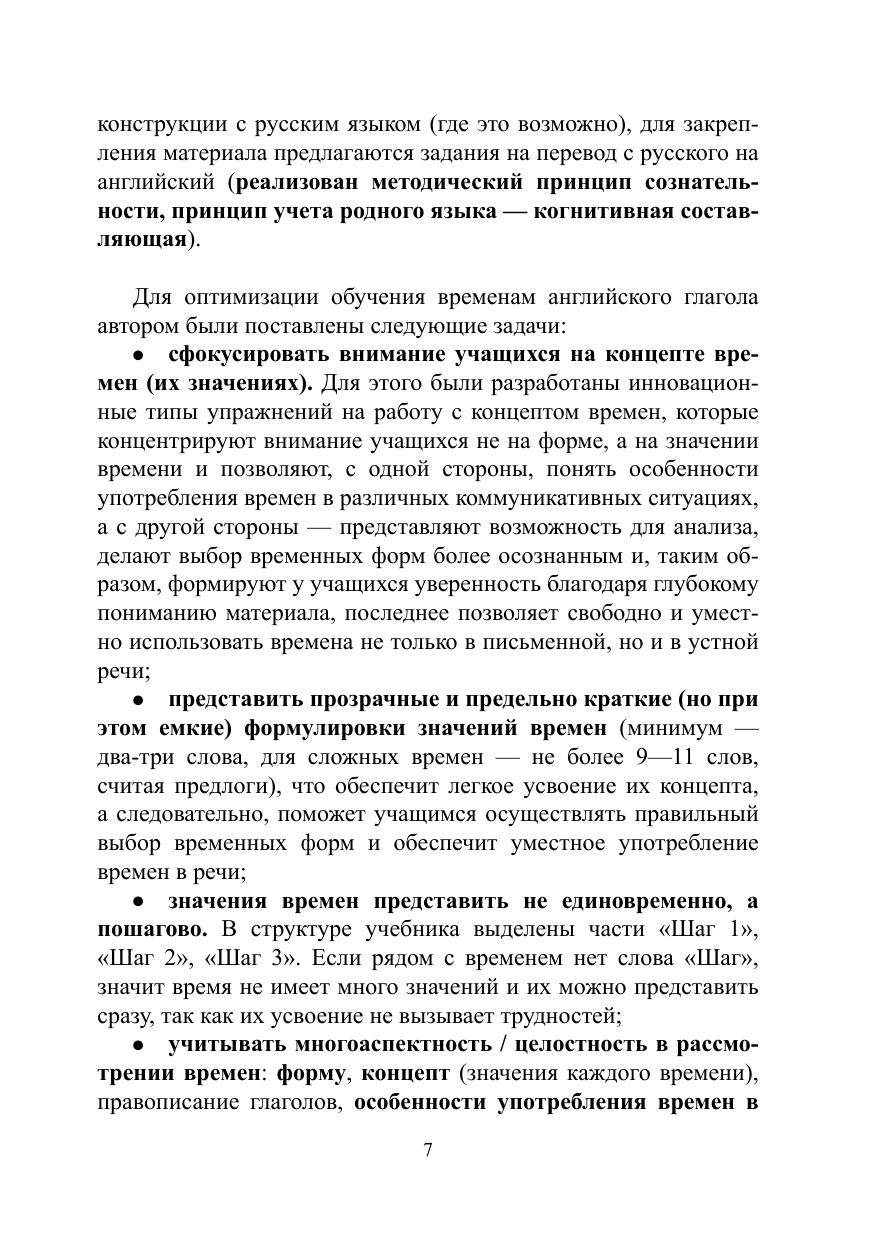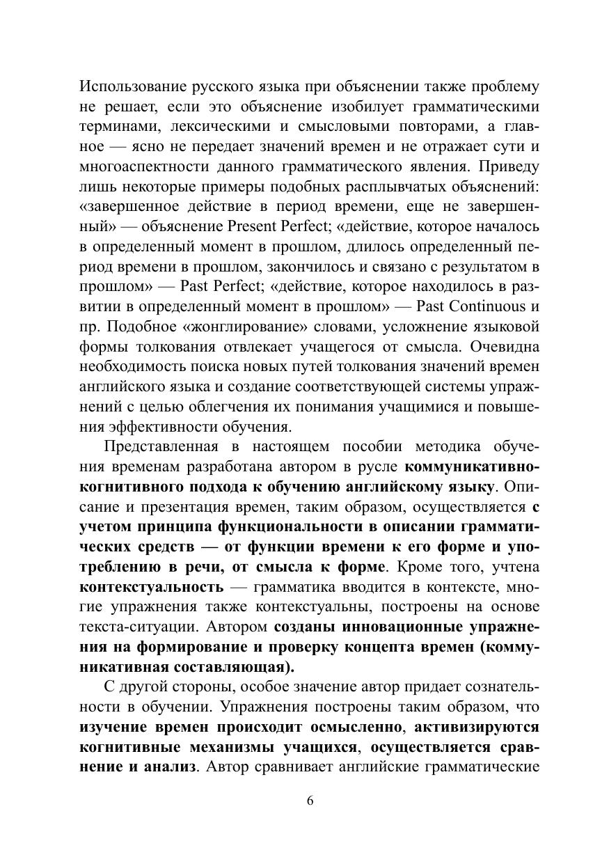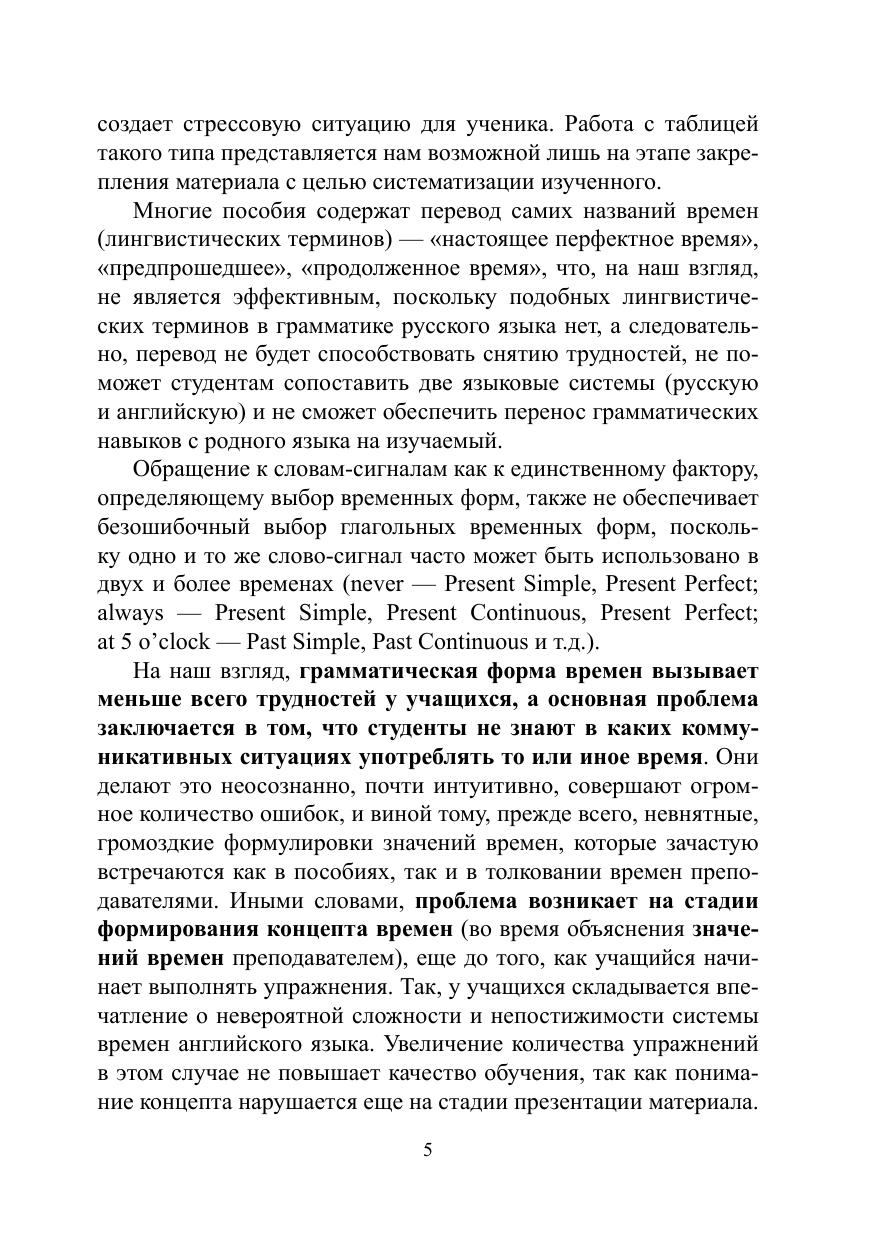 В книге представлена авторская система обучения временам в русле коммуникативно-когнитивного подхода — разработанные автором лаконичные формулировки значений времен (сложная грамматическая тема объясняется предельно просто) и серия инновационных упражнений на формирование и проверку понимания концепта времен. Обучение по данной методике обеспечивает правильное понимание значений времен учащимися и, как следствие, правильный выбор глагольных временных форм и их уместное употребление в речи. Презентация времен осуществляется с учетом принципа функциональности в описании языковых средств — от функции времени к его использова-нию в речи в реальных ситуациях общения, обучение осуществляется от смысла к форме, что обеспечивает его коммуникативную направленность. При этом форма глагола не игнорируется — в книге последовательно освещаются следующие аспекты: КОНЦЕПТ → ФОРМА → УПОТРЕБЛЕНИЕ.