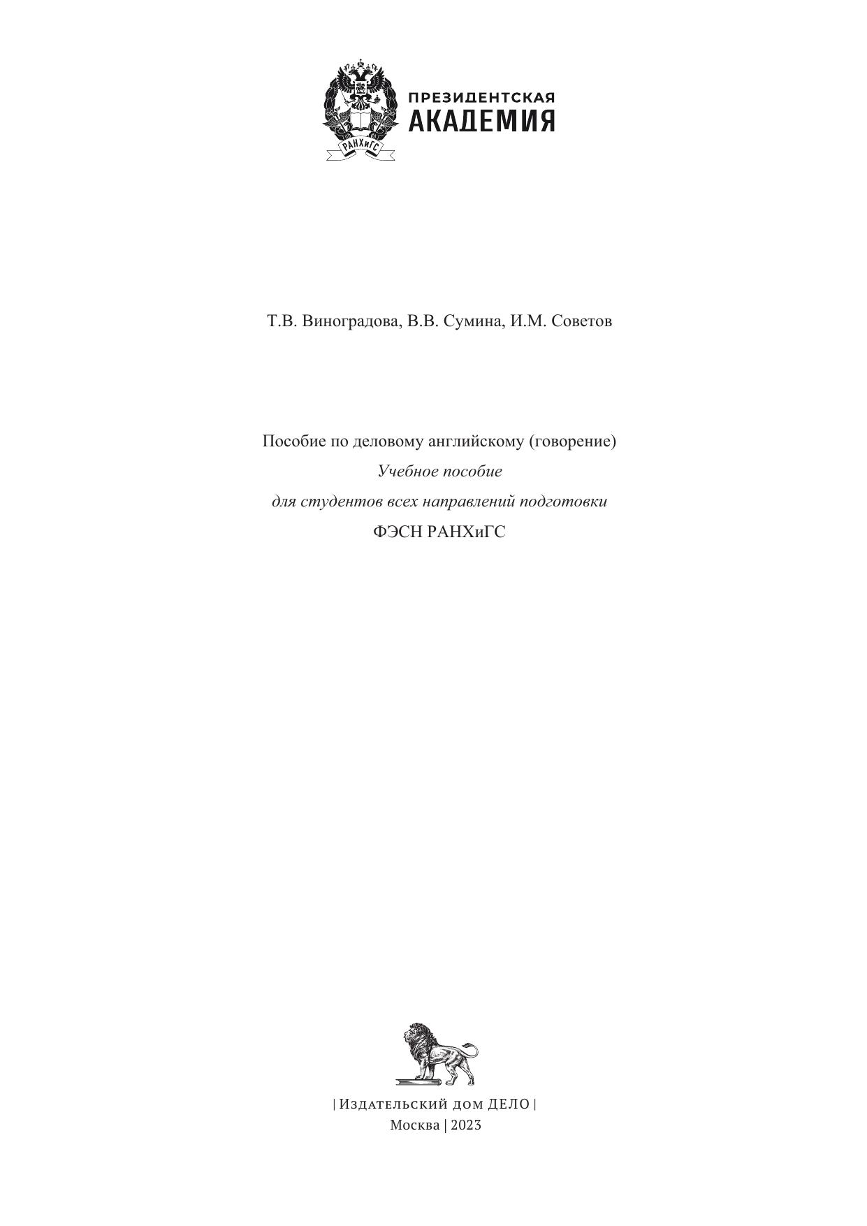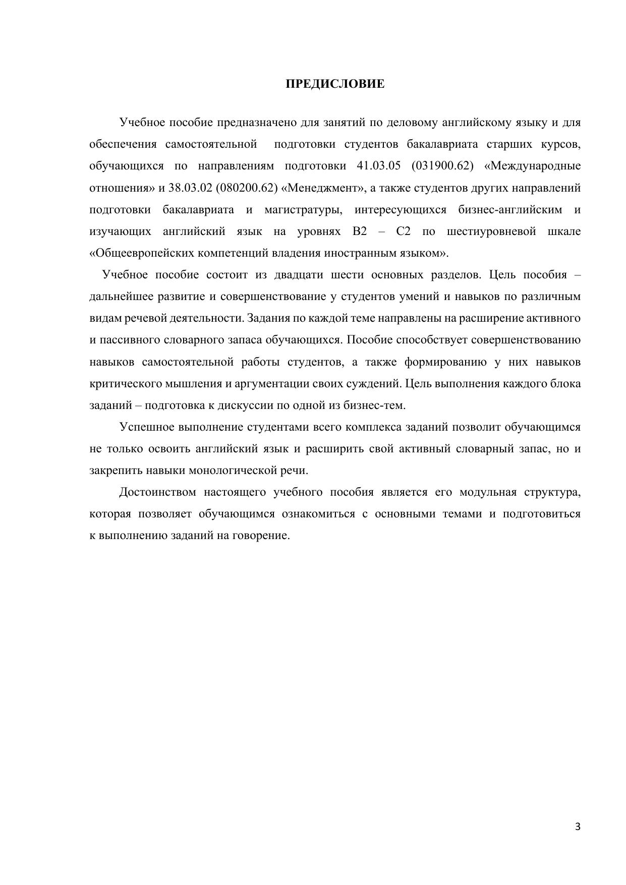 Учебное пособие представляет собой сборник тематических заданий по тренировке говорения в рамках курса делового английского. В нем представлены интеллект-карты по основным бизнес-темам, которые служат эффективной опорой для развития коммуникативных навыков на английском языке на уровне B2 – C1 (в соответствии с «Общеевропейскими компетенциями владения иностранным языком»). Учебное пособие предназначено для направлений подготовки 41.03.05 (031900.62) «Международные отношения» и 38.03.02 (080100.62) «Менеджмент», а также студентов других направлений подготовки бакалавриата и магистратуры, интересующихся изучением английского языка.