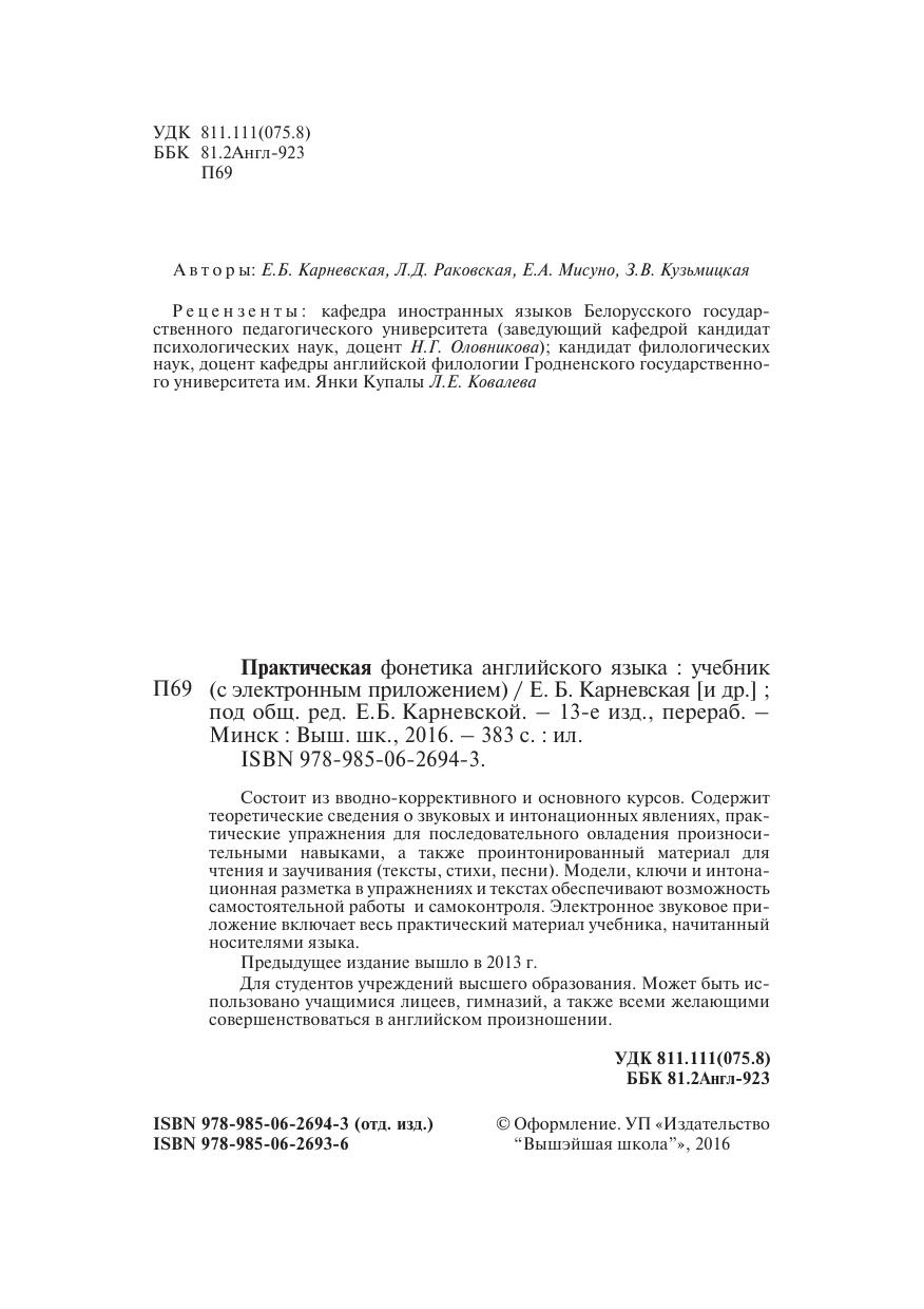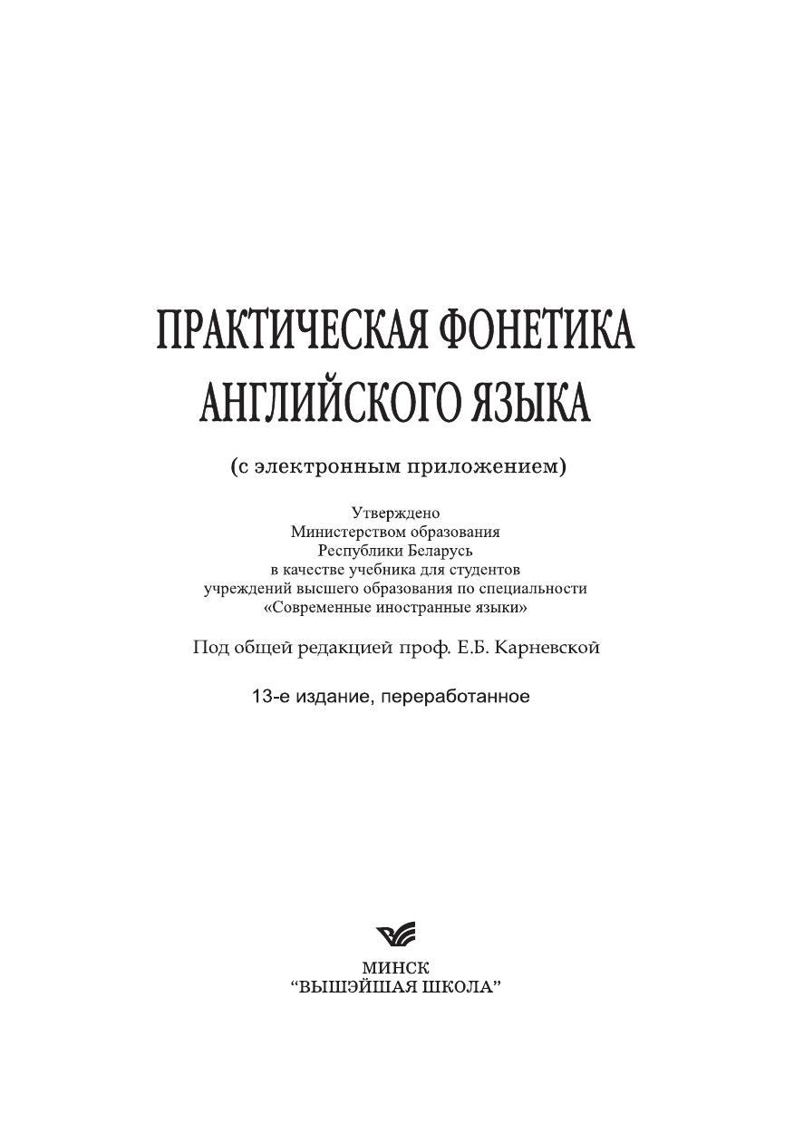 Предыдущее издание вышло в 2013 г. Для студентов учреждений высшего образования. Может быть использовано учащимися лицеев, гимназий, а также всеми желающими совершенствоваться в английском произношении.