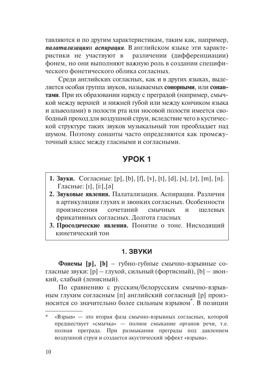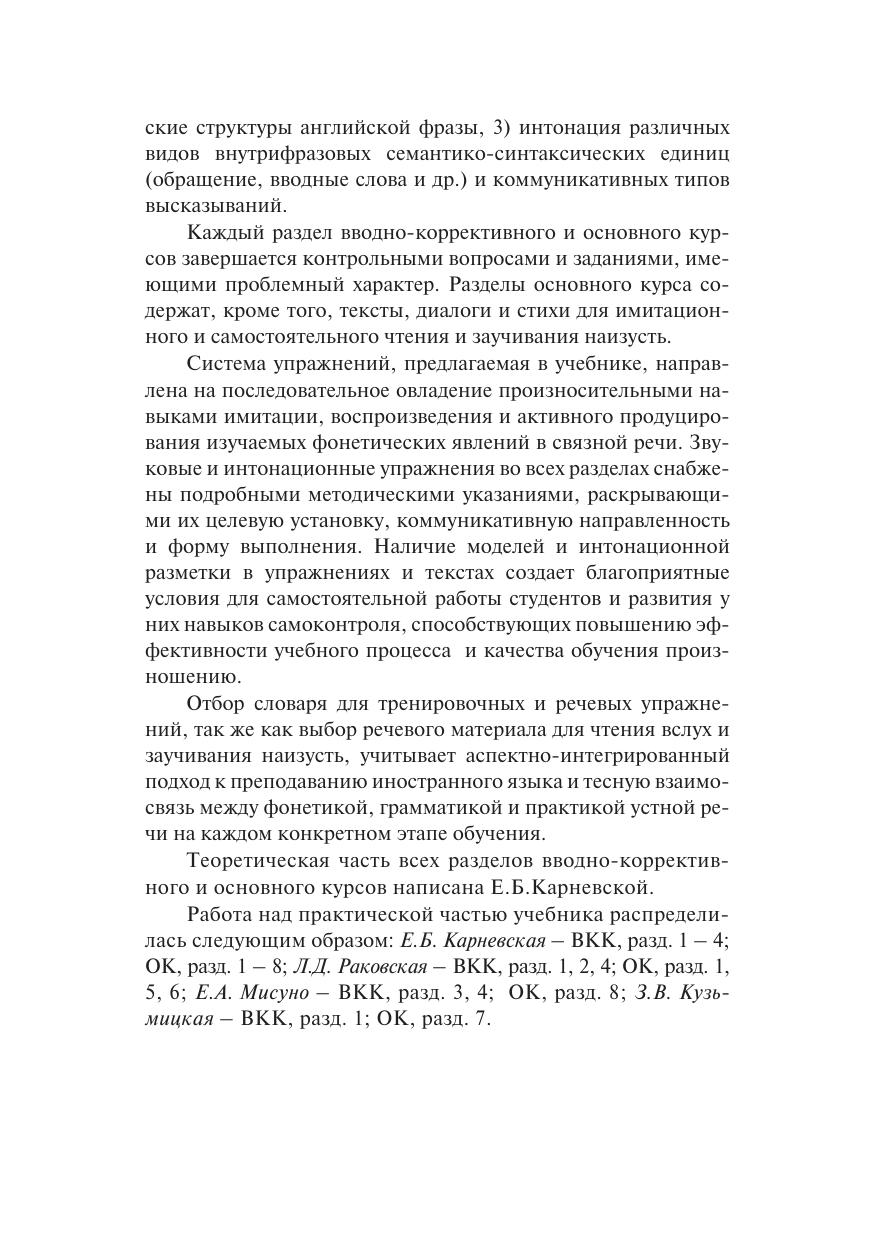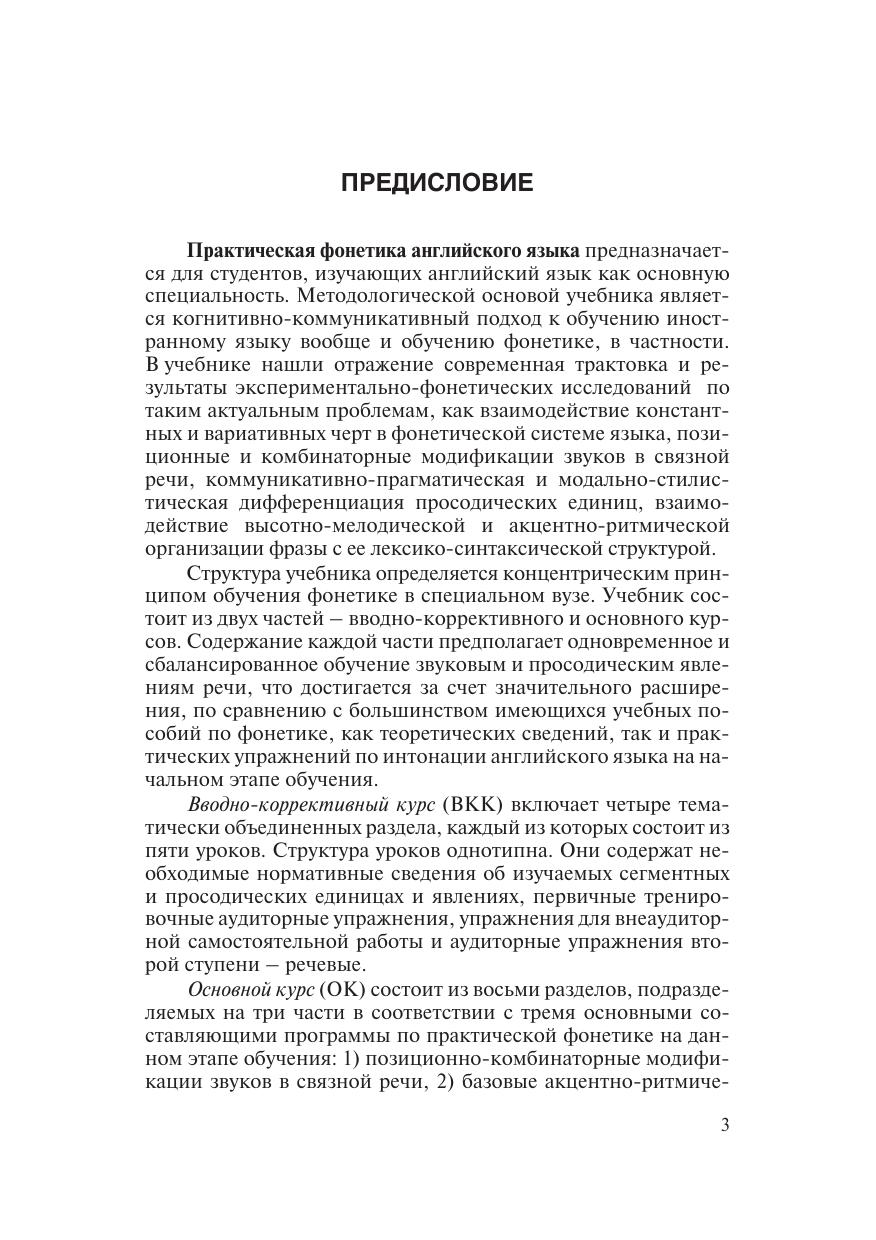 Состоит из вводно-коррективного и основного курсов. Содержит теоретические сведения о звуковых и интонационных явлениях, практические упражнения для последовательного овладения произносительными навыками, а также проинтонированный материал для чтения и заучивания (тексты, стихи, песни). Модели, ключи и интонационная разметка в упражнениях и текстах обеспечивают возможность самостоятельной работы и самоконтроля. Электронное звуковое приложение включает весь практический материал учебника, начитанный носителями языка.