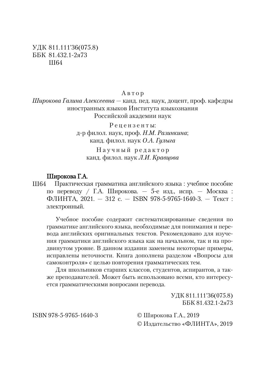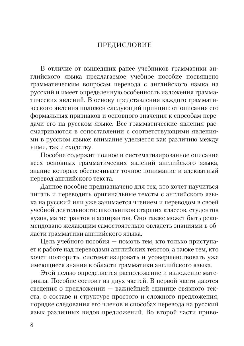 Учебное пособие содержит систематизированные сведения по грамматике английского языка, необходимые для понимания и перевода английских оригинальных текстов. Рекомендовано для изучения грамматики английского языка как на начальном, так и на продвинутом уровне. В данном издании заменены некоторые примеры, исправлены неточности. Книга дополнена разделом «Вопросы для самоконтроля» с целью повторения грамматических тем.