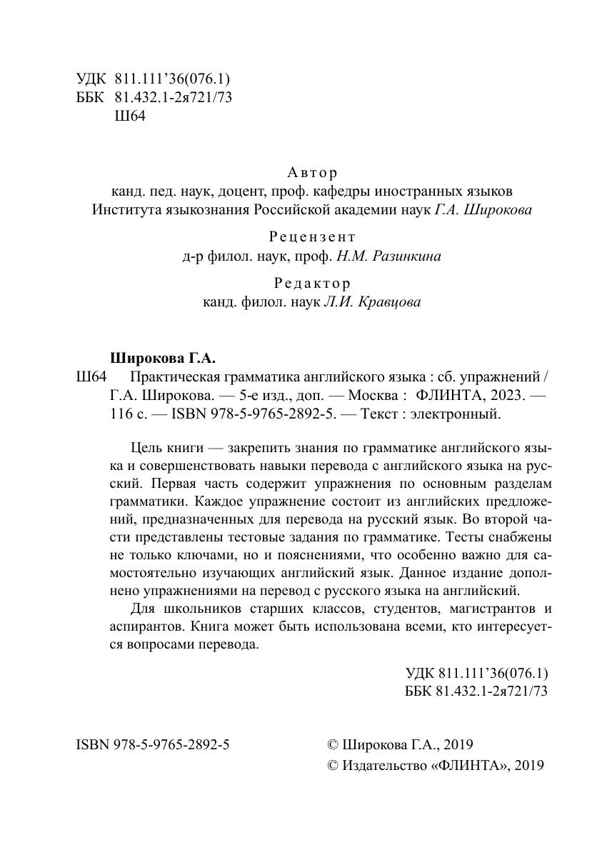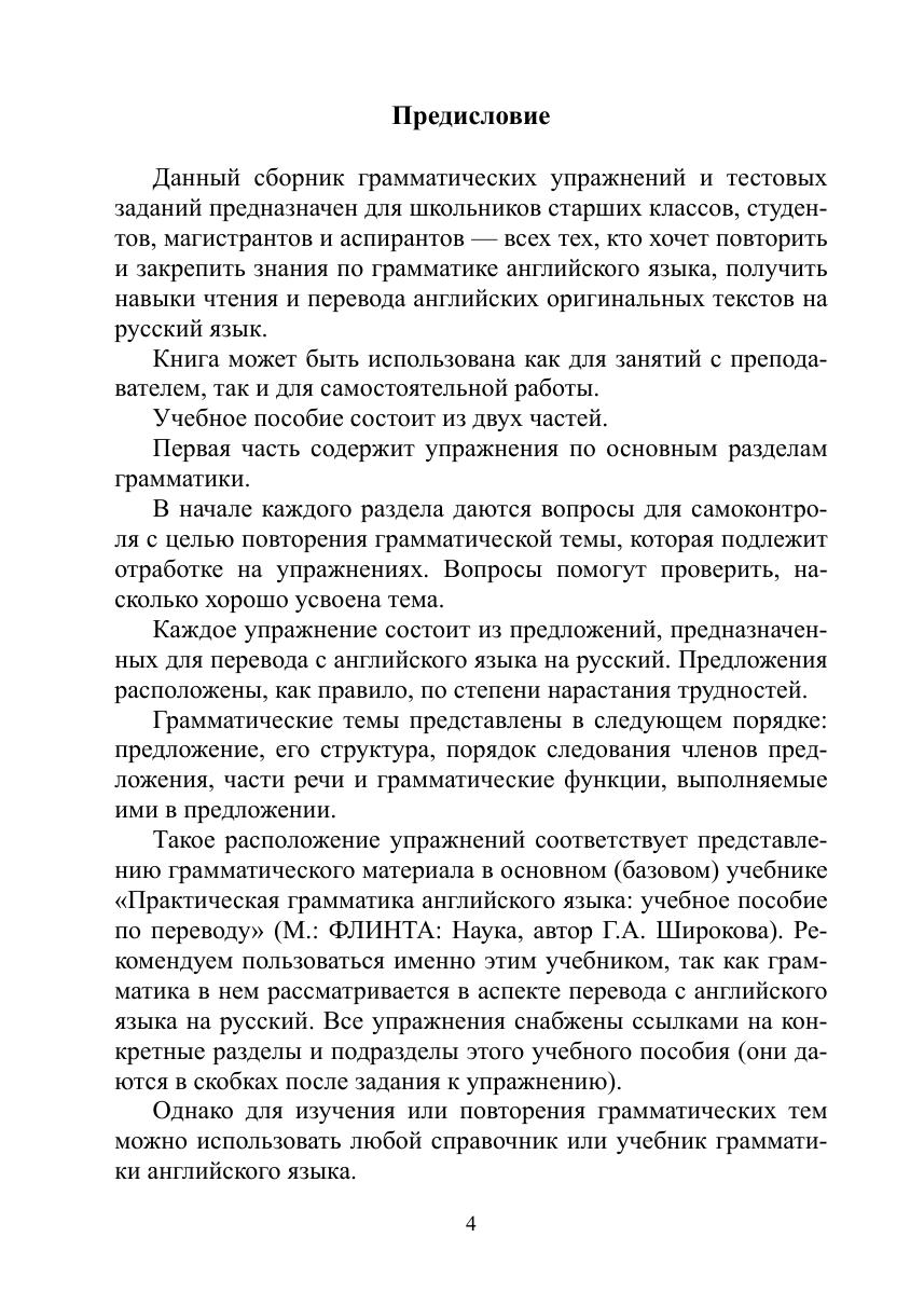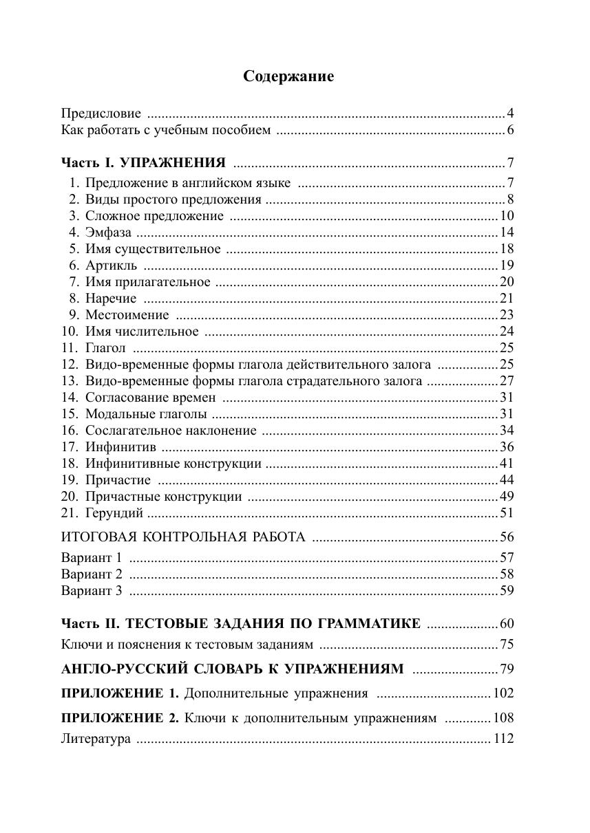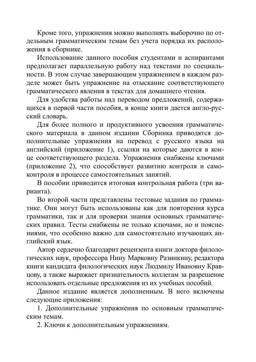 Цель книги — закрепить знания по грамматике английского языка и совершенствовать навыки перевода с английского языка на русский. Первая часть содержит упражнения по основным разделам грамматики. Каждое упражнение состоит из английских предложений, предназначенных для перевода на русский язык. Во второй части представлены тестовые задания по грамматике. Тесты снабжены не только ключами, но и пояснениями, что особенно важно для самостоятельно изучающих английский язык. Данное издание дополнено упражнениями на перевод с русского языка на английский.