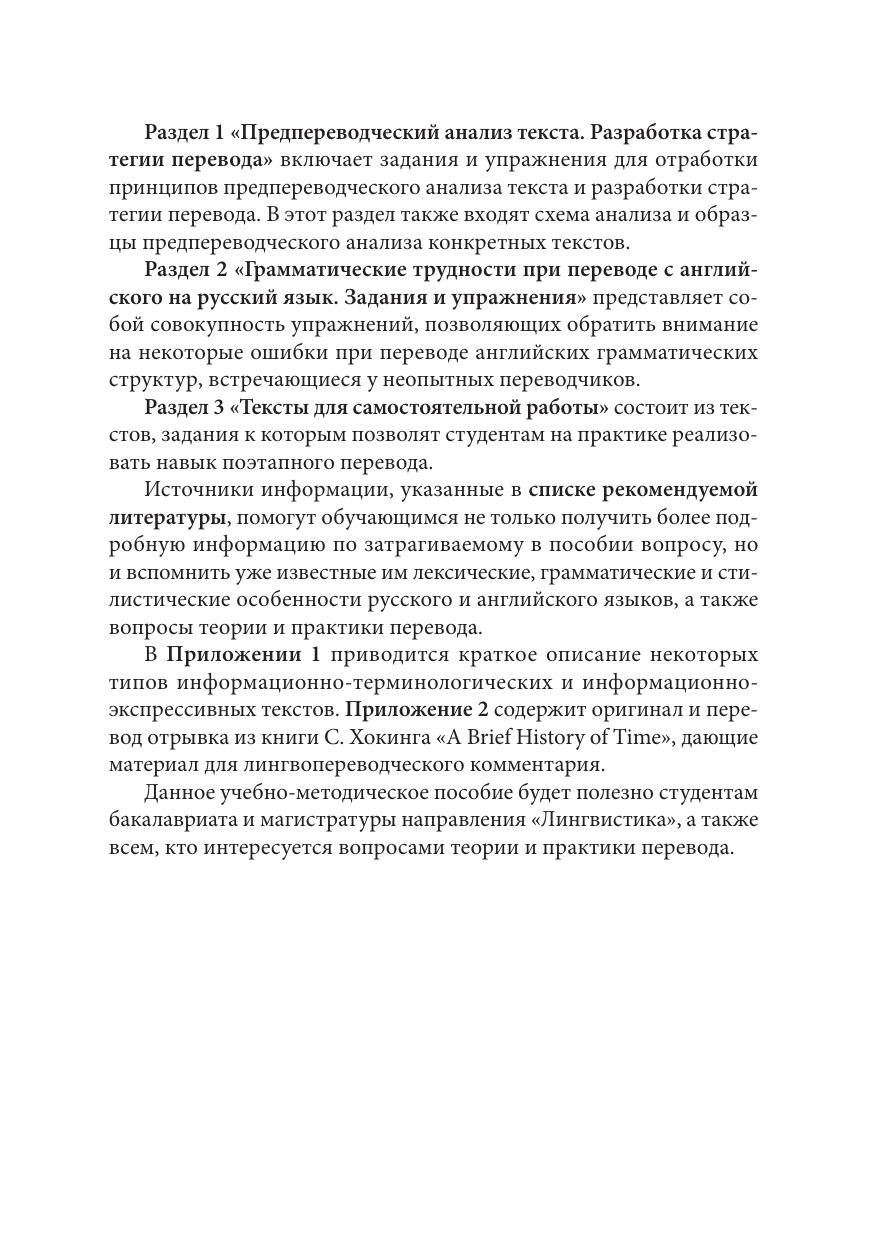 Учебно-методическое пособие посвящено отработке практических навыков предпереводческого анализа текста, разработке стратегии перевода и передачи грамматических особенностей английского языка при переводе на русский.