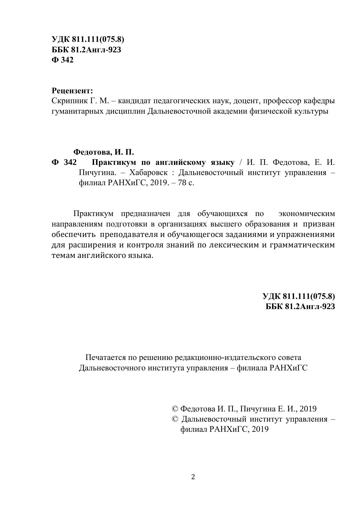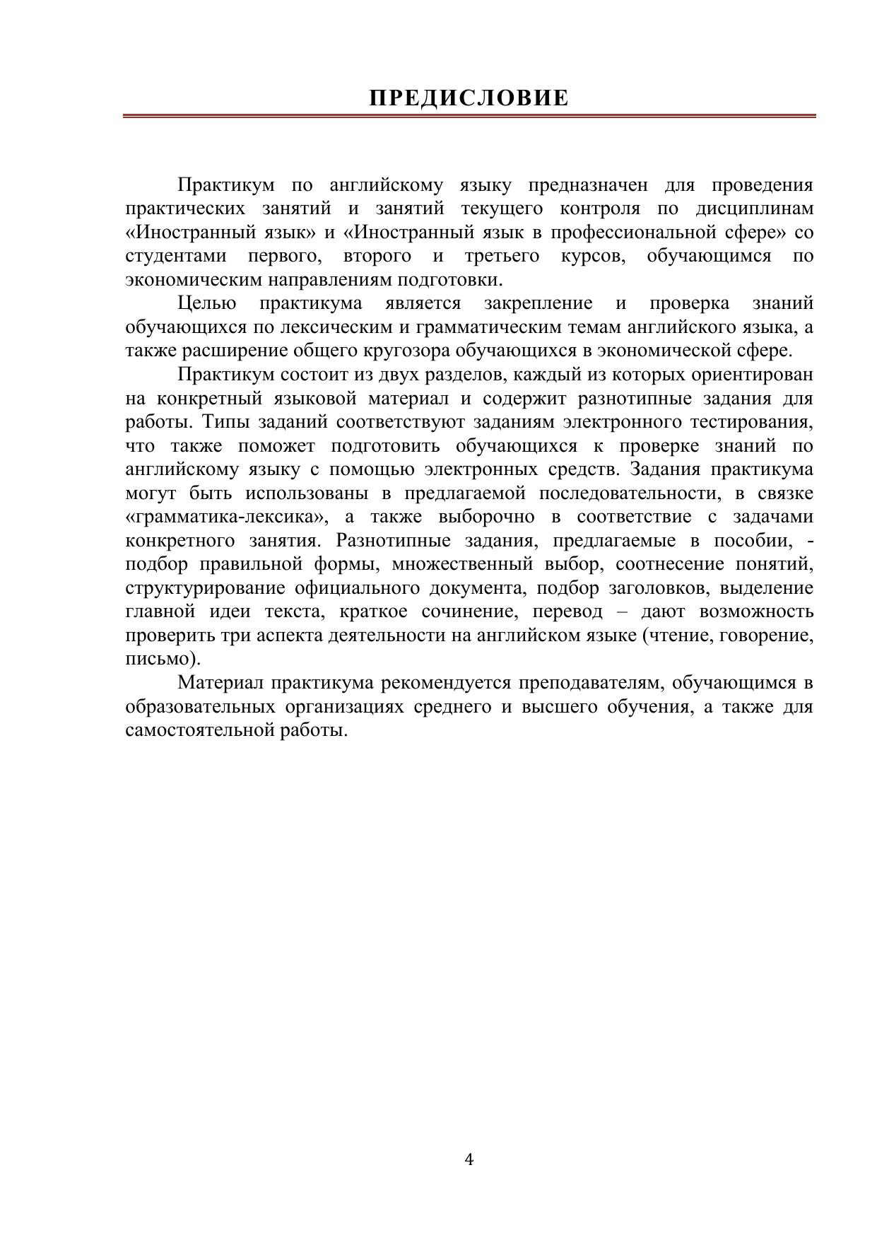 Практикум предназначен для обучающихся по экономическим направлениям подготовки в организациях высшего образования и призван обеспечить преподавателя и обучающегося заданиями и упражнениями для расширения и контроля знаний по лексическим и грамматическим темам английского языка.