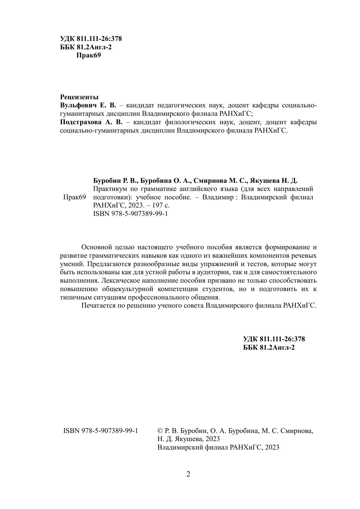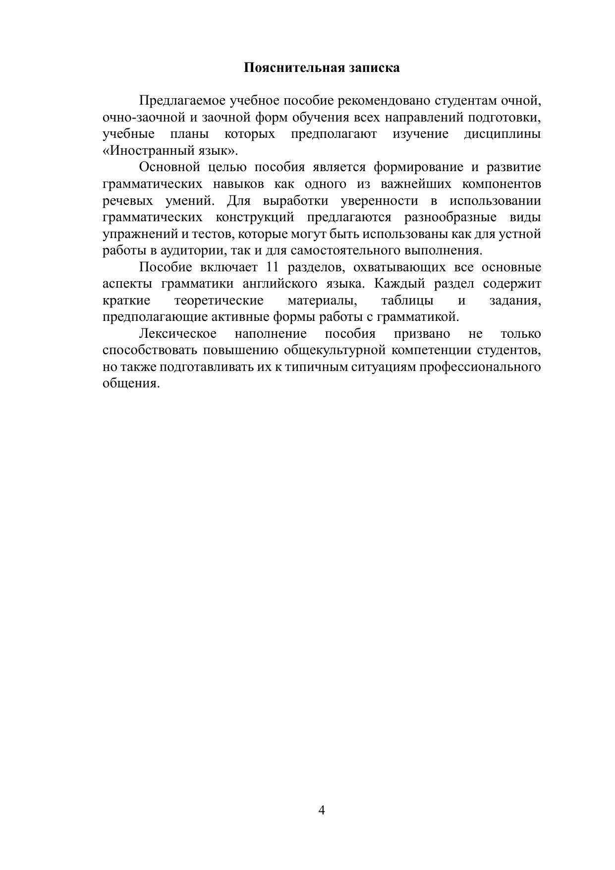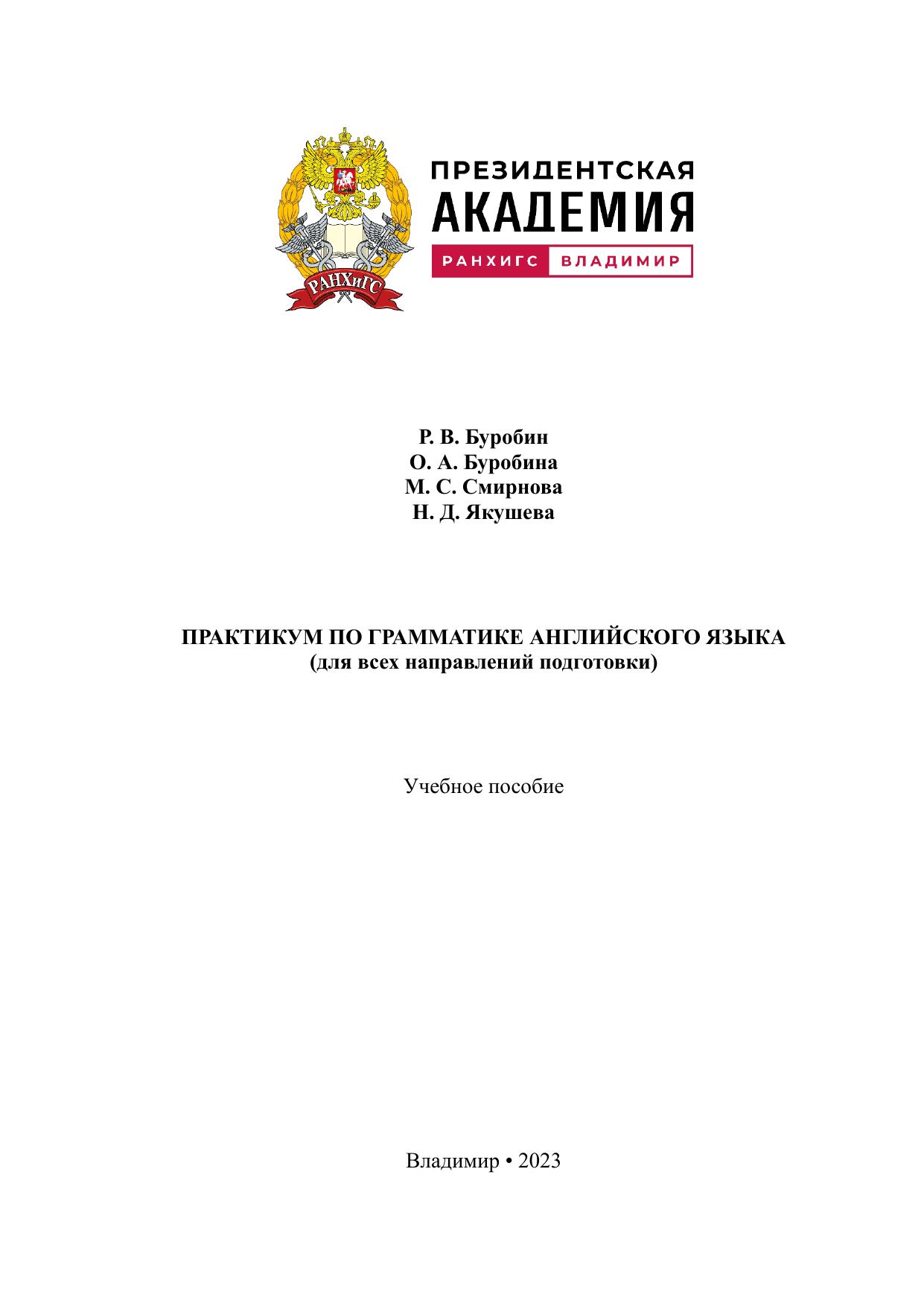 Основной целью настоящего учебного пособия является формирование и развитие грамматических навыков как одного из важнейших компонентов речевых умений. Предлагаются разнообразные виды упражнений и тестов, которые могут быть использованы как для устной работы в аудитории, так и для самостоятельного выполнения. Лексическое наполнение пособия призвано не только способствовать повышению общекультурной компетенции студентов, но и подготовить их к типичным ситуациям профессионального общения. Печатается по решению ученого совета Владимирского филиала РАНХиГС.