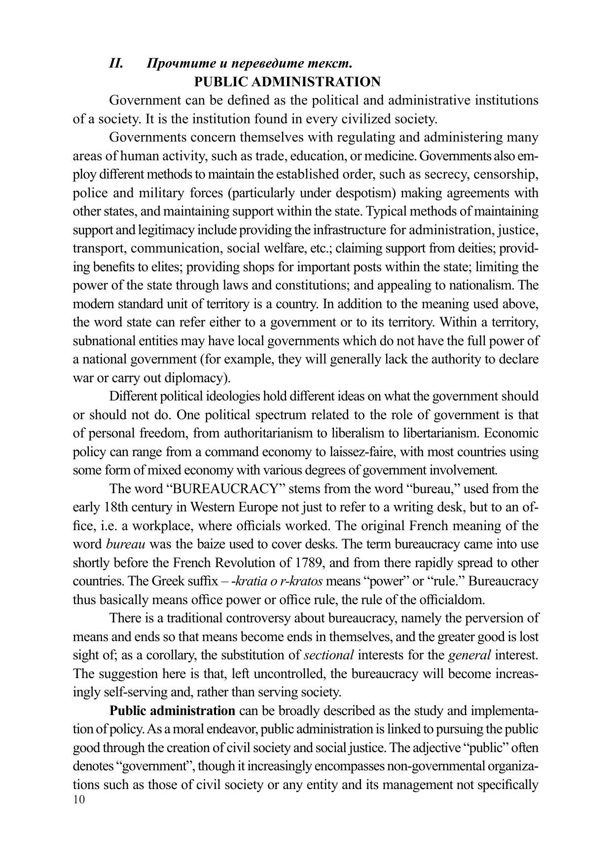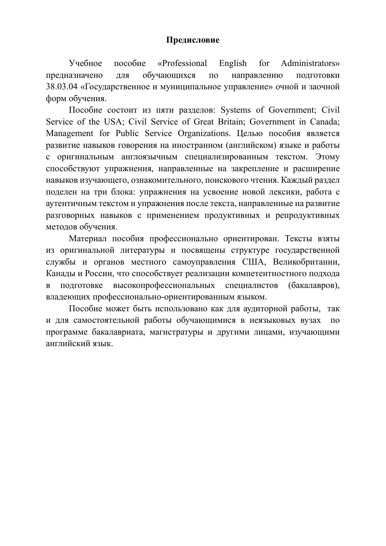 Учебное пособие «Professional English for Administrators» предназначено для обучающихся в неязыковых вузах по направлению подготовки 38.03.04 Государственное и муниципальное управление. Цель пособия – развитие навыков говорения на иностранном (английском) языке и работы с оригинальным англоязычным специализированным текстом. Пособие может быть использовано для проведения занятий в интерактивной форме в рамках контактной и самостоятельной работы обучающихся.