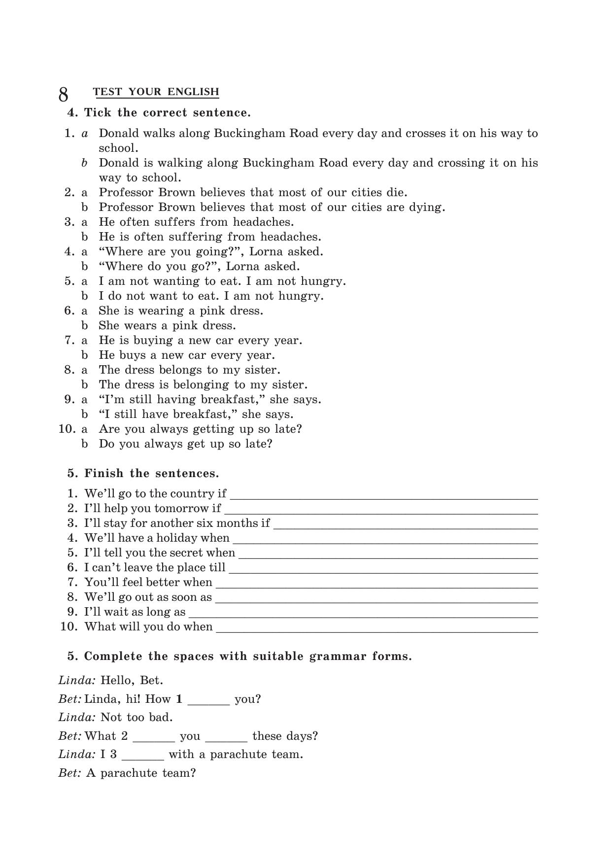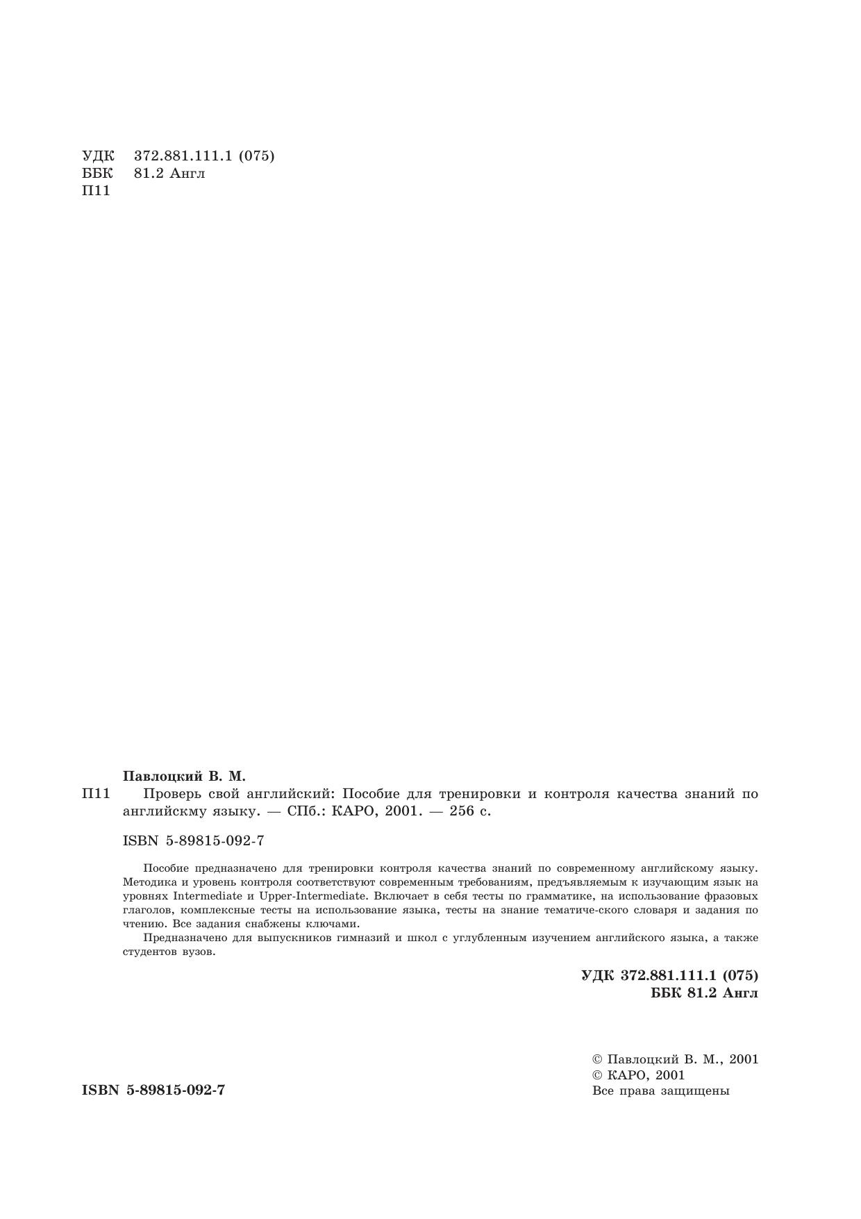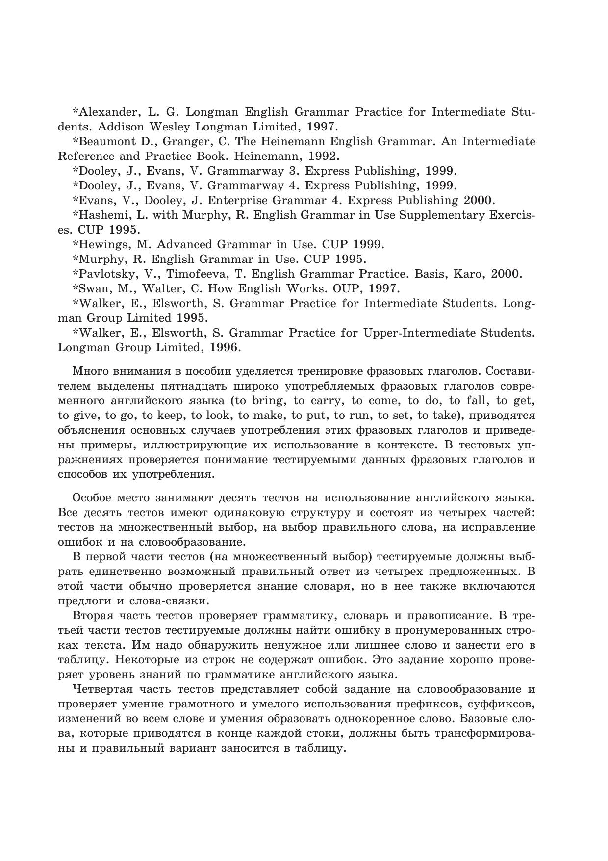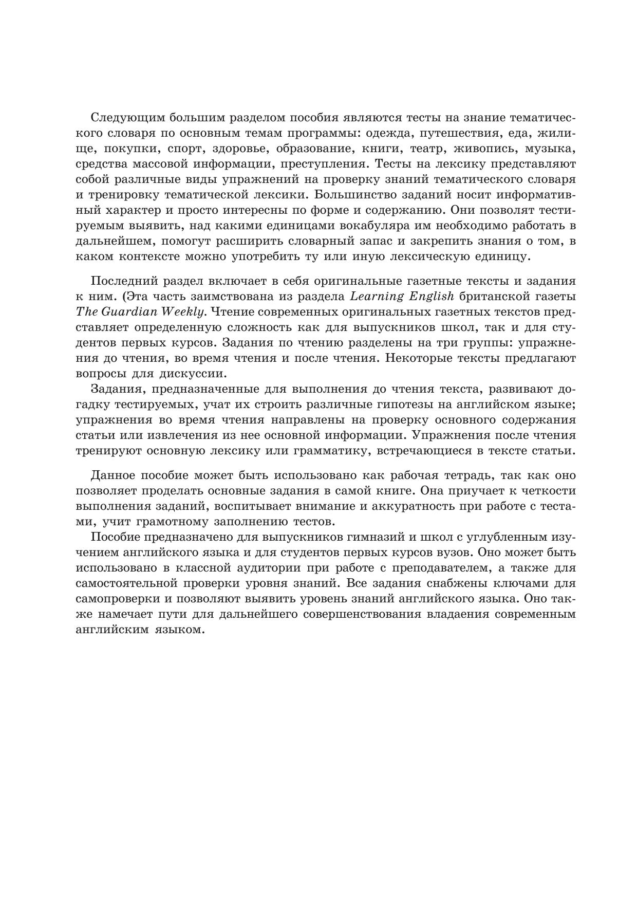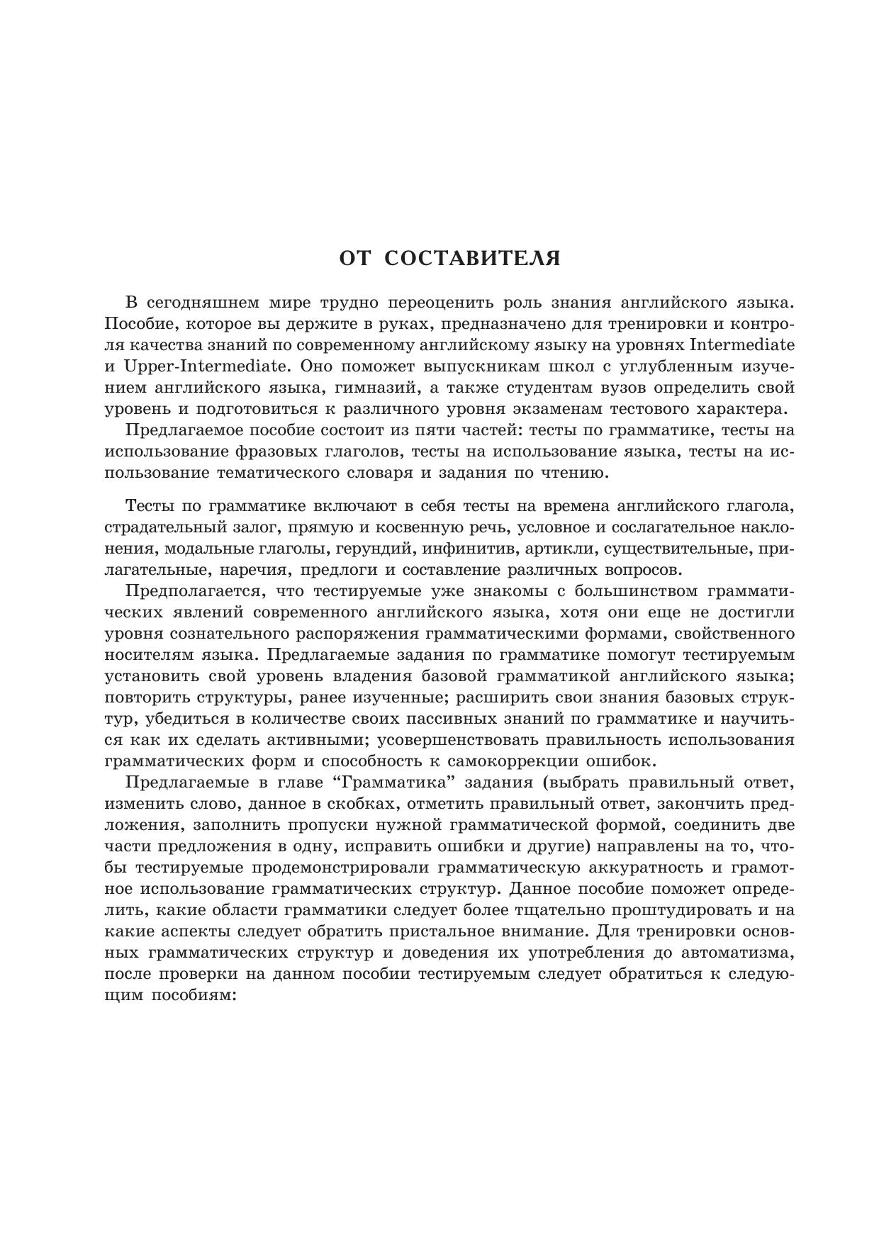 Пособие предназначено для тренировки контроля качества знаний по современному английскому языку. Методика и уровень контроля соответствуют современным требованиям, предъявляемым к изучающим язык на уровнях Intermediate и Upper-Intermediate. Включает в себя тесты по грамматике, на использование фразовых глаголов, комплексные тесты на использование языка, тесты на знание тематического словаря и задания по чтению. Все задания снабжены ключами.