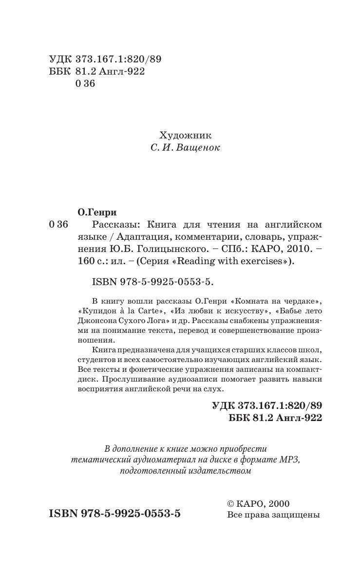 В книгу вошли рассказы О.Генри «Комната на чердаке», «Купидон a la Carte», «Из любви к искусству», «Бабье лето Джонсона Сухого Лога» и др. Рассказы снабжены упражнениями на понимание текста, перевод и совершенствование произношения.Книга предназначена для учащихся старших классов школ, студентов и всех самостоятельно изучающих английский язык. Все тексты и фонетические упражнения записаны на компакт-диск. Прослушивание аудиозаписи помогает развить навыки восприятия английской речи на слух.