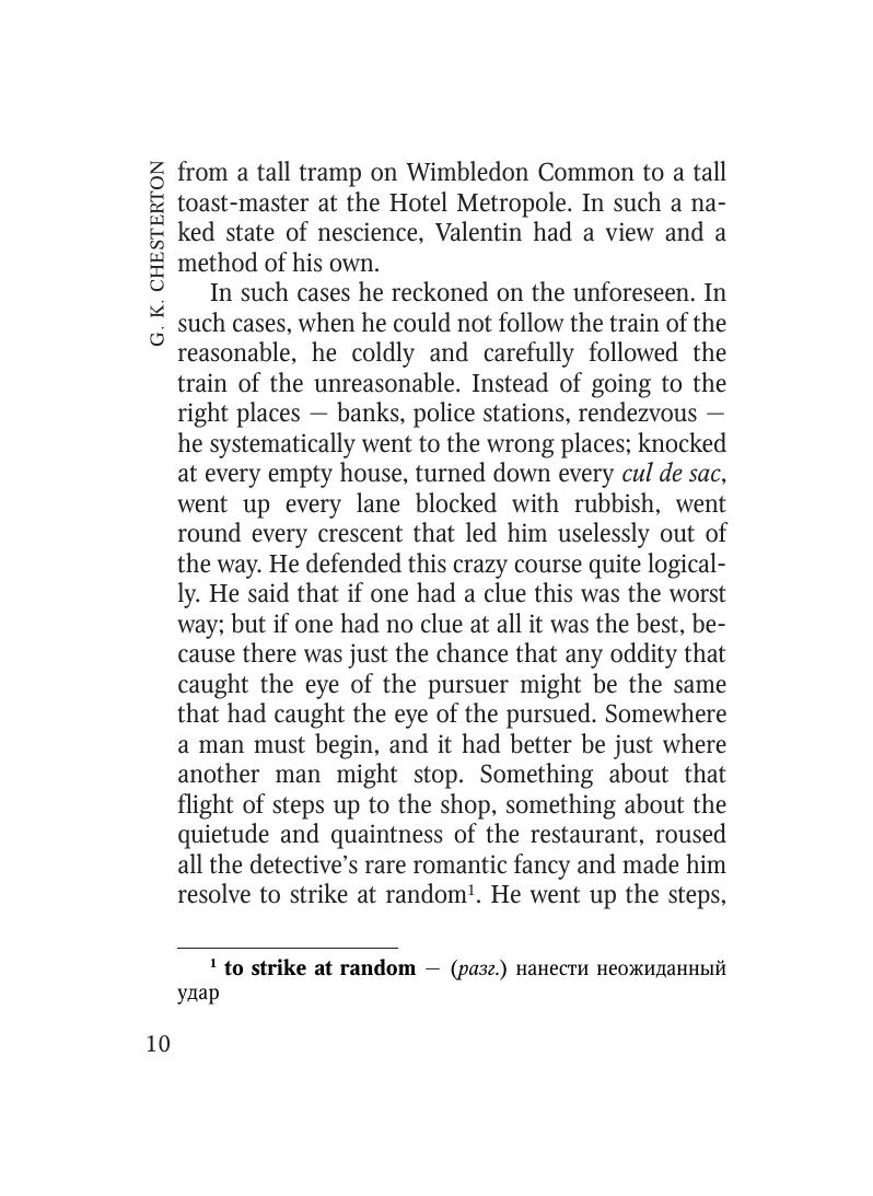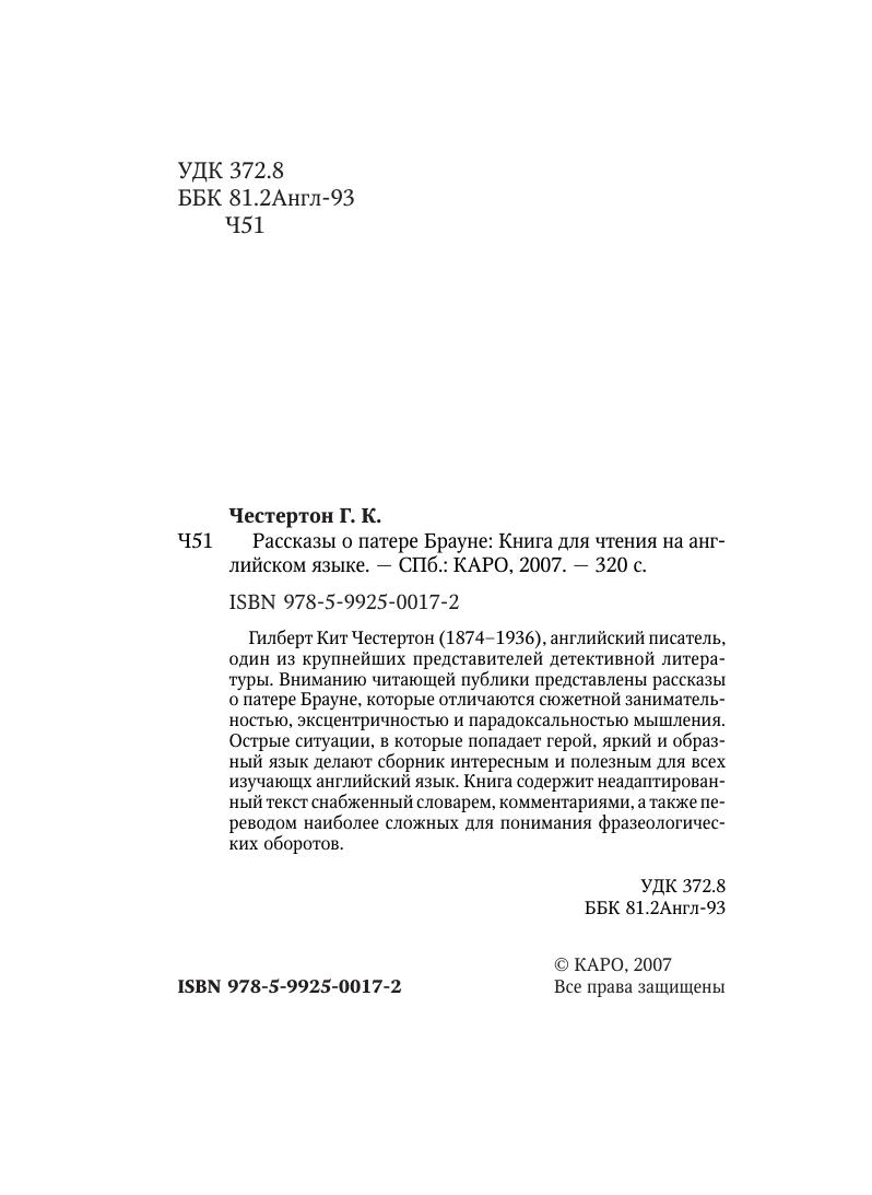 Гилберт Кит Честертон (1874–1936), английский писатель, один из крупнейших представителей детективной литературы. Вниманию читающей публики представлены рассказы о патере Брауне, которые отличаются сюжетной занимательностью, эксцентричностью и парадоксальностью мышления. Острые ситуации, в которые попадает герой, яркий и образный язык делают сборник интересным и полезным для всех изучающих английский язык. Книга содержит неадаптированный текст снабженный словарем, комментариями, а также переводом наиболее сложных для понимания фразеологических оборотов.