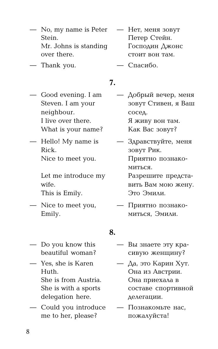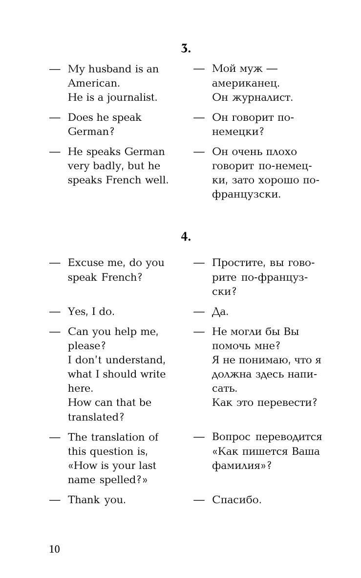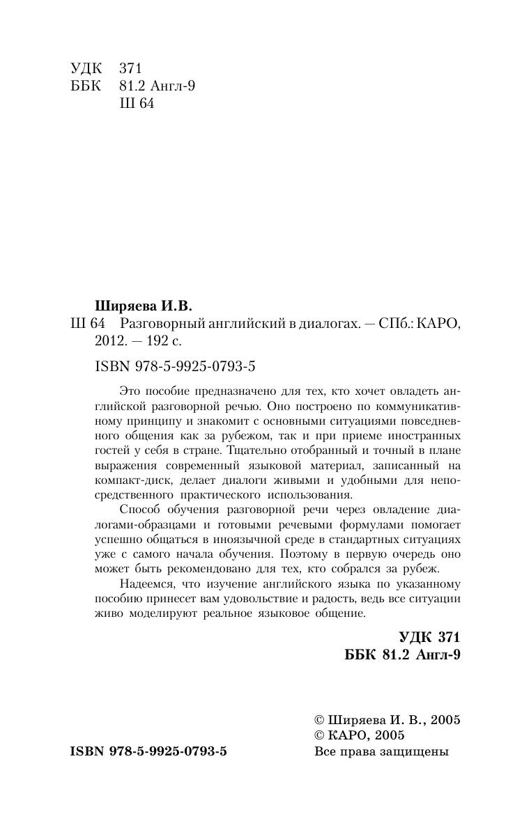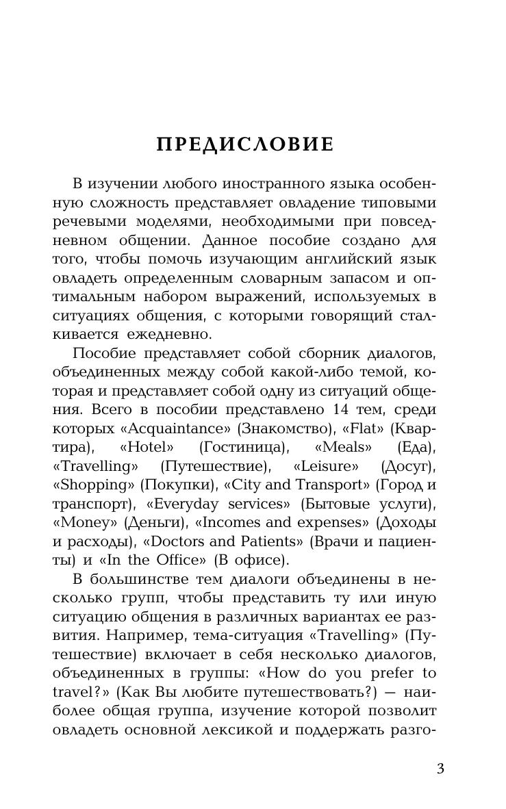 Это пособие предназначено для тех, кто хочет овладеть английской разговорной речью. Оно построено по коммуникативному принципу и знакомит с основными ситуациями повседневного общения как за рубежом, так и при приеме иностранных гостей у себя в стране. Тщательно отобранный и точный в плане выражения современный языковой материал, записанный на компакт-диск, делает диалоги живыми и удобными для непосредственного практического использования.Способ обучения разговорной речи через овладение диалогами-образцами и готовыми речевыми формулами помогает успешно общаться в иноязычной среде в стандартных ситуациях уже с самого начала обучения. Поэтому в первую очередь оно может быть рекомендовано для тех, кто собрался за рубеж. Надеемся, что изучение английского языка по указанному пособию принесет вам удовольствие и радость, ведь все ситуации живо моделируют реальное языковое общение.