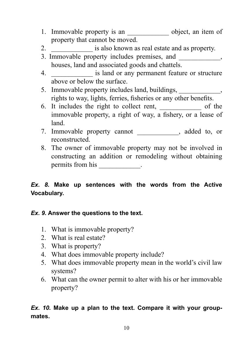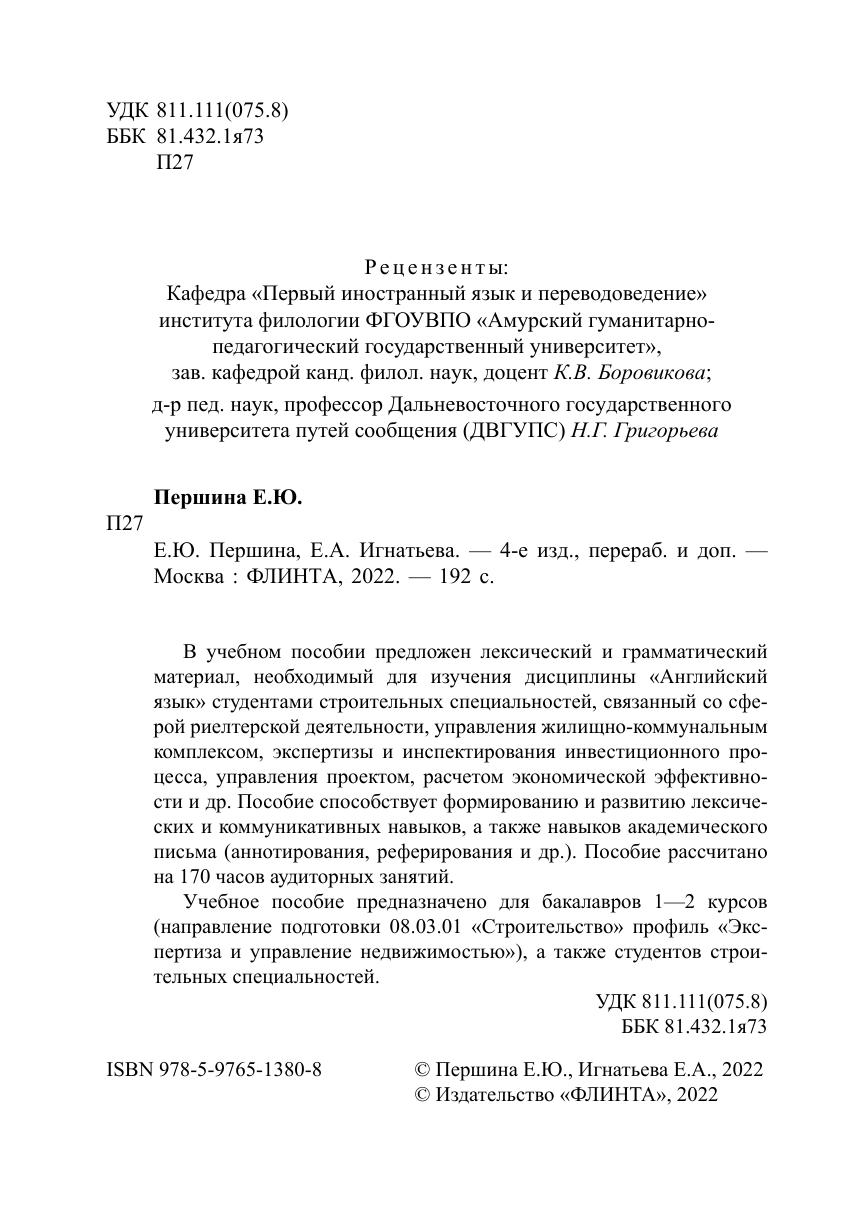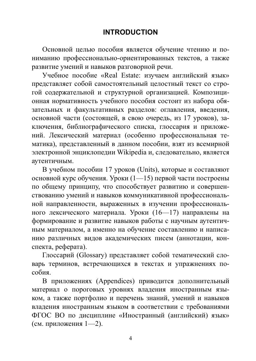 В учебном пособии предложен лексический и грамматический материал, необходимый для изучения дисциплины «Английский язык» студентами строительных специальностей, связанный со сферой риелтерской деятельности, управления жилищно-коммунальным комплексом, экспертизы и инспектирования инвестиционного процесса, управления проектом, расчетом экономической эффективности и др. Пособие способствует формированию и развитию лексиче-ских и коммуникативных навыков, а также навыков академического письма (аннотирования, реферирования и др.). Пособие рассчитано на 170 часов аудиторных занятий.