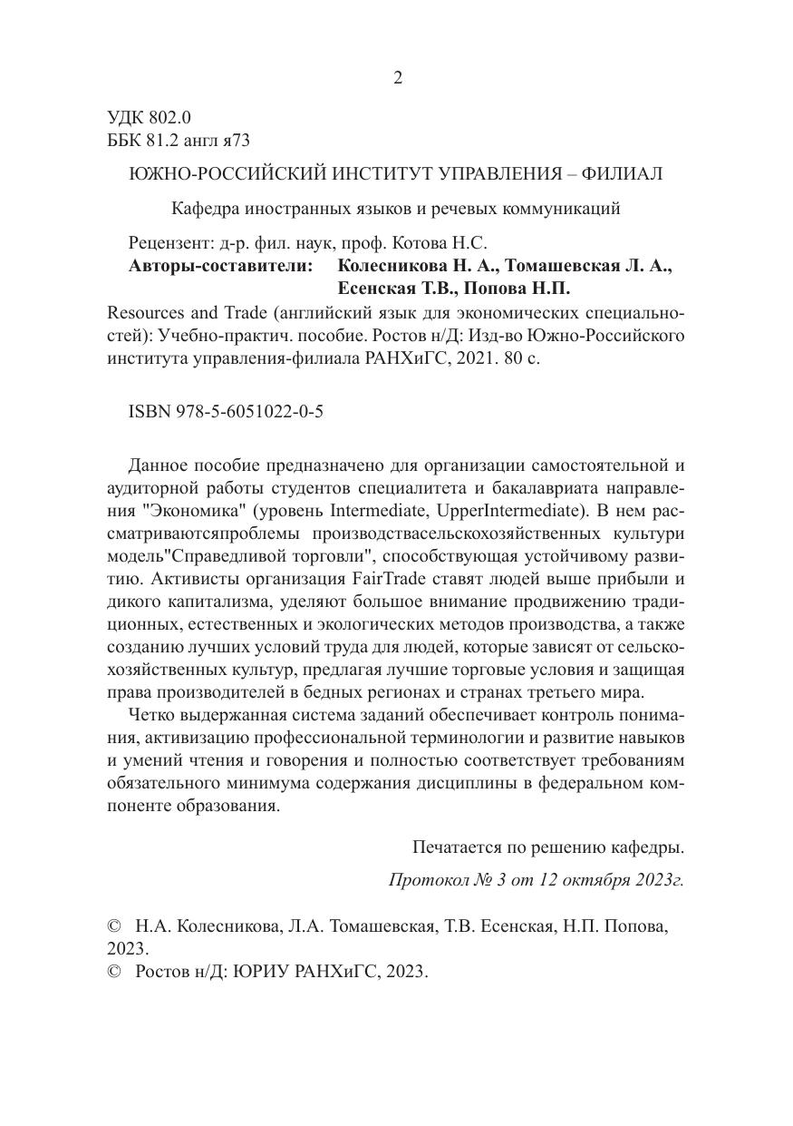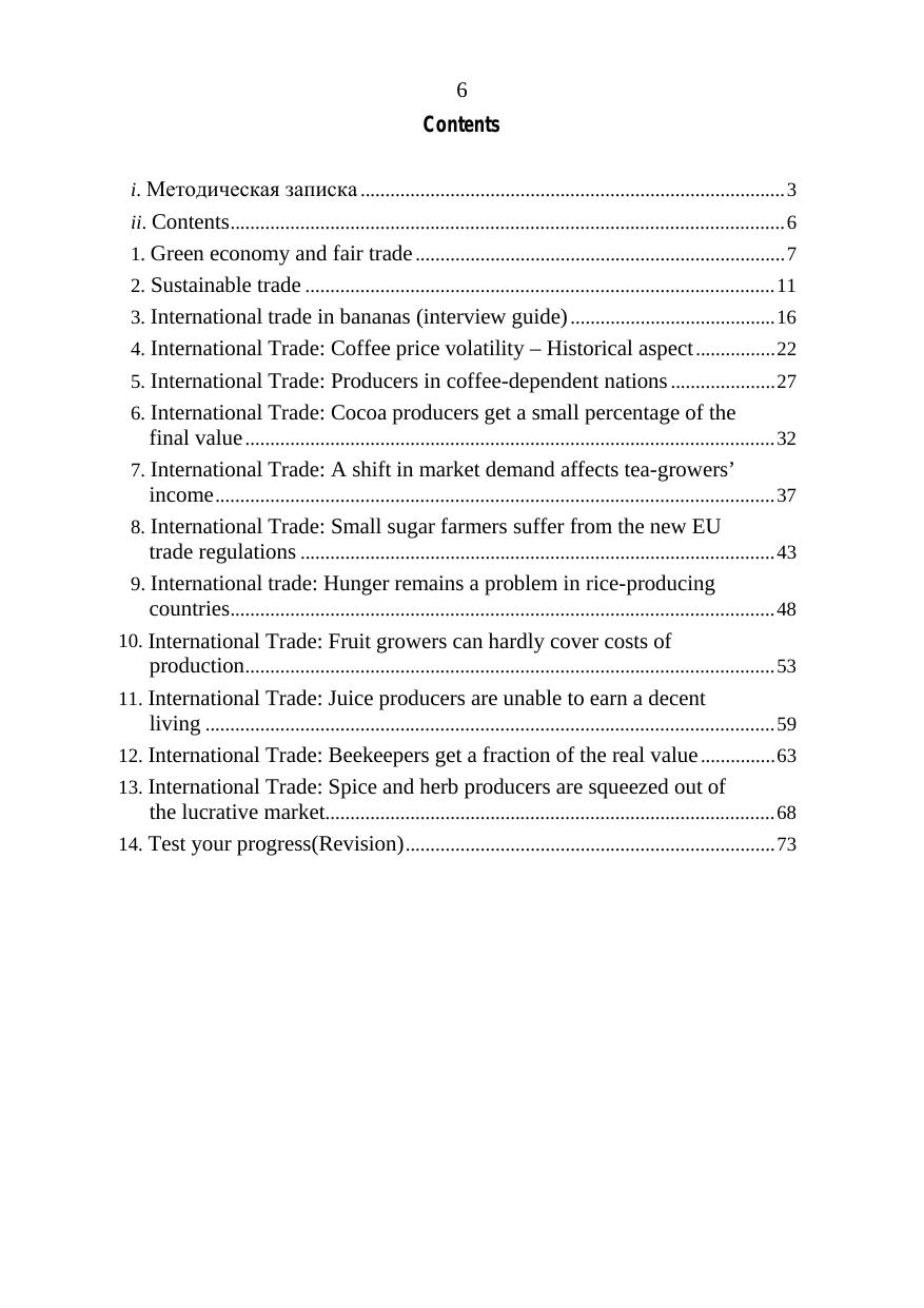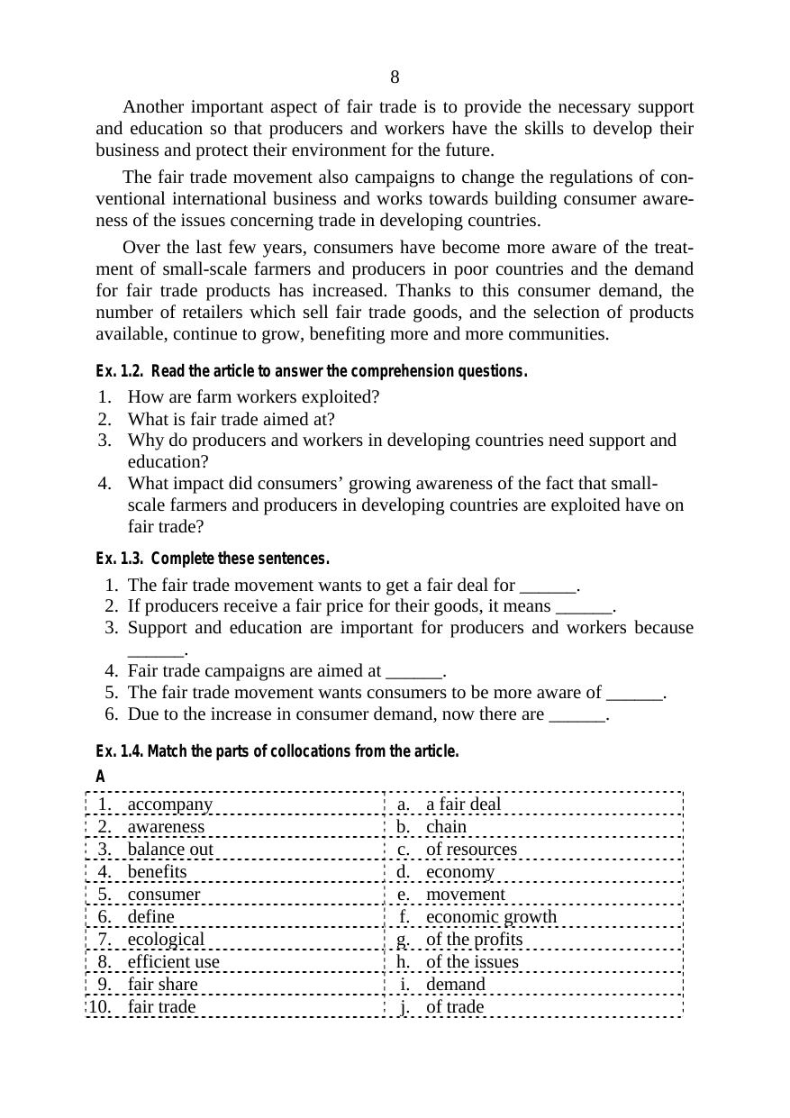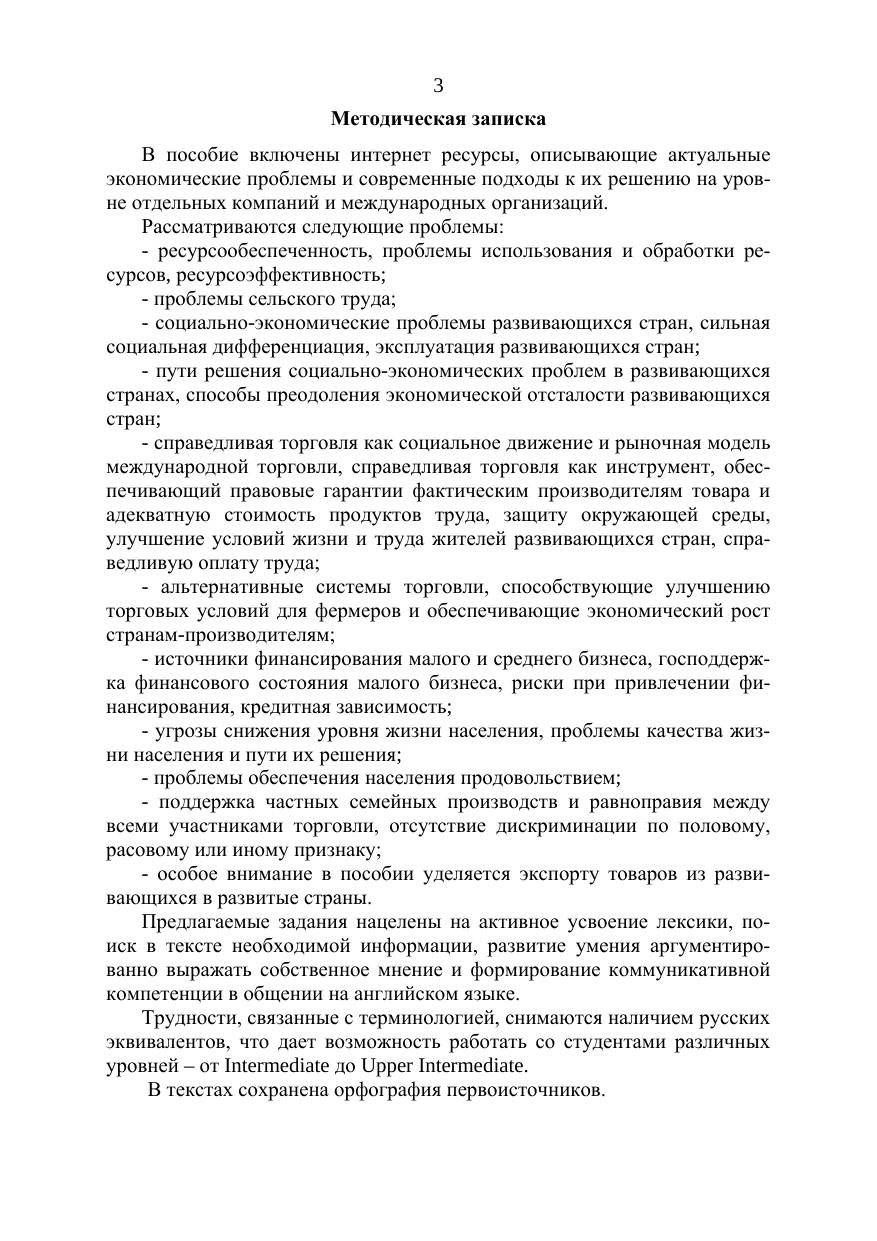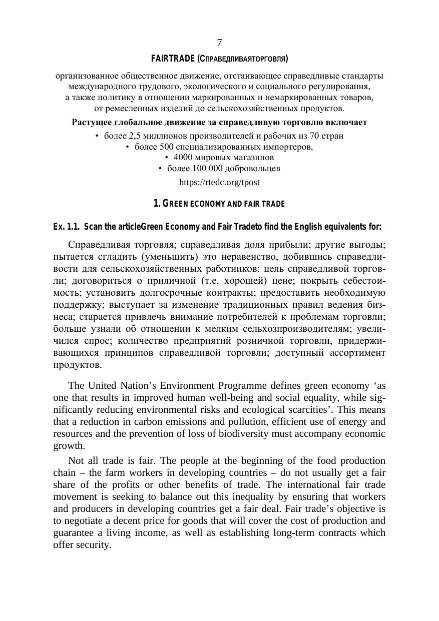 Данное пособие предназначено для организации самостоятельной и аудиторной работы студентов специалитета и бакалавриата направления "Экономика" (уровень Intermediate, UpperIntermediate). В нем рассматриваютсяпроблемы производствасельскохозяйственных культури модель"Справедливой торговли", способствующая устойчивому развитию. Активисты организация FairTrade ставят людей выше прибыли и дикого капитализма, уделяют большое внимание продвижению традиционных, естественных и экологических методов производства, а также созданию лучших условий труда для людей, которые зависят от сельскохозяйственных культур, предлагая лучшие торговые условия и защищая права производителей в бедных регионах и странах третьего мира. Четко выдержанная система заданий обеспечивает контроль понимания, активизацию профессиональной терминологии и развитие навыков и умений чтения и говорения и полностью соответствует требованиям обязательного минимума содержания дисциплины в федеральном компоненте образования