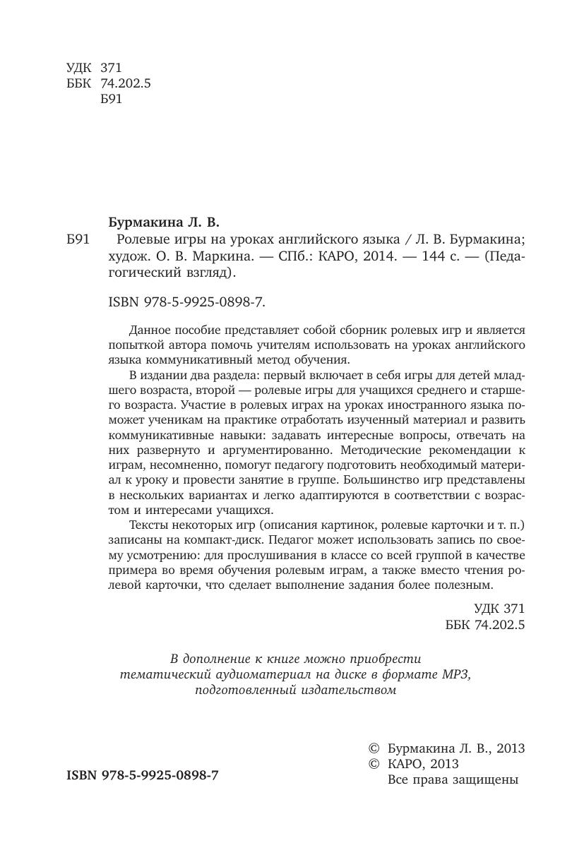 Тексты некоторых игр (описания картинок, ролевые карточки и т. п.) записаны на компакт-диск. Педагог может использовать запись по своему усмотрению: для прослушивания в классе со всей группой в качестве примера во время обучения ролевым играм, а также вместо чтения ролевой карточки, что сделает выполнение задания более полезным.