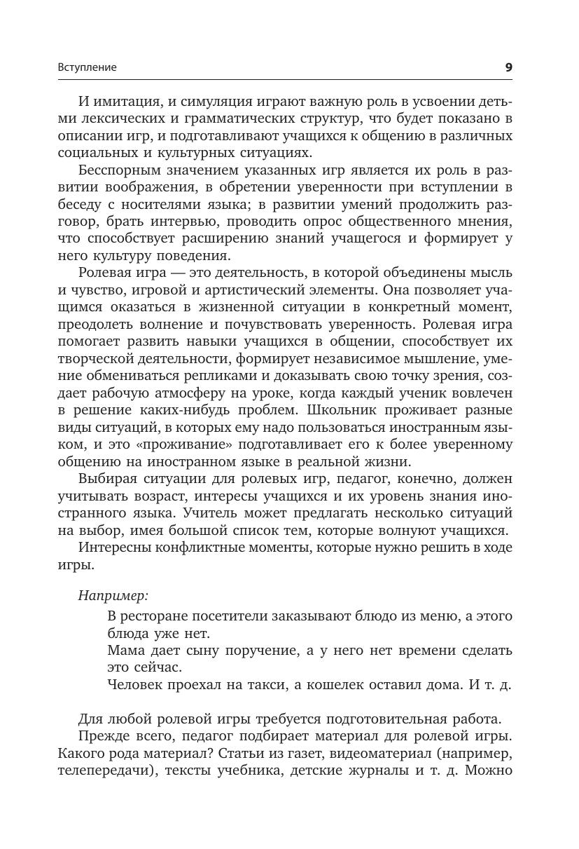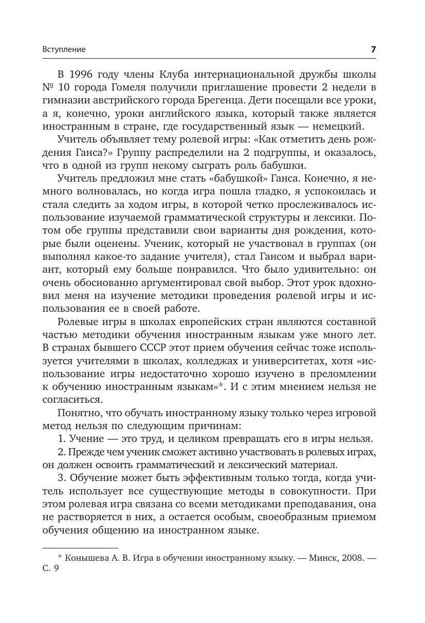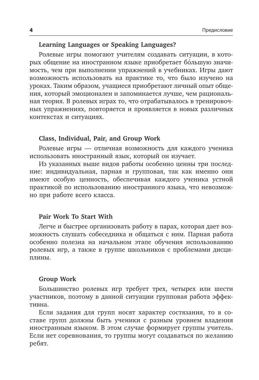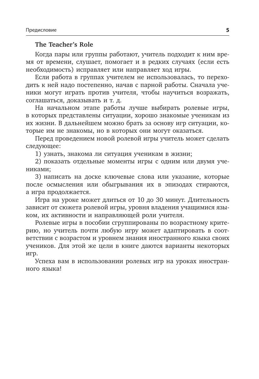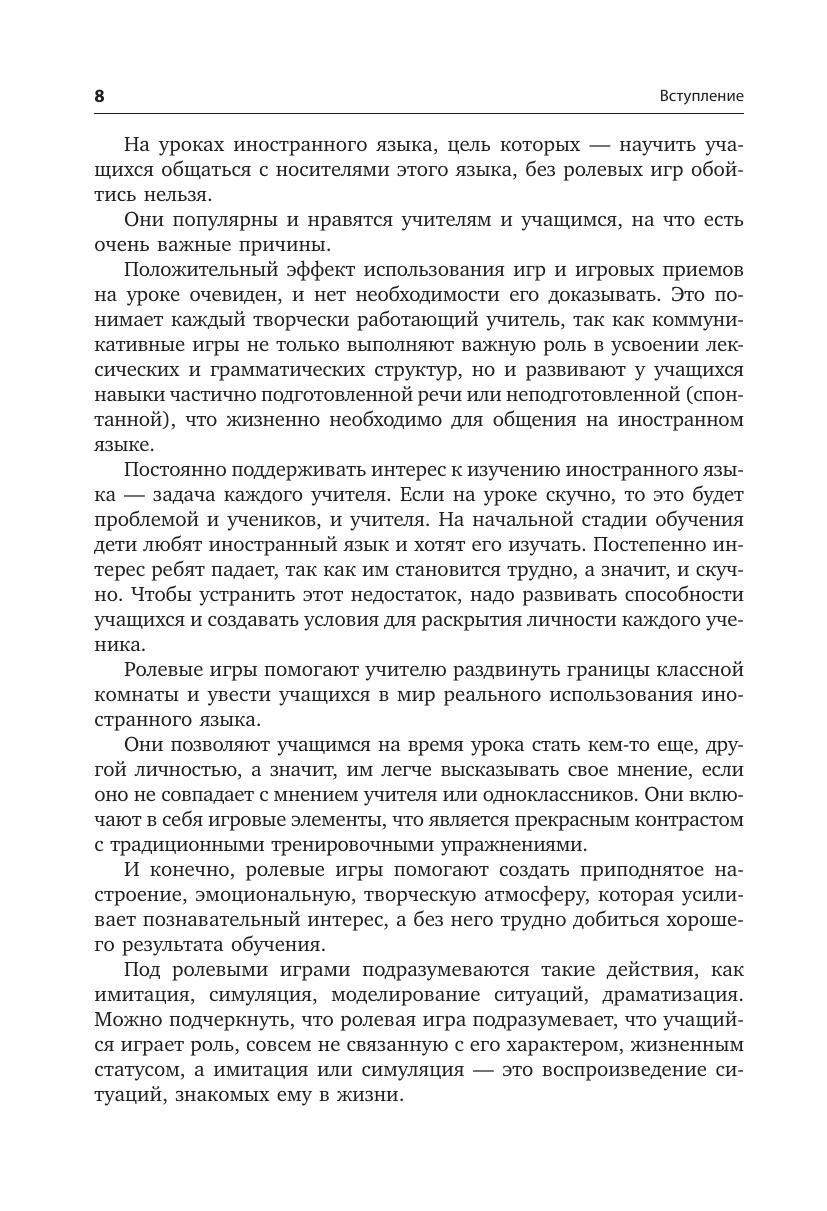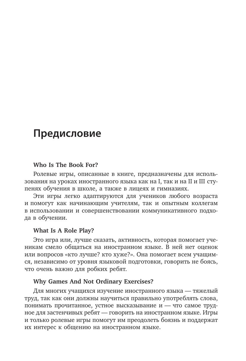 В издании два раздела: первый включает в себя игры для детей младшего возраста, второй — ролевые игры для учащихся среднего и старшего возраста. Участие в ролевых играх на уроках иностранного языка поможет ученикам на практике отработать изученный материал и развить коммуникативные навыки: задавать интересные вопросы, отвечать на них развернуто и аргументированно. Методические рекомендации к играм, несомненно, помогут педагогу подготовить необходимый материал к уроку и провести занятие в группе. Большинство игр представлены в нескольких вариантах и легко адаптируются в соответствии с возрастом и интересами учащихся.