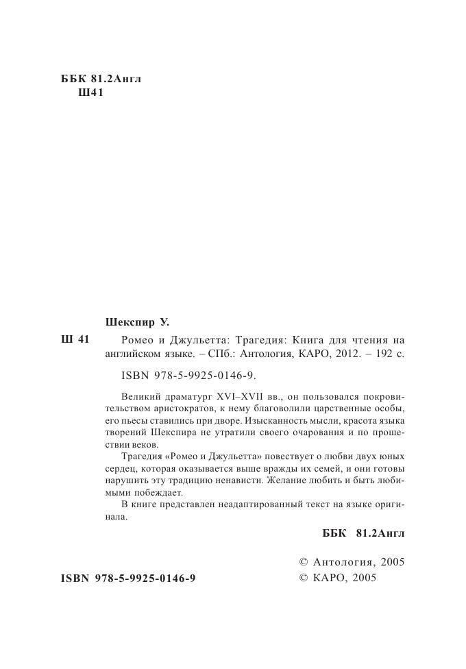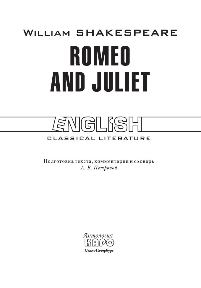 Великий драматург XVI–XVII вв., он пользовался покровительством аристократов, к нему благоволили царственные особы, его пьесы ставились при дворе. Изысканность мысли, красота языка творений Шекспира не утратили своего очарования и по прошествии веков.Трагедия «Ромео и Джульетта» повествует о любви двух юных сердец, которая оказывается выше вражды их семей, и они готовы нарушить эту традицию ненависти. Желание любить и быть любимыми побеждает. В книге представлен неадаптированный текст на языке оригинала.