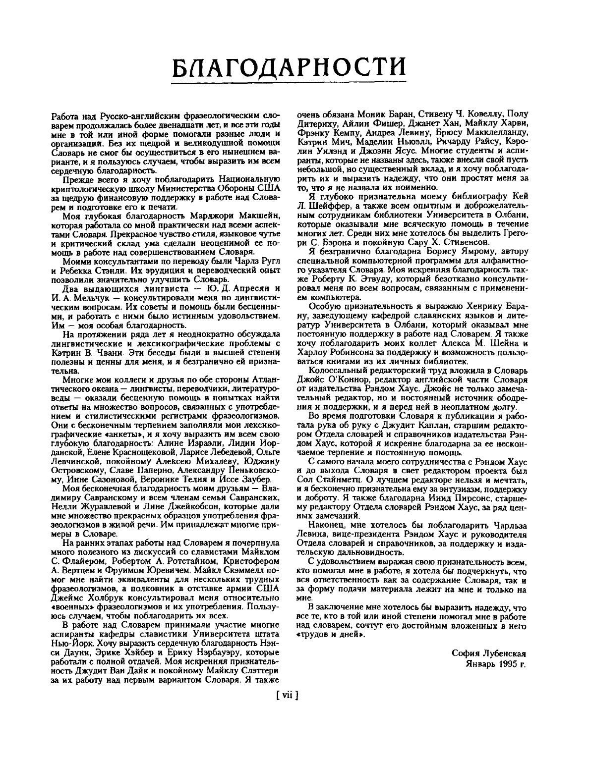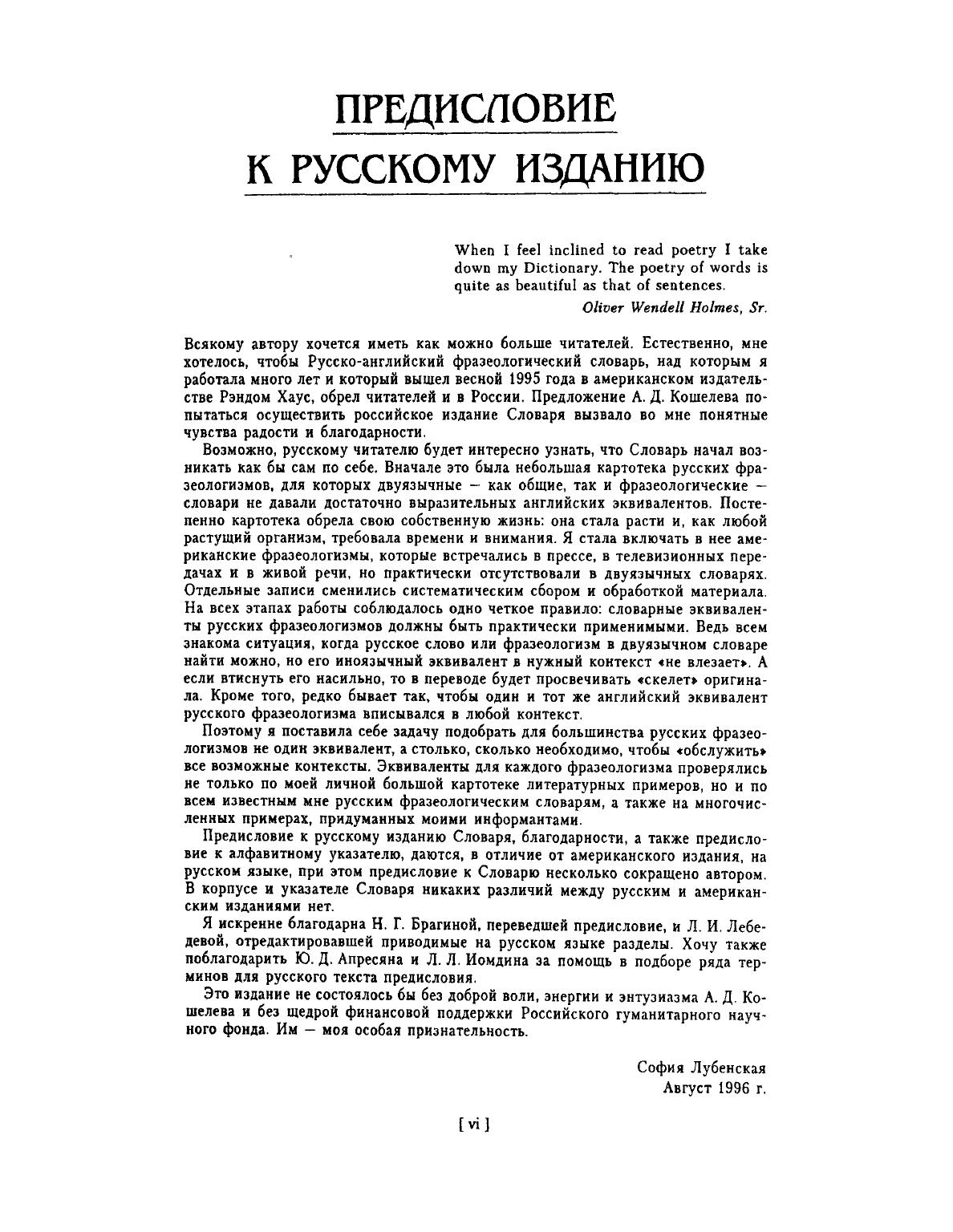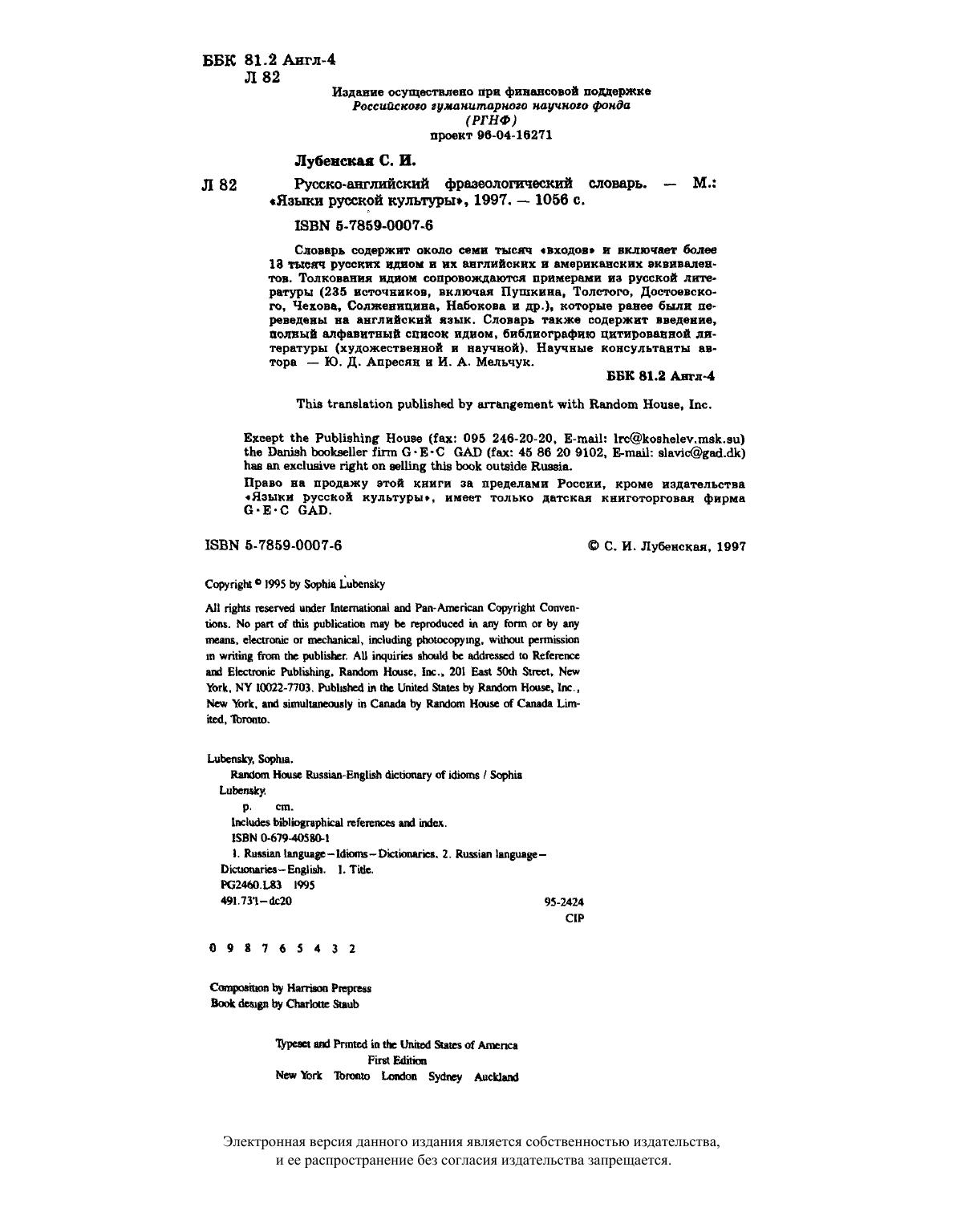 Словарь содержит около семи тысяч "входов" и включает более 13 тысяч русских идиом и их английских и американских эквивалентов. Толкования идиом сопровождаются примерами из русской литературы (235 источников, включая Пушкина, Толстого, Достоевского, Чехова, Солженицына, Набокова и др.), которые ранее были переведены на английский язык. Словарь также содержит введение, полный алфавитный список идиом, библиографию цитированной литературы (художественной и научной). Научные консультанты автора - Ю.Д. Апресян и И.А. Мельчук. Словарь предназначен для широкого круга читателей — для всех, кто изучает и преподает язык, для переводчиков и языковедов.