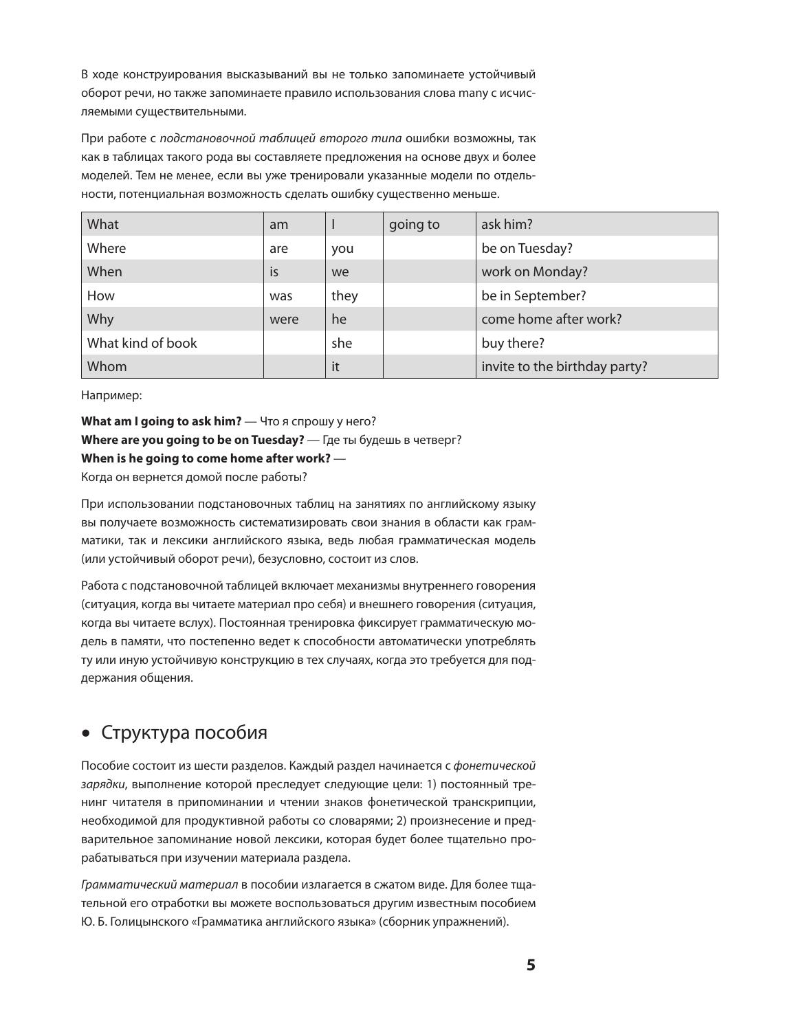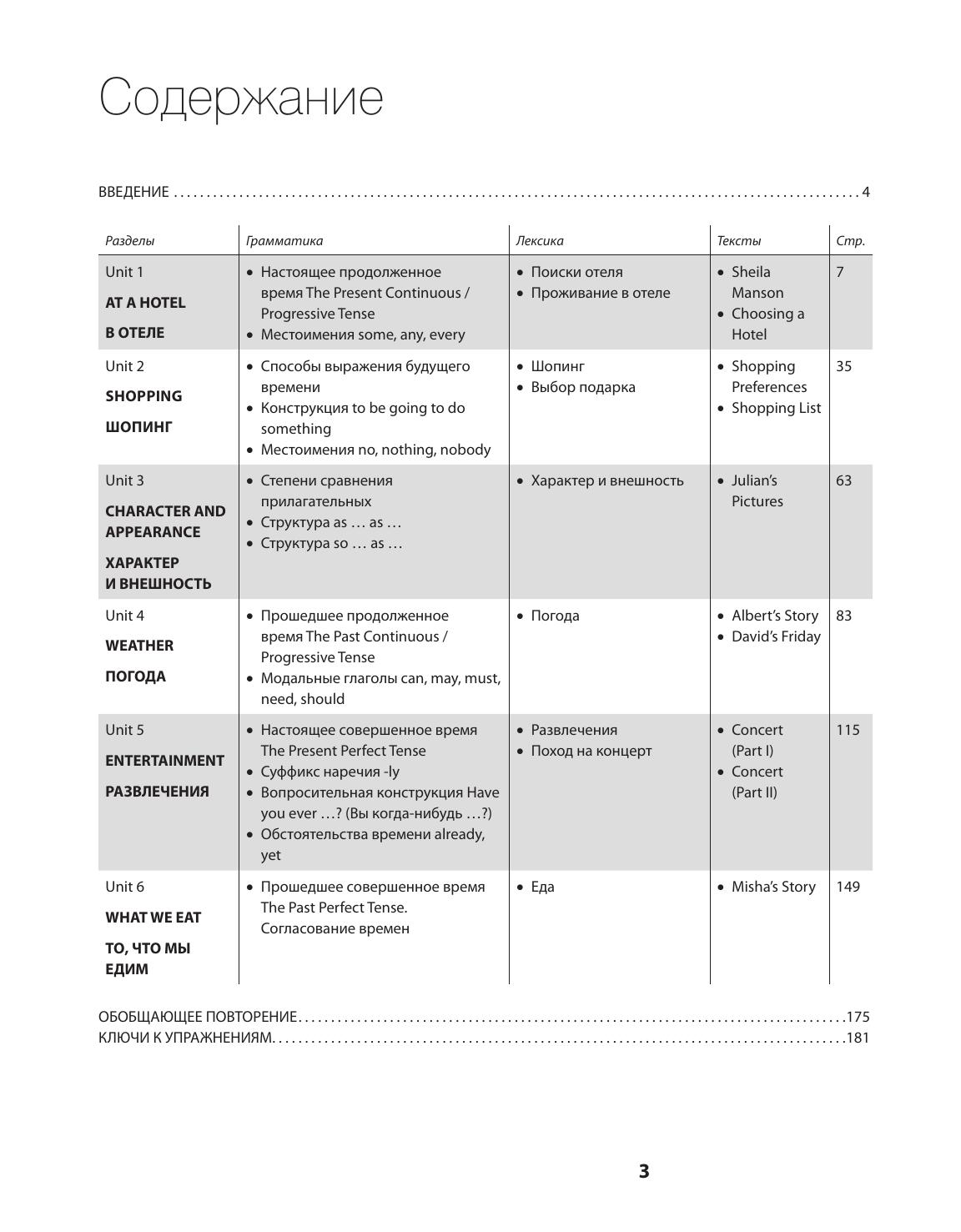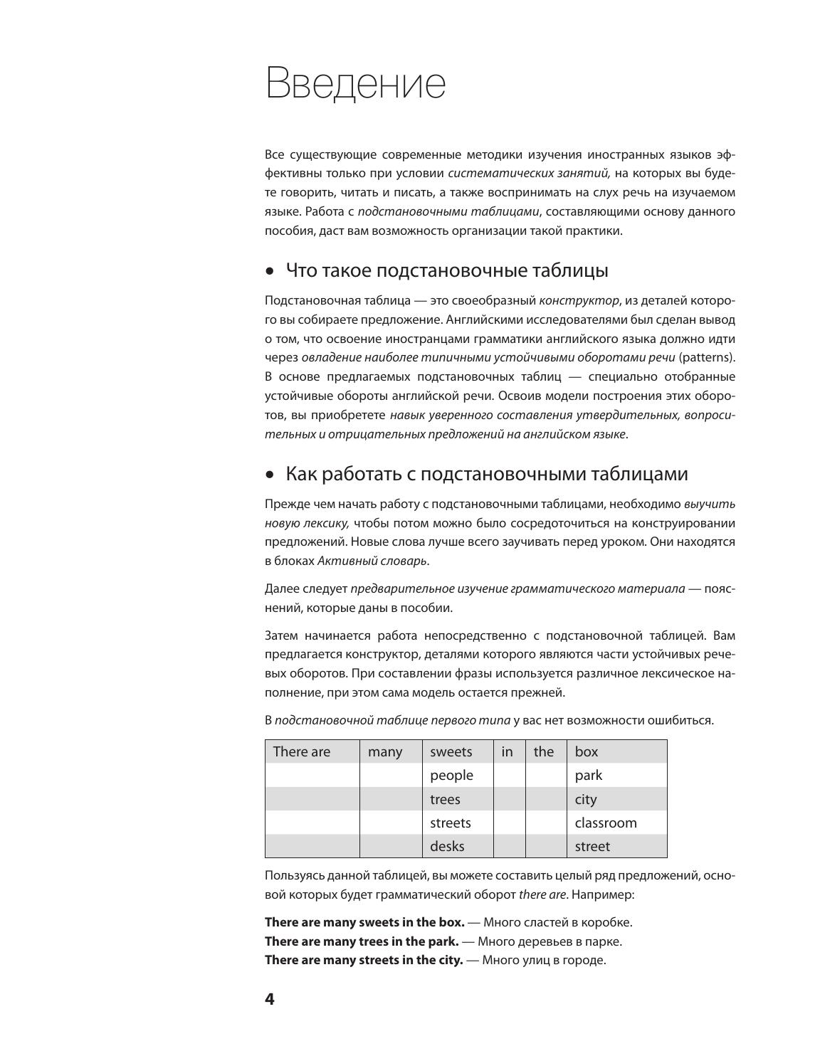 Предлагаемое учебное пособие представляет собой самоучитель английского языка для начинающих. Основная цель книги — помочь учащемуся овладеть навыком английской речи. Для этого используется методика подстановочных таблиц — своеобразного «конструктора», с помощью которого учащийся строит английские предложения на основе устойчивых речевых оборотов. Метод подстановочных таблиц является эффективным способом овладения английским языком для русскоговорящих учащихся. В шести разделах второй части самоучителя материал подается в системе и включает в себя грамматику (употребление времен present continuous, past continuous, present perfect, past perfect и согласование времен, способы выражения будущего времени, степени сравнения прилагательных, модальные глаголы и т. д.), лексику по темам, тексты, диалоги, упражнения на повторение изученного, а также задания для самопроверки. С помощью тренировочных упражнений и диска с аудиоматериалами, записанными носителями английского языка, учащийся сможет овладеть правильным английским произношением. Освоив материал самоучителя, учащийся достигнет уровня владения английским языком «Pre-Intermediate». Пособие адресовано всем, кто самостоятельно изучает английский язык.