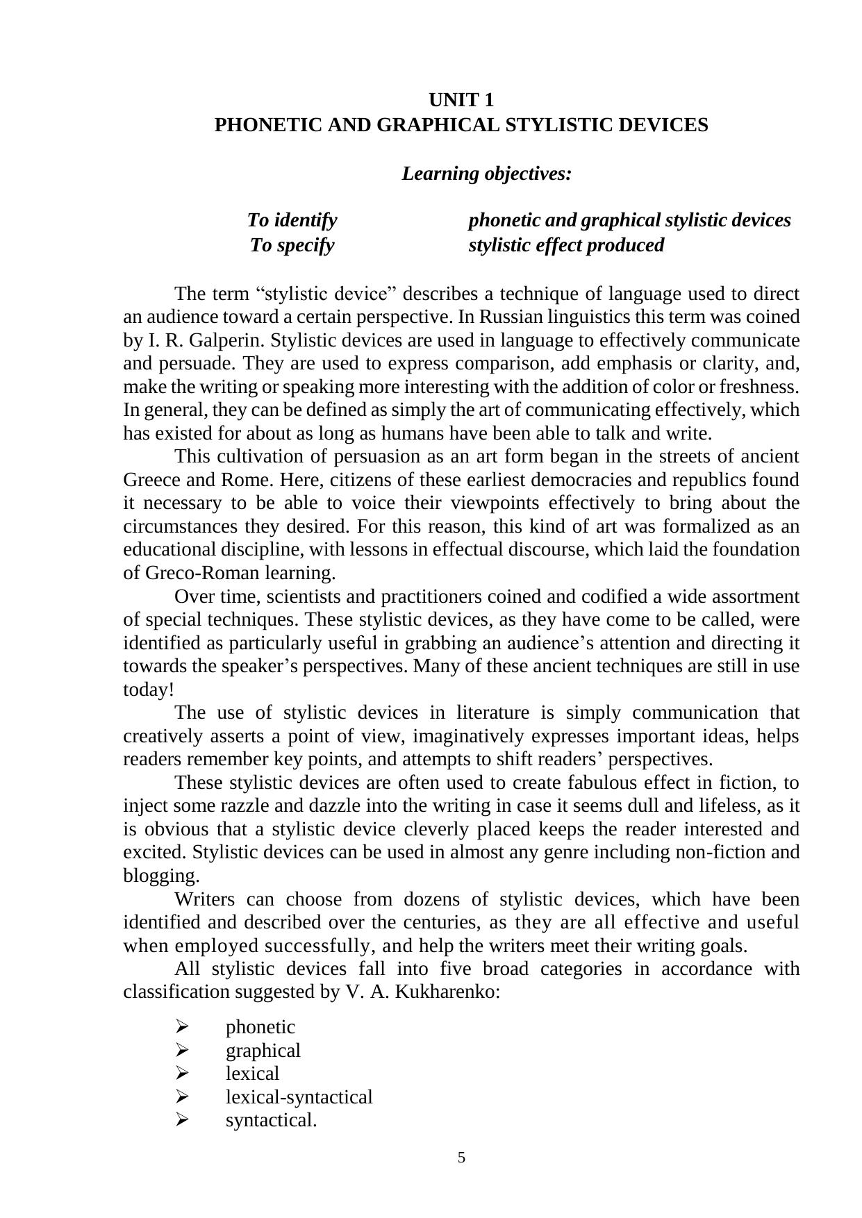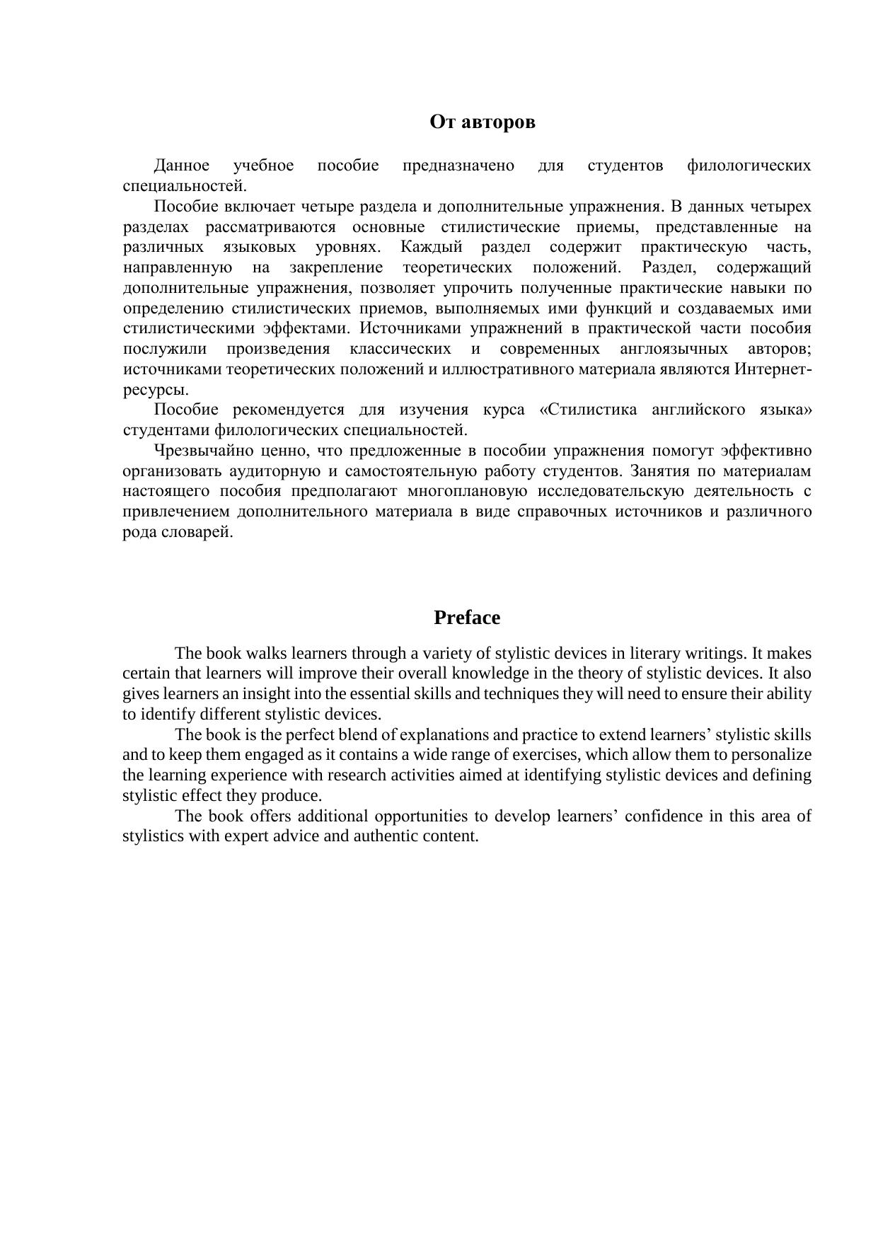 Пособие включает четыре раздела и дополнительные упражнения. В разделах рассматриваются основные стилистические приемы, представленные на различных языковых уровнях. Каждыйраздел содержит практическую часть, направленную на закрепление теоретических положений. Дополнительные упражнения позволяют упрочить полученные практические навыки по определению стилистических приемов, выполняемых ими функций и создаваемых ими стилистических эффектов. Источниками упражнений в практической части пособия послужили произведения классических и современных англоязычных авторов; источниками теоретических положений и иллюстративного материала являются интернет-ресурсы. Пособие рекомендуется для изучения курса «Стилистика английского языка» студентами филологических специальностей.