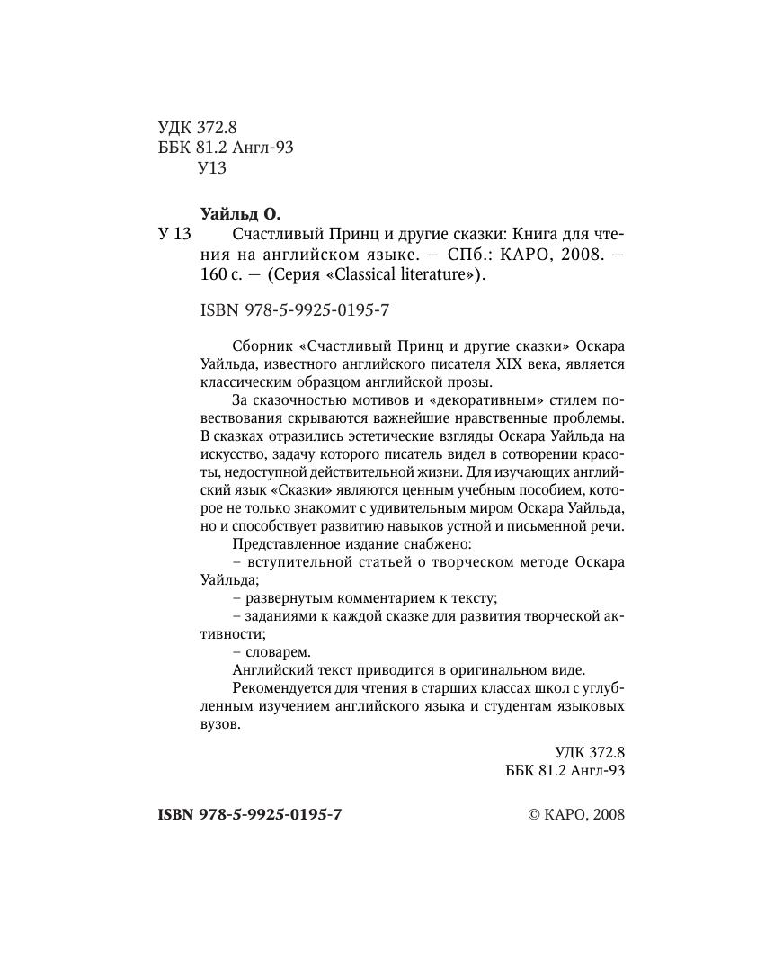Сборник «Счастливый Принц и другие сказки» Оскара Уайльда, известного английского писателя XIX века, является классическим образцом английской прозы.За сказочностью мотивов и «декоративным» стилем повествования скрываются важнейшие нравственные проблемы. В сказках отразились эстетические взгляды Оскара Уайльда на искусство, задачу которого писатель видел в сотворении красоты, недоступной действительной жизни. Для изучающих английский язык «Сказки» являются ценным учебным пособием, которое не только знакомит с удивительным миром Оскара Уайльда, но и способствует развитию навыков устной и письменной речи.Представленное издание снабжено:– вступительной статьей о творческом методе Оскара Уайльда– развернутым комментарием к тексту– заданиями к каждой сказке для развития творческой активности– словарем. Английский текст приводится в оригинальном виде. Рекомендуется для чтения в старших классах школ с углубленным изучением английского языка и студентам языковых вузов.