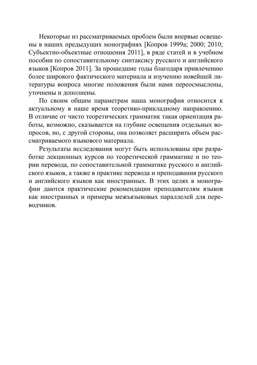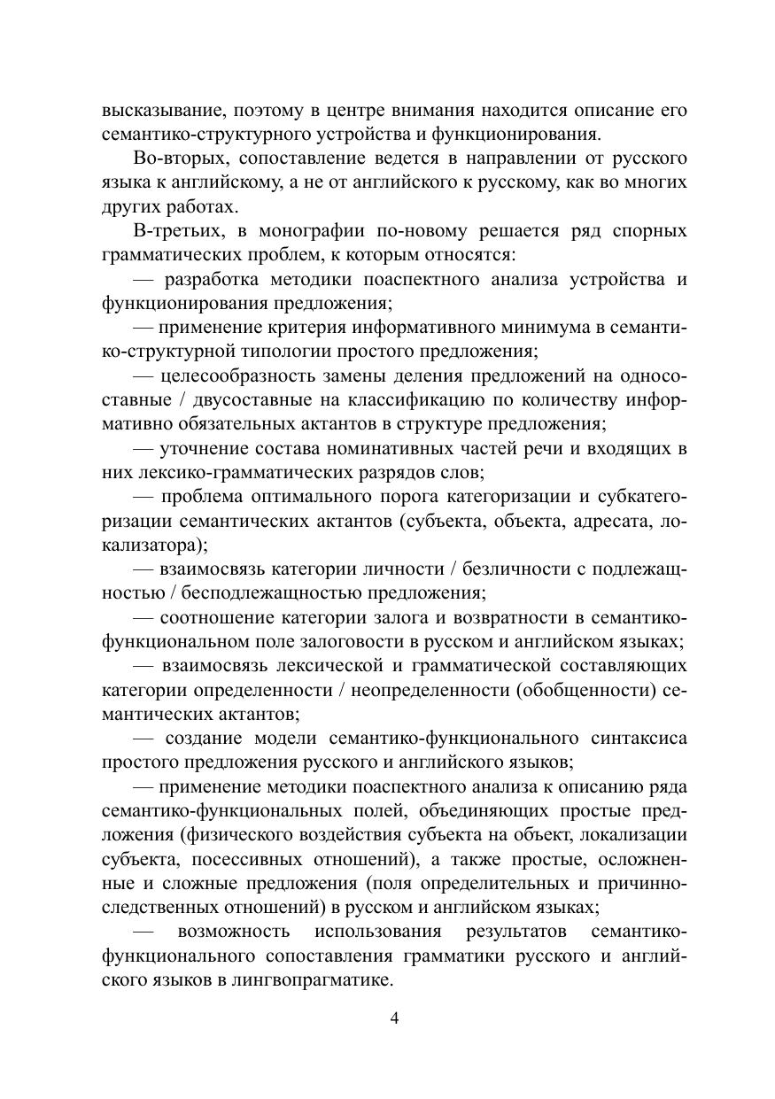 Работа относится к теоретико-прикладному, «университетскому», направлению. На основе методики поаспектного анализа семантики и функционирования предложения по-новому решены некоторые спорные вопросы грамматики русского и английского языков. Русский синтаксис системно сопоставлен с английским в семантикострук турном и в семантико-функциональном планах. Подробно рассматриваются средства выражения субъектно-объектных, локативных, посессивных, определительных и причинно-следственных отношений, а также особенности русского официально-делового стиля на фоне английского.