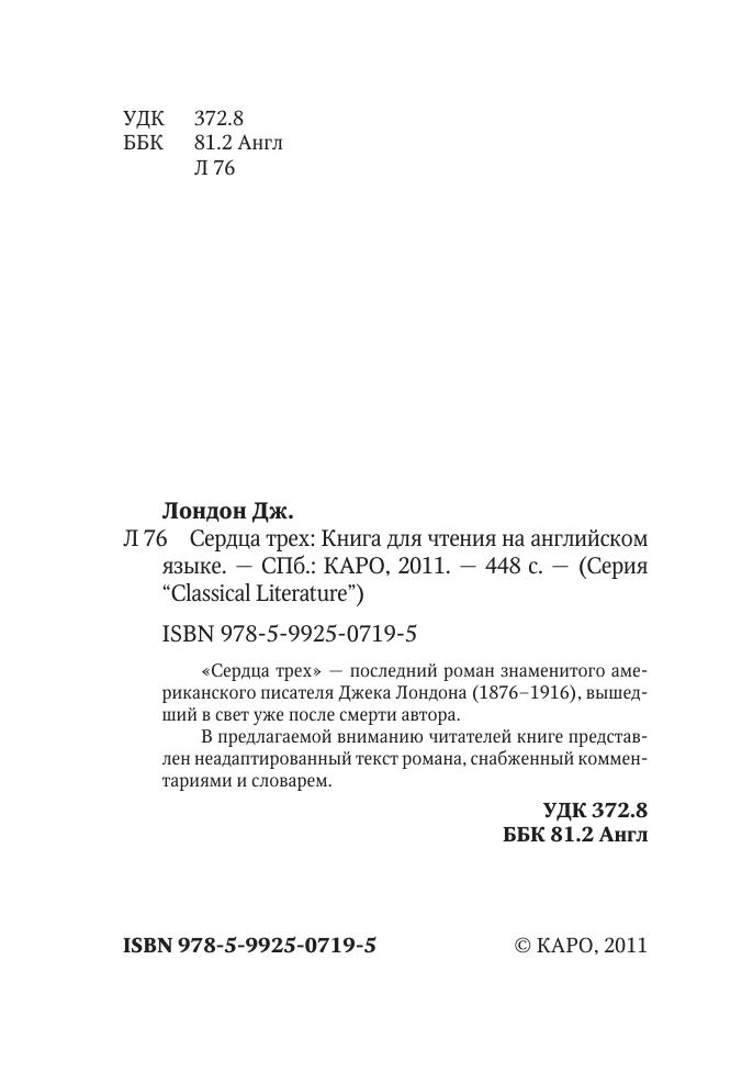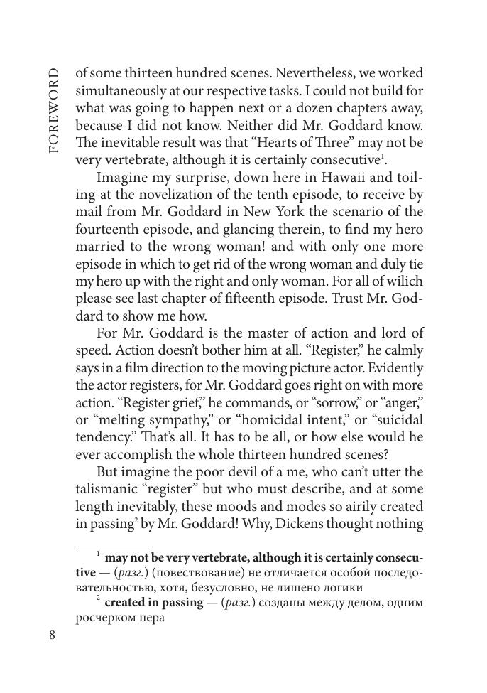 «Сердца трех» — последний роман знаменитого американского писателя Джека Лондона (1876–1916), вышедший в свет уже после смерти автора.В предлагаемой вниманию читателей книге представлен неадаптированный текст романа, снабженный комментариями и словарем.