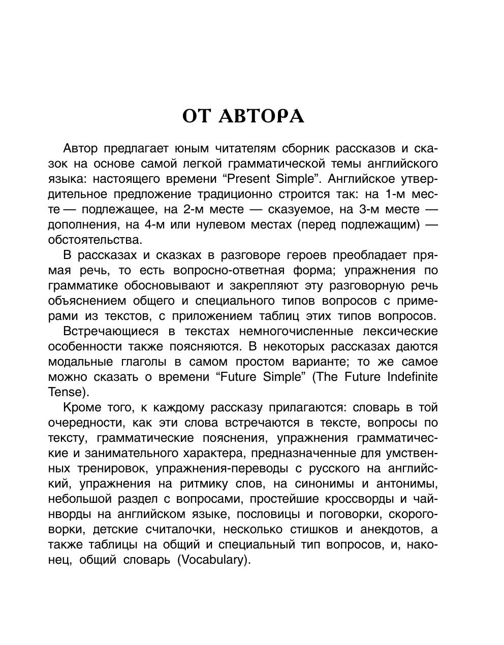 Лексический минимум, использованный при составлении упражнений (150 лексических единиц), соответствует требованиям к словарному запасу школьника, начинающего изучать английский язык.