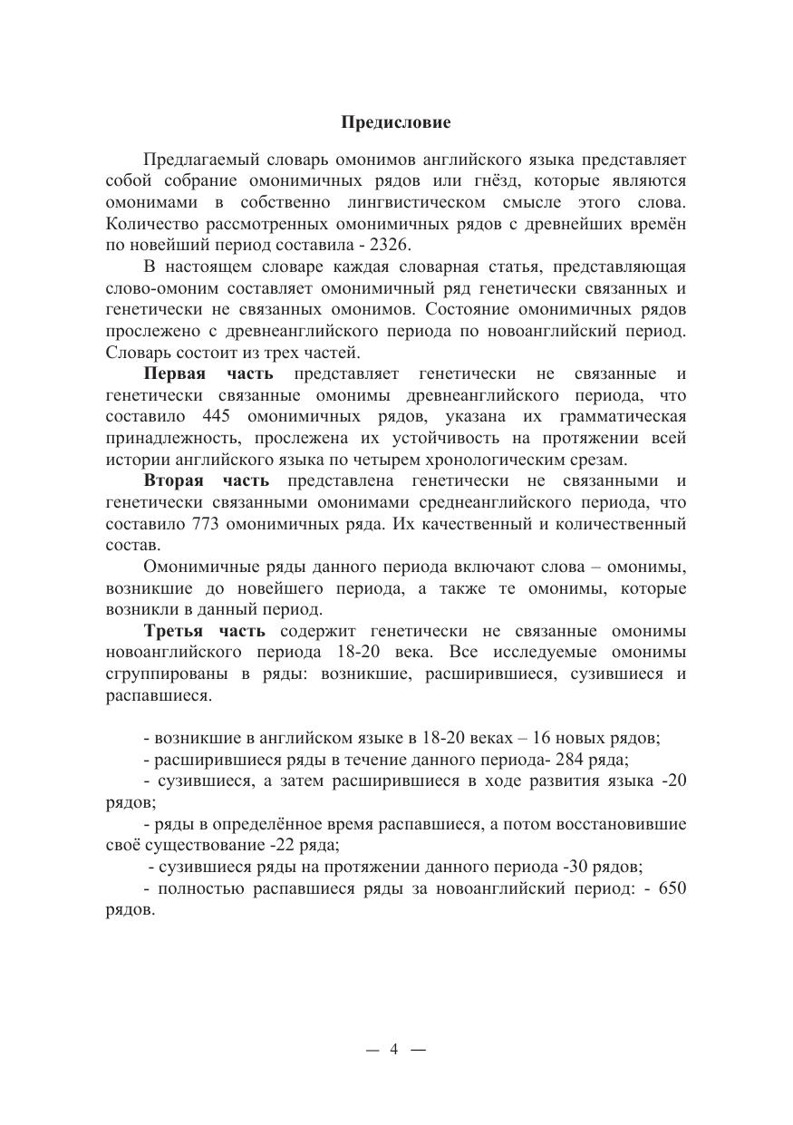 Настоящий словарь представляет собой попытку издания генетически не связанных и генетически связанных омонимов английского языка в историческом аспекте. Автор обратился к этимологии омонимичных рядов, начиная с древнеанглийского времени до новейшего периода. Учитывая полное отсутствие работ по омонимике в лексикографии, автор показывает устойчивость данного явления в ходе исторического развития английского языка, а также возникновение, расширение, сужение и выпадение омонимичных рядов в среднеанглийском и новоанглийском периодах.