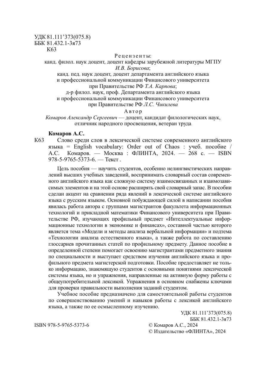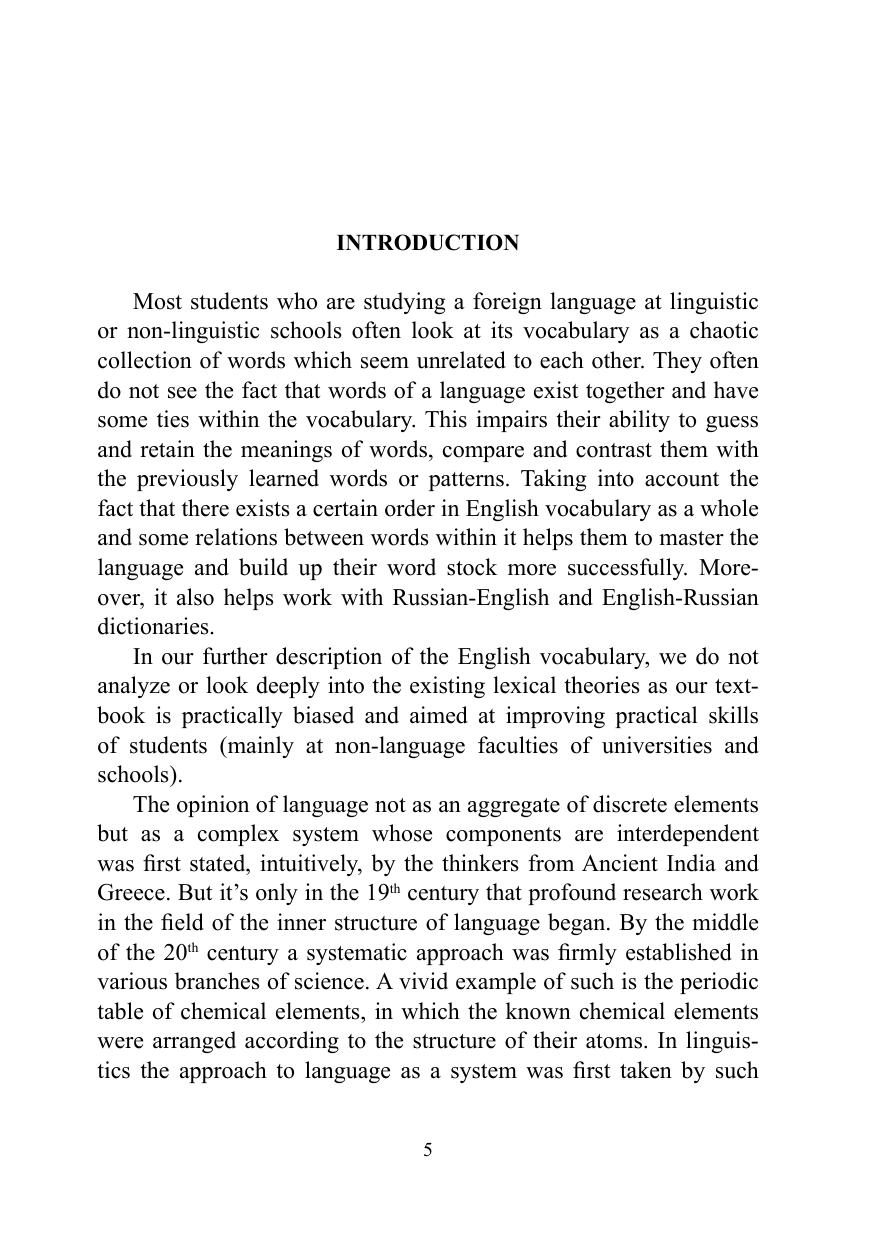 Цель пособия — научить студентов, особенно нелингвистических направлений высших учебных заведений, воспринимать словарный состав современного английского языка как сложную систему взаимосвязанных и взаимозависимых элементов и на этой основе расширять свой словарный запас. В пособии сделан акцент на сравнении ряда явлений в лексической системе английского языка с русским языком. Основной побуждающей силой в написании пособия явилась работа автора с группами магистрантов факультета информационных технологий и прикладной математики Финансового университета при Правительстве РФ, изучающих профильный предмет «Интеллектуальные информационные технологии в экономике и финансах», составной частью которого является тема «Модели и методы анализа вербальной информации» и подтема «Технологии анализа естественного языка», а также работа по составлению глоссариев прочитанных статей по профильному предмету. Данное пособие в определенной степени помогает освоению магистрантами предметного знания по специальности и выступает средством изучения английского языка и профильного предмета магистерской подготовки. Пособие предоставляет не только информацию, знакомящую студентов с основными понятиями лексической системы языка, но и упражнения, направленные на активную форму работы с общеупотребительной лексикой. Упражнения в основном снабжены ключами для проверки правильности выполнения заданий студентом. Учебное пособие предназначено для самостоятельной работы студентов по совершенствованию умений и навыков работы с лексикой английского языка, а также по ее осмысленному изучению.