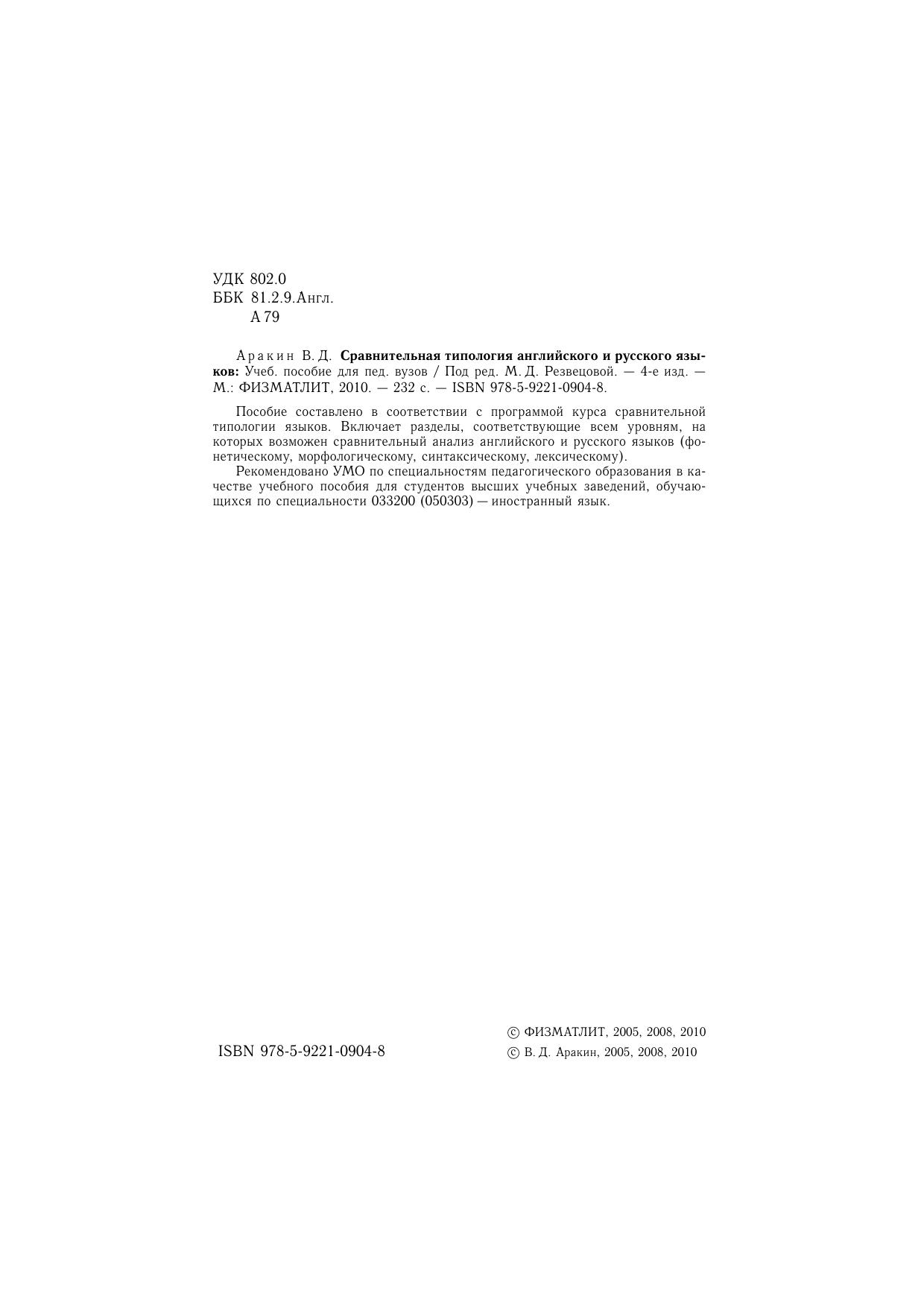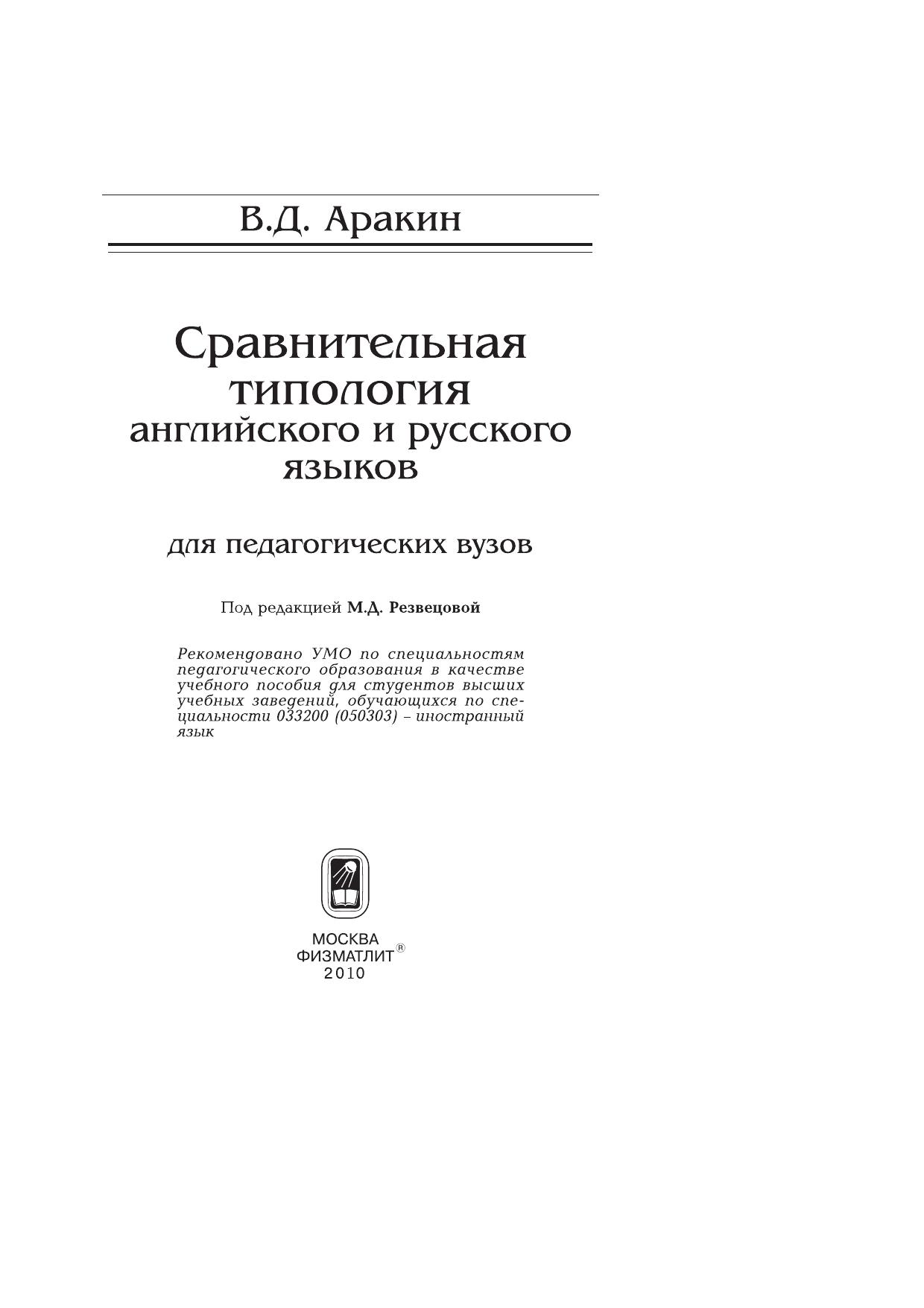 Пособие составлено в соответствии с программой курса сравнительной типологии языков. Включает разделы, соответствующие всем уровням, на которых возможен сравнительный анализ английского и русского языков (фонетическому, морфологическому, синтаксическому, лексическому).