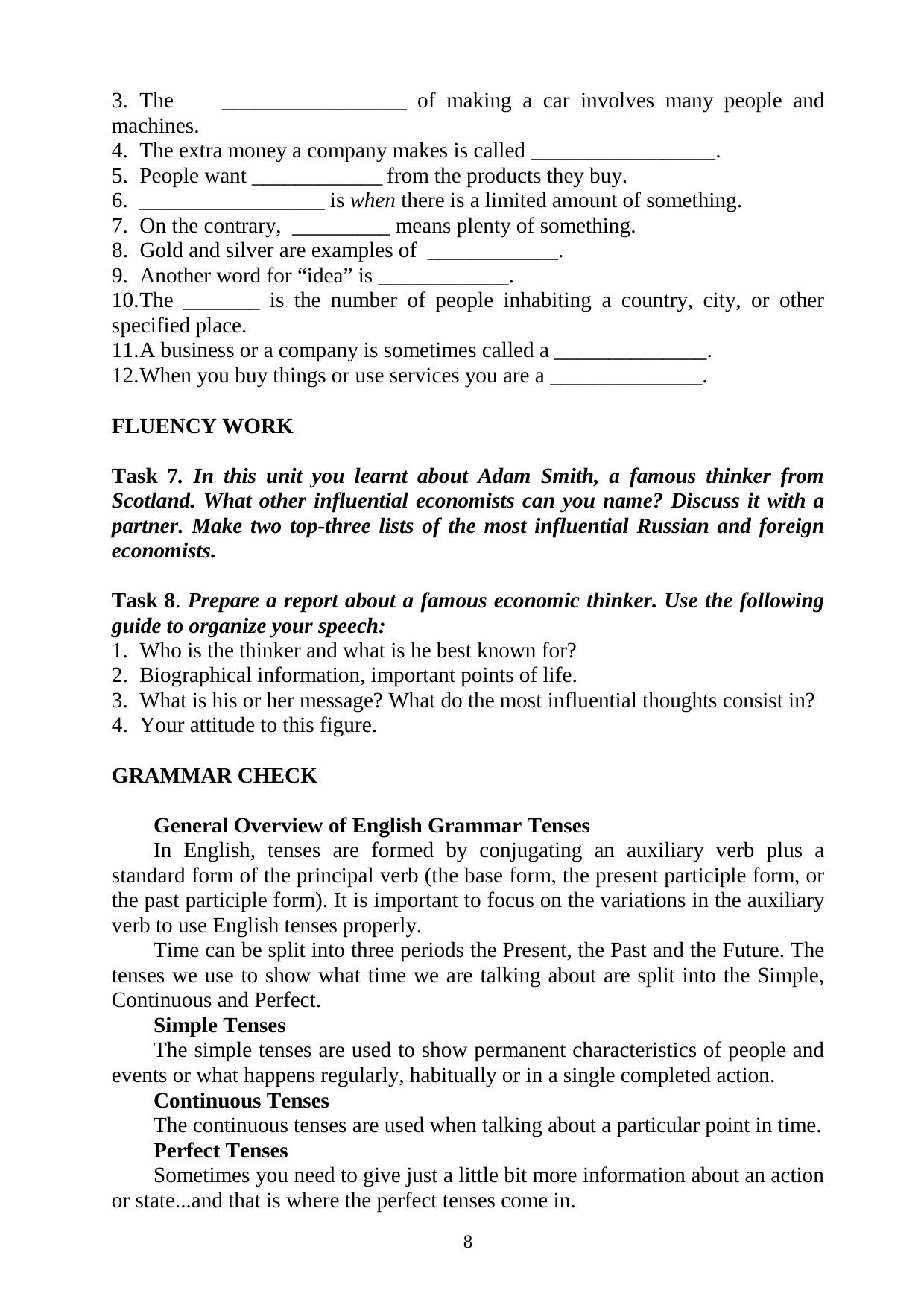 Данное учебное пособие предназначено для студентов - бакалавров экономических специальностей и может быть использовано как на аудиторных занятиях, так и для самостоятельной работы студентов. В данном пособии представлены оригинальные тексты по специальности, знакомящие студентов с основными экономическими законами, правилами международной торговли, квотами, тарифами, субсидиями и т.д. В пособии использована и объяснена наиболее частотная терминологическая лексика. Грамматические задания, представленные в каждом уроке, коррелируются с текстовым материалом, включающим в себя частотные структуры с неличными формами глаголов, условными предложениями, сослагательным наклонением.