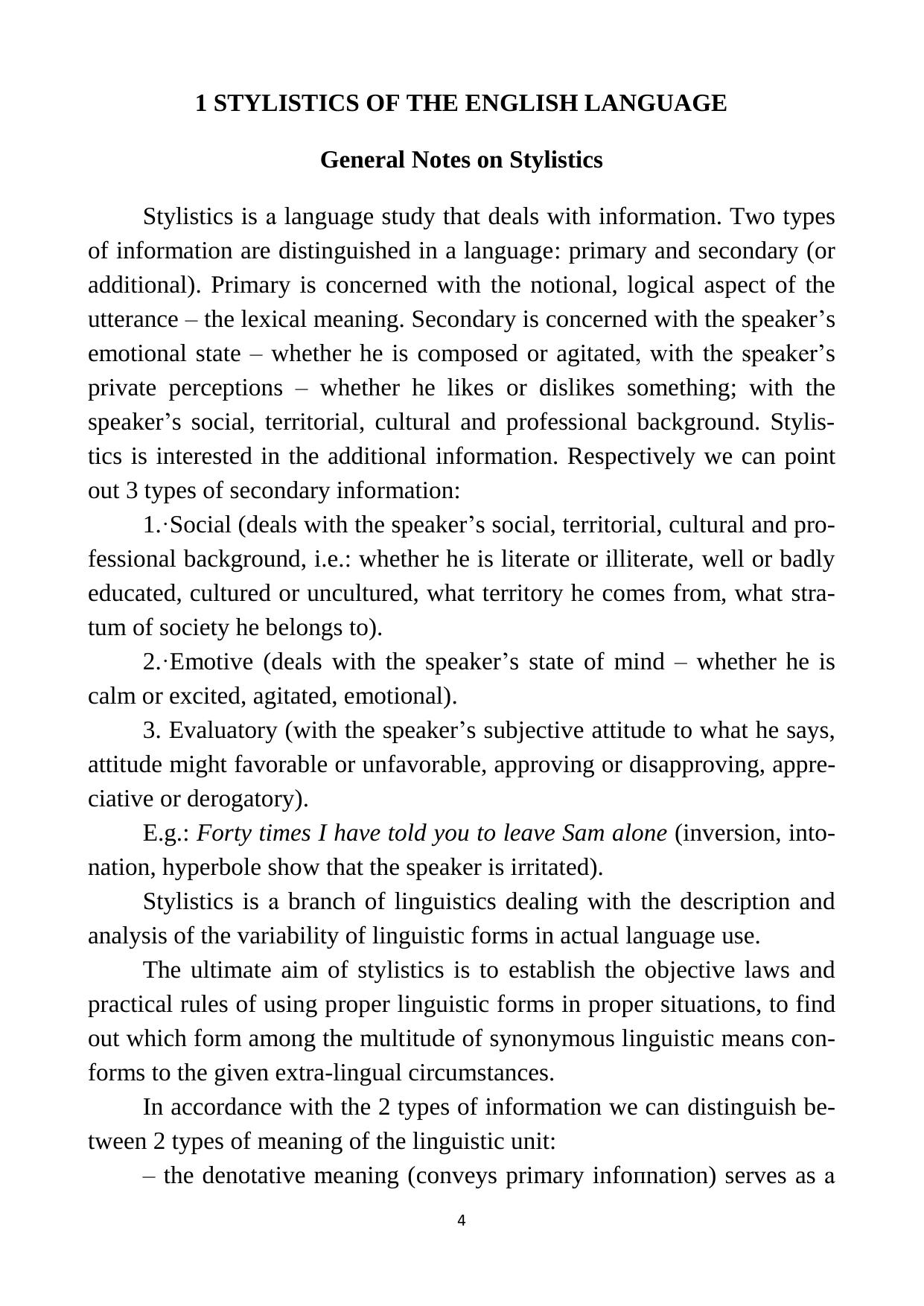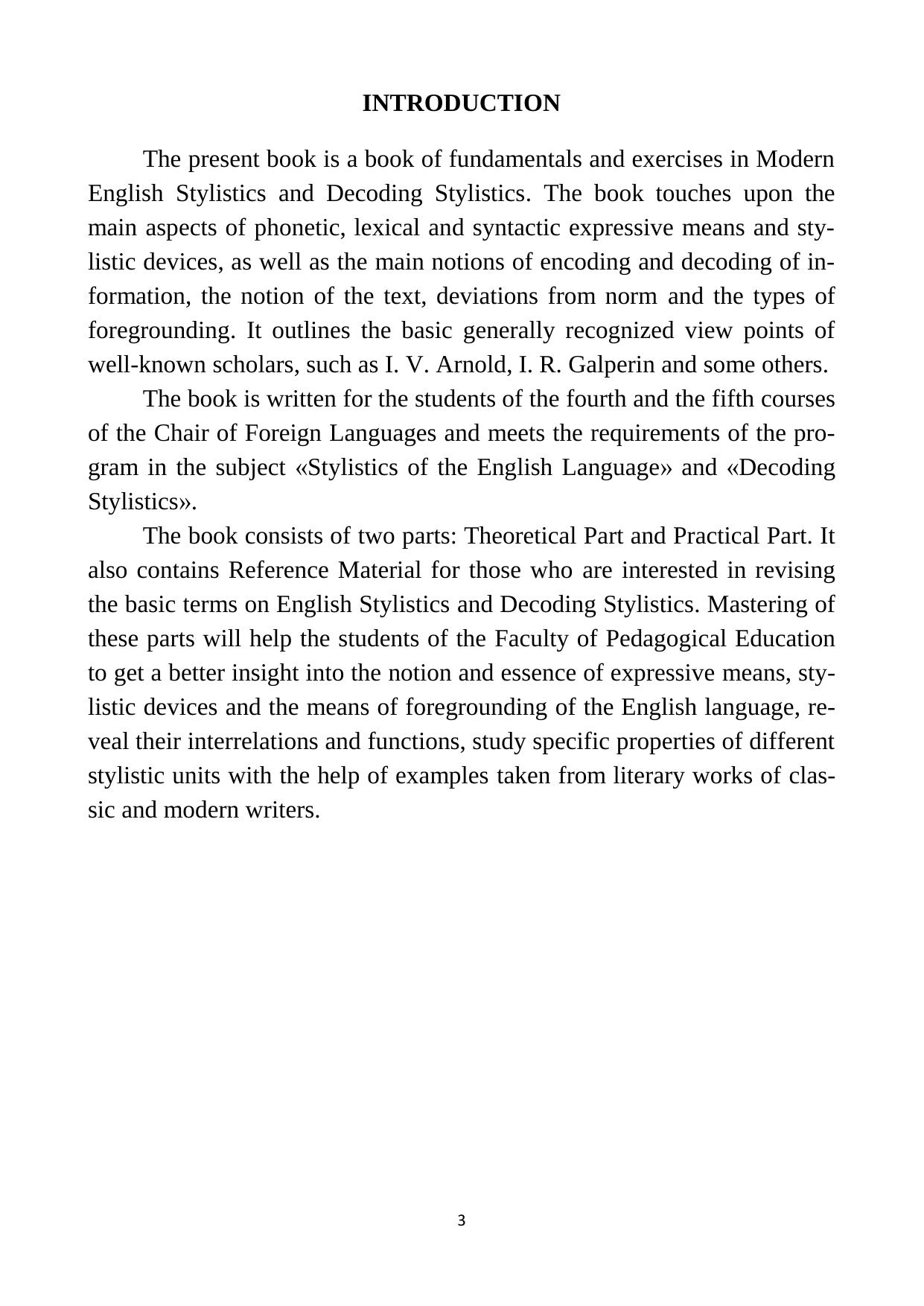 Пособие объединяет в себе теоретический и практический материал по курсу «Стилистика английского языка» и «Стилистика декодирования» для студентов 4-5 курсов направления подготовки 44.03.05 Педагогическое образование. Теоретический материал тесно связан с вопросами для подготовки к семинарским занятиям по курсу «Стилистика английского языка» и «Стилистика декодирования», знакомит студентов с основными фонетическими, лексическими и синтаксическими выразительными средствами и стилистическими приемами английского языка, а также с главными способами выдвижения. Практический материал основан на аутентичных текстах классической и современной британской и американской художественной литературы и помогает на наглядных примерах изучить специфические свойства различных категорий стилистических единиц, проанализировать их функции и проявления в предложениях и связных текстах.