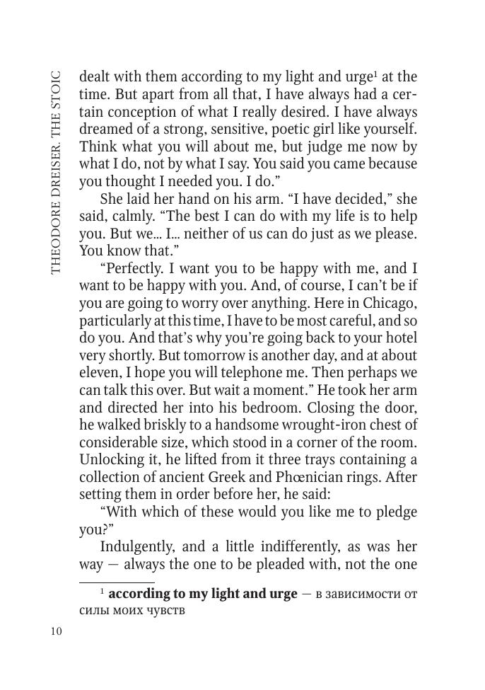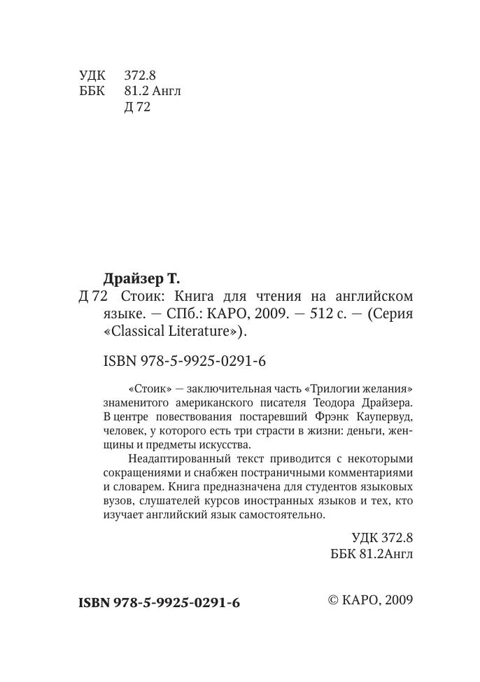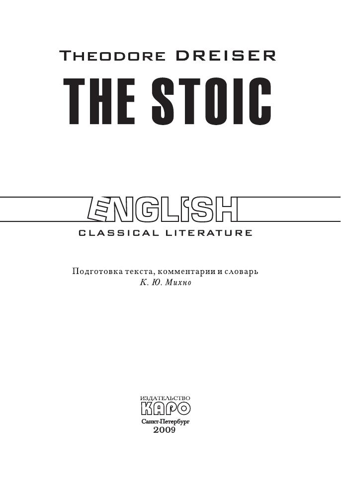 «Стоик» — заключительная часть «Трилогии желания» знаменитого американского писателя Теодора Драйзера. В центре повествования постаревший Фрэнк Каупервуд, чело век, у которого есть три страсти в жизни: деньги, женщины и предметы искусства. Неадаптированный текст приводится с некоторыми сокращениями и снабжен постраничными комментариями и словарем. Книга предназначена для студентов языковых вузов, слушателей курсов иностранных языков и тех, кто изучает английский язык самостоятельно.