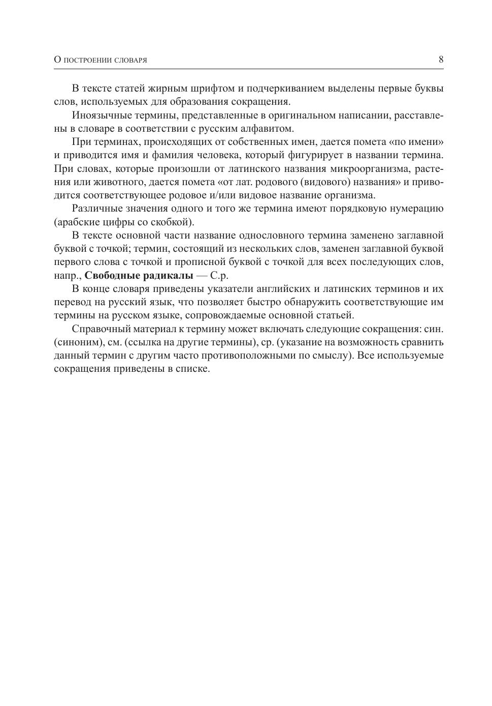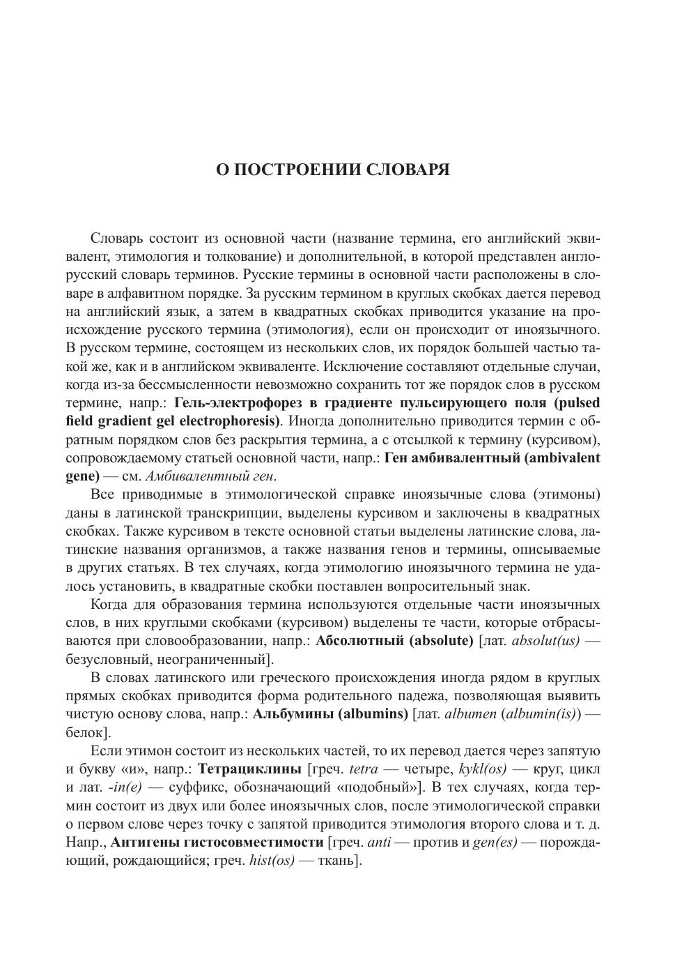 В Словаре содержится свыше 8000 русских терминов (с переводом на английский язык), наиболее употребительных в современных молекулярно-генетических и клеточных биотехнологиях, а также в общей и медицинской генетике, иммунологии, вирусологии, микробиологии, эмбриогенетике, биохимии, биоинформатике, экологии, бионанотехнологии и других бурно развивающихся биологических дисциплинах, самым тесным образом связанных с биотехнологией. Для универсализации все термины в словаре даны с их английскими эквивалентами. Важным для более полного понимания происхождения терминов является введение в словарь этимологии используемых иноязычных слов. С целью расширения компетенции читателей в словаре приводятся фамилии ученых, давших те или иные термины, и годы появления этих терминов. Указываются также Нобелевские премии, полученные за наиболее весомый вклад в создание и развитие представлений о приводимых в словаре терминах.