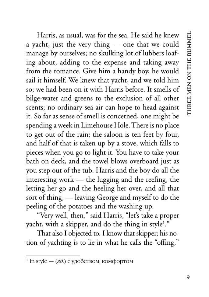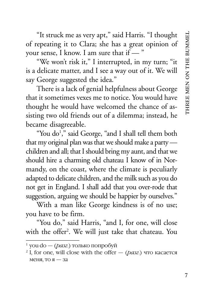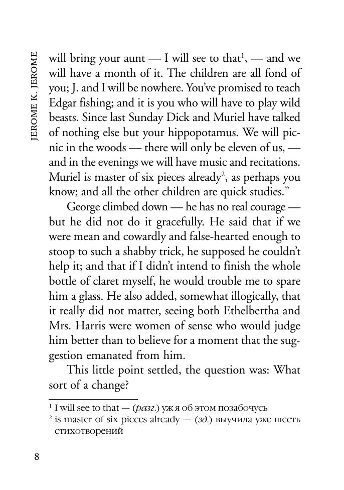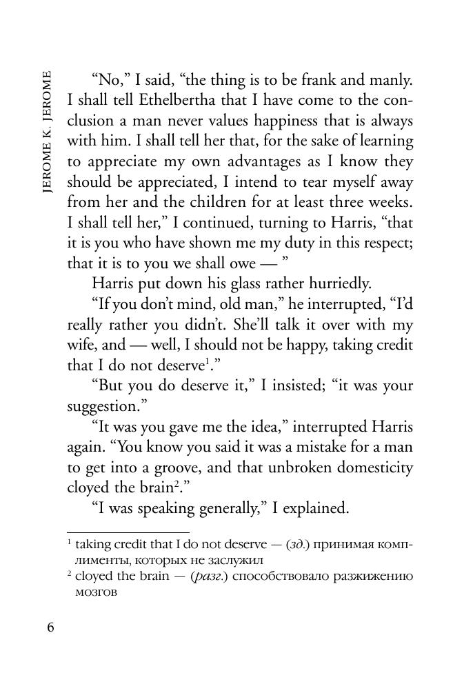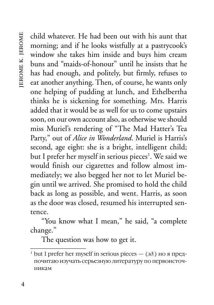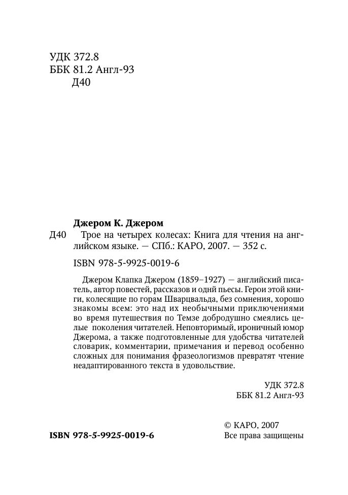 Джером Клапка Джером (1859–1927) — английский писатель, автор повестей, рассказов и одной пьесы. Герои этой книги, колесящие по горам Шварцвальда, без сомнения, хорошо знакомы всем: это над их необычными приключениями во время путешествия по Темзе добродушно смеялись целые поколения читателей. Неповторимый, ироничный юмор Джерома, а также подготовленные для удобства читателей словарик, комментарии, примечания и перевод особенно сложных для понимания фразеологизмов превратят чтение неадаптированного текста в удовольствие.