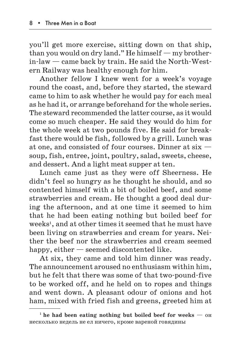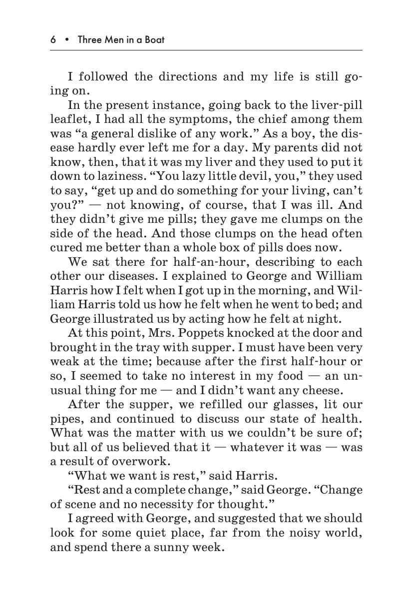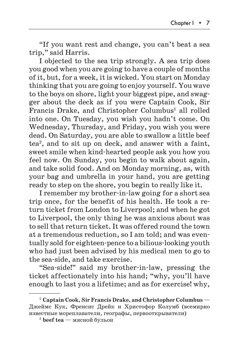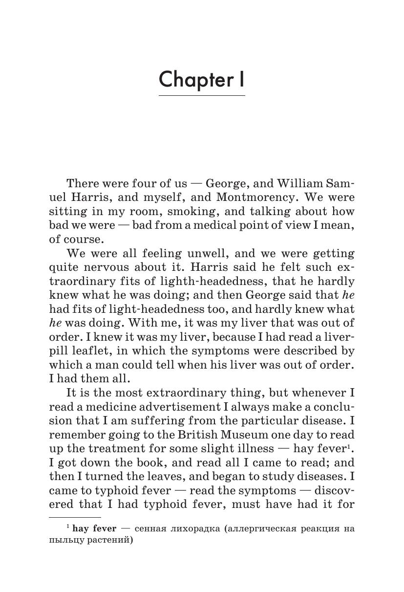 В данном издании вниманию читателя предлагается адаптированная и сокращенная версия известнейшей повести Джерома К. Джерома «Трое в лодке, не считая собаки». Автор описывает приключения троих друзей и их пса, отправившихся в путешествие на лодке по реке Темзе. Книга остается любимой поколениями читателей благодаря искрометному юмору Джерома.