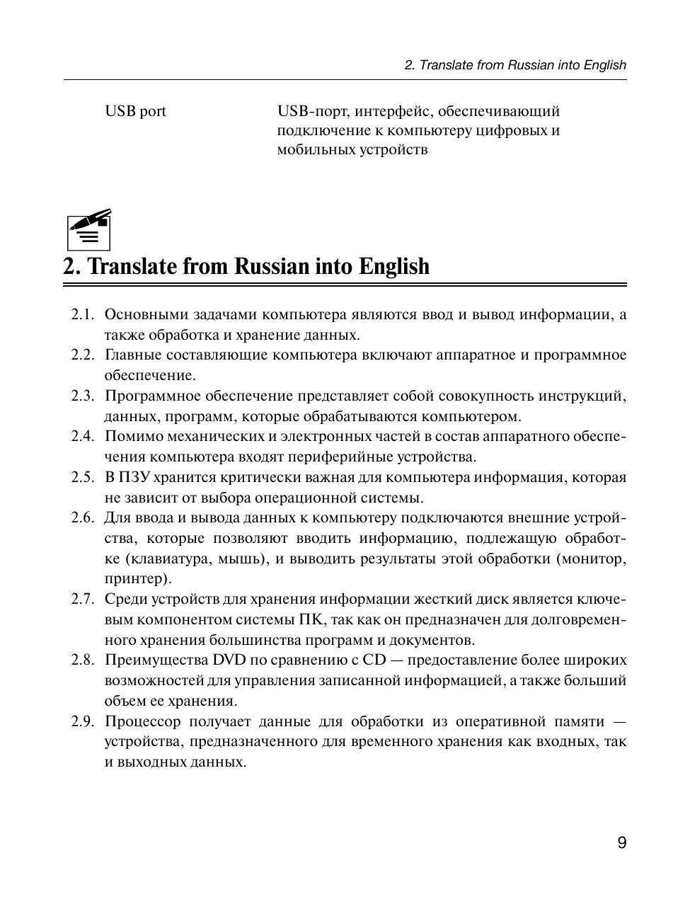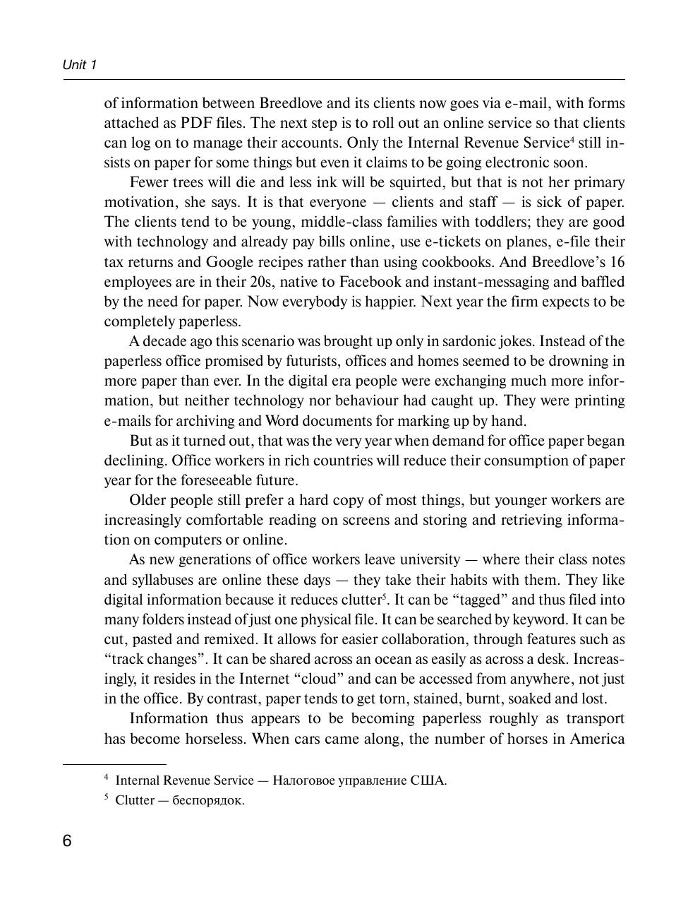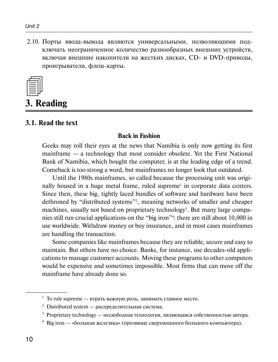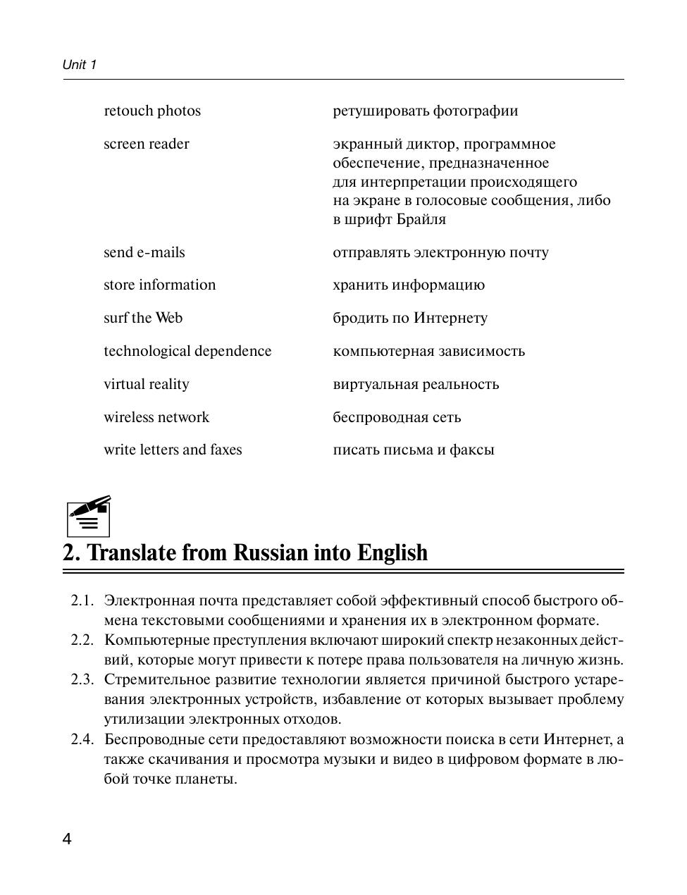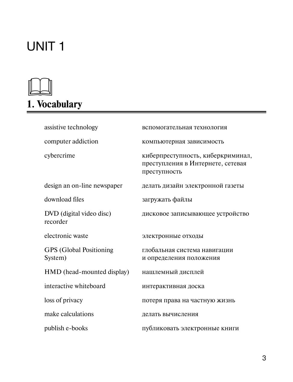 Учебно-методическое пособие разработано преподавателями кафедры английского языка факультета экономики, которые ведут занятия на факультете бизнес-информатики и отделении программной инженерии НИУ ВШЭ. В ходе занятий со студентами по учебнику «Professional English in Use. ICT. For Computers and the Internet» Издательства Кембриджского университета (Cambridge University Press) со студентами НИУ ВШЭ возникла необходимость дополнить существующий курс глоссарием с русскоязычными соответствиями, заданиями на перевод и дополнительными заданиями, которые помогут совершенствовать навыки говорения. Цель создания пособия — помочь студентам и всем заинтересованным лицам расширить словарный запас и более комфортно ощущать себя в иноязычной профессиональной среде. Рекомендуется как дополнительный компонент к учебному курсу «Professional English in Use. ICT. For Computers and the Internet» для российских студентов неязыковых вузов, имеющих уровень языковой подготовки не ниже «pre-intermediate» и обучающихся по специальности «бизнес-информатика» и «программная инженерия».