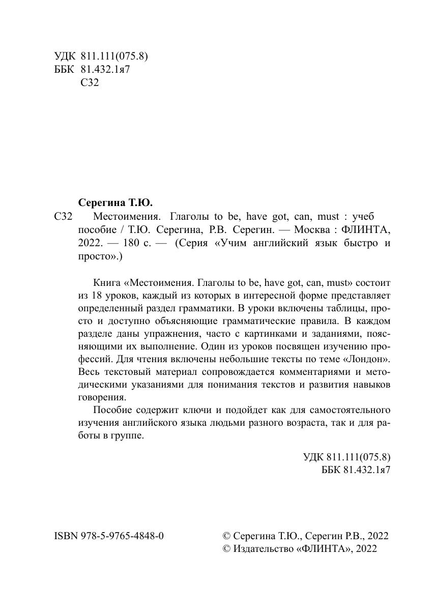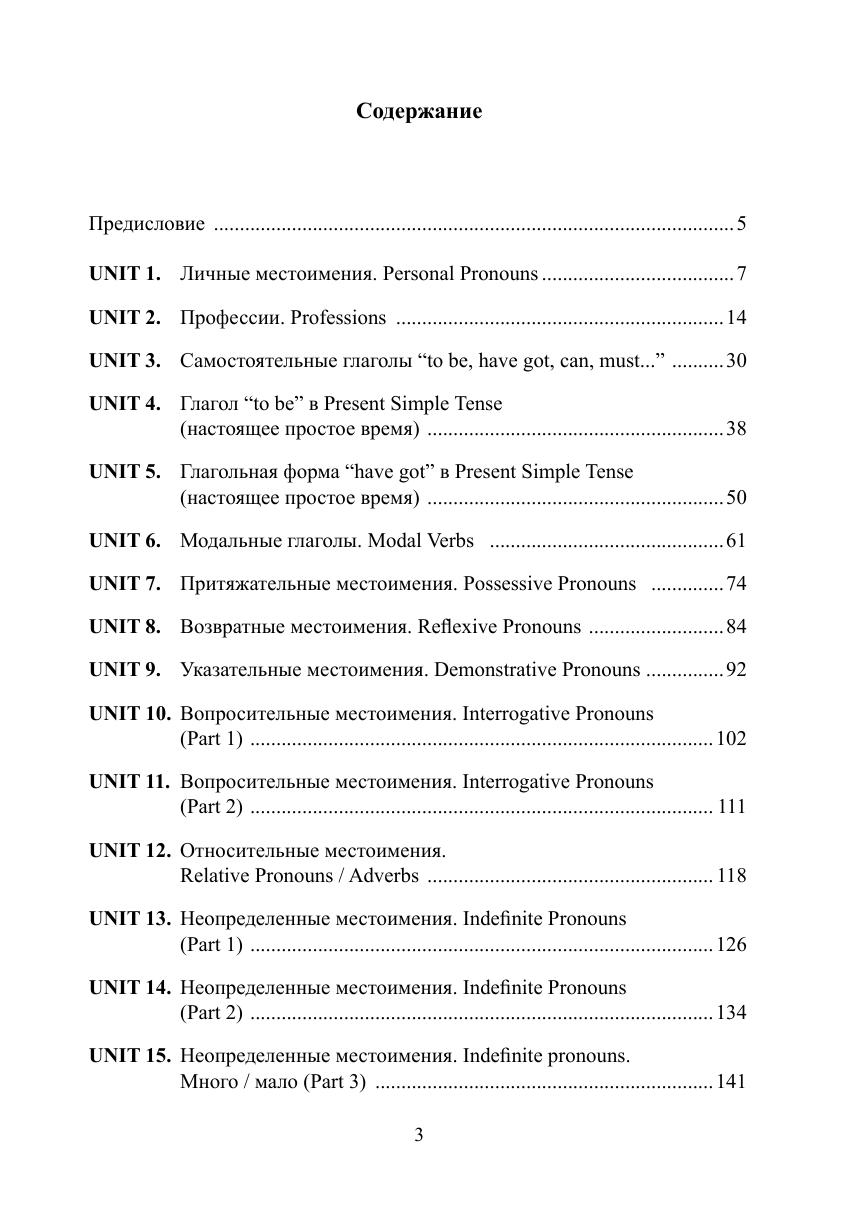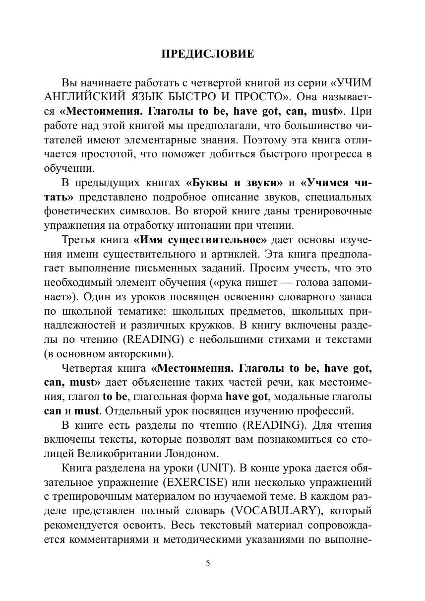 Книга «Местоимения. Глаголы to be, have got, can, must» состоит из 18 уроков, каждый из которых в интересной форме представляет определенный раздел грамматики. В уроки включены таблицы, просто и доступно объясняющие грамматические правила. В каждом разделе даны упражнения, часто с картинками и заданиями, поясняющими их выполнение. Один из уроков посвящен изучению профессий. Для чтения включены небольшие тексты по теме «Лондон». Весь текстовый материал сопровождается комментариями и методическими указаниями для понимания текстов и развития навыков говорения.