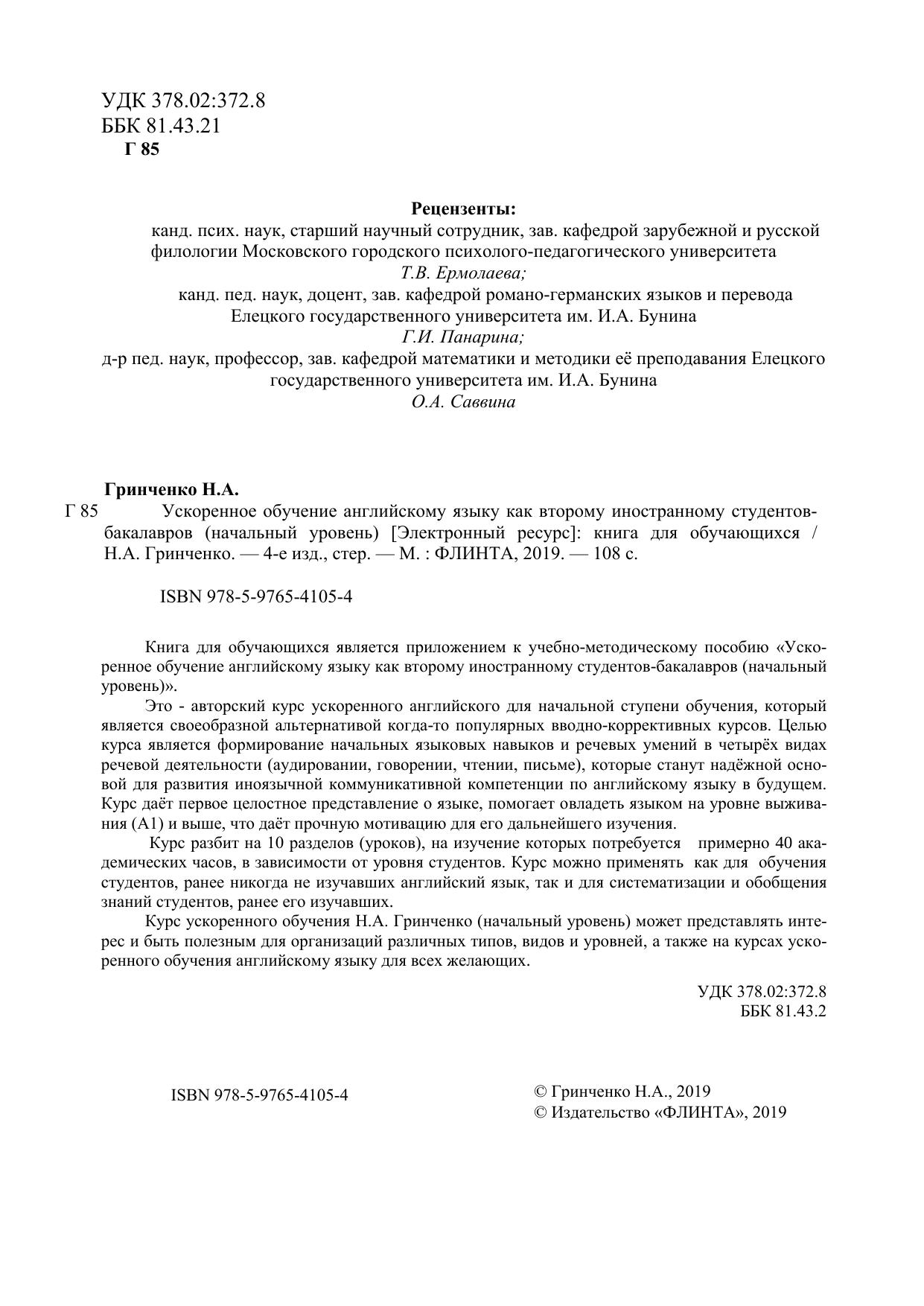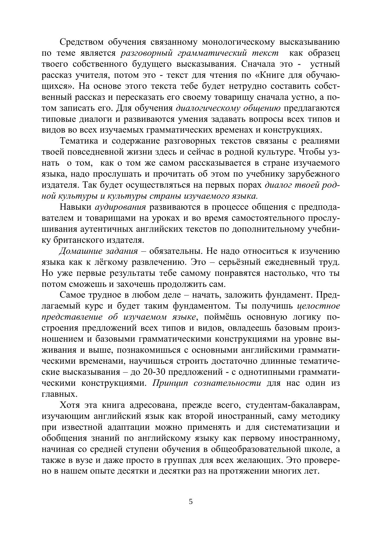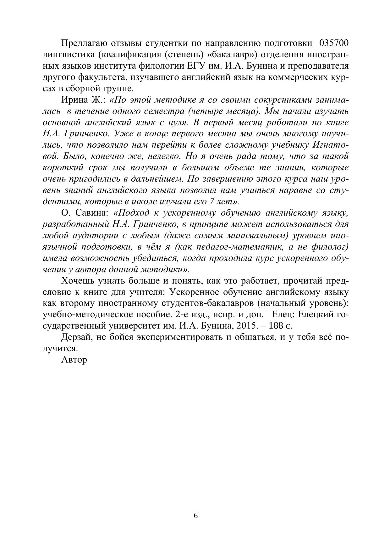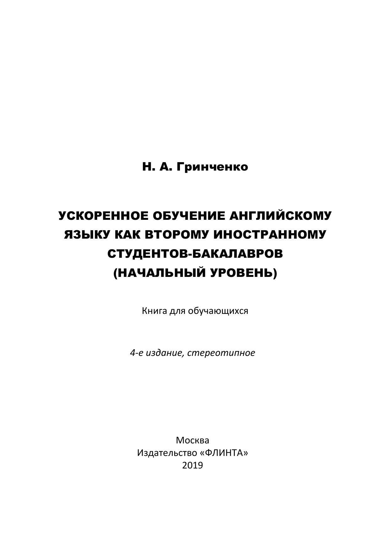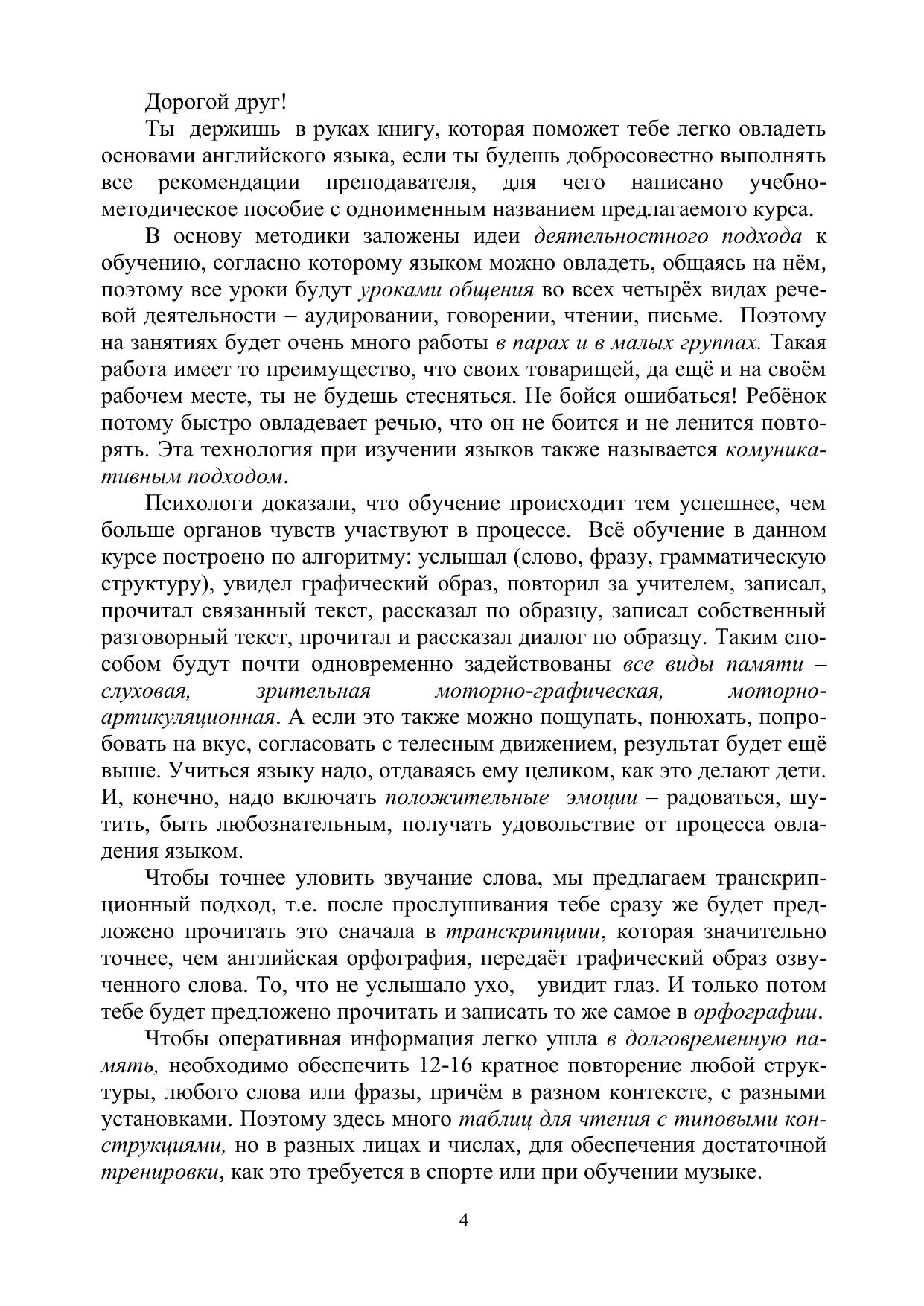 Книга для обучающихся является приложением к учебно-методическому пособию «Ускоренное обучение английскому языку как второму иностранному студентов-бакалавров (начальный уровень)». Это - авторский курс ускоренного английского для начальной ступени обучения, который является своеобразной альтернативой когда-то популярных вводно-коррективных курсов. Целью курса является формирование начальных языковых навыков и речевых умений в четырѐх видах речевой деятельности (аудировании, говорении, чтении, письме), которые станут надѐжной основой для развития иноязычной коммуникативной компетенции по английскому языку в будущем. Курс даѐт первое целостное представление о языке, помогает овладеть языком на уровне выживания (А1) и выше, что даѐт прочную мотивацию для его дальнейшего изучения. Курс разбит на 10 разделов (уроков), на изучение которых потребуется примерно 40 академических часов, в зависимости от уровня студентов. Курс можно применять как для обучения студентов, ранее никогда не изучавших английский язык, так и для систематизации и обобщения знаний студентов, ранее его изучавших.