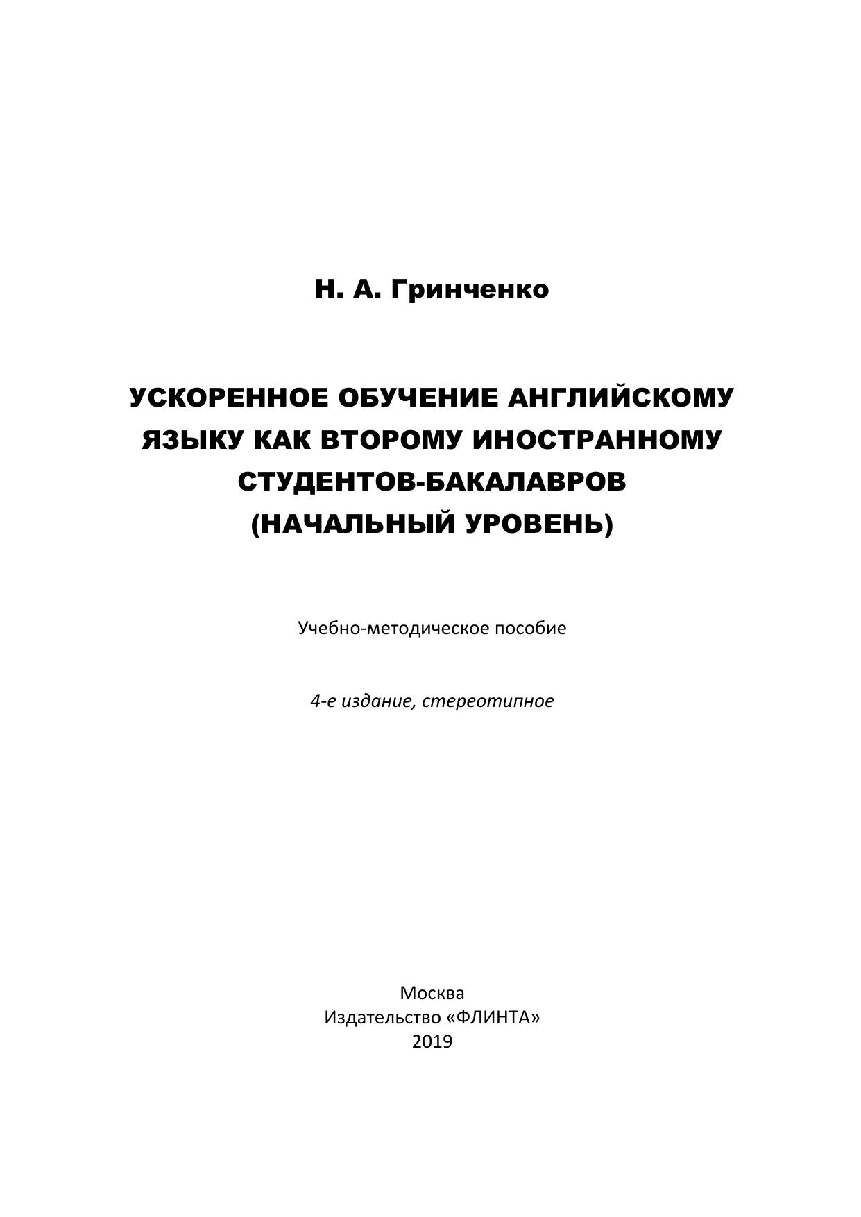 Учебно-методическое пособие Н.А. Гринченко «Ускоренное обучение английскому языку как второму иностранному студентов-бакалавров (начальный уровень)» также может представлять интерес и быть полезным для всех преподавателей иностранного языка образовательных организаций различных типов, видов и уровней, а также на курсах ускоренного обучения английскому языку для всех желающих.