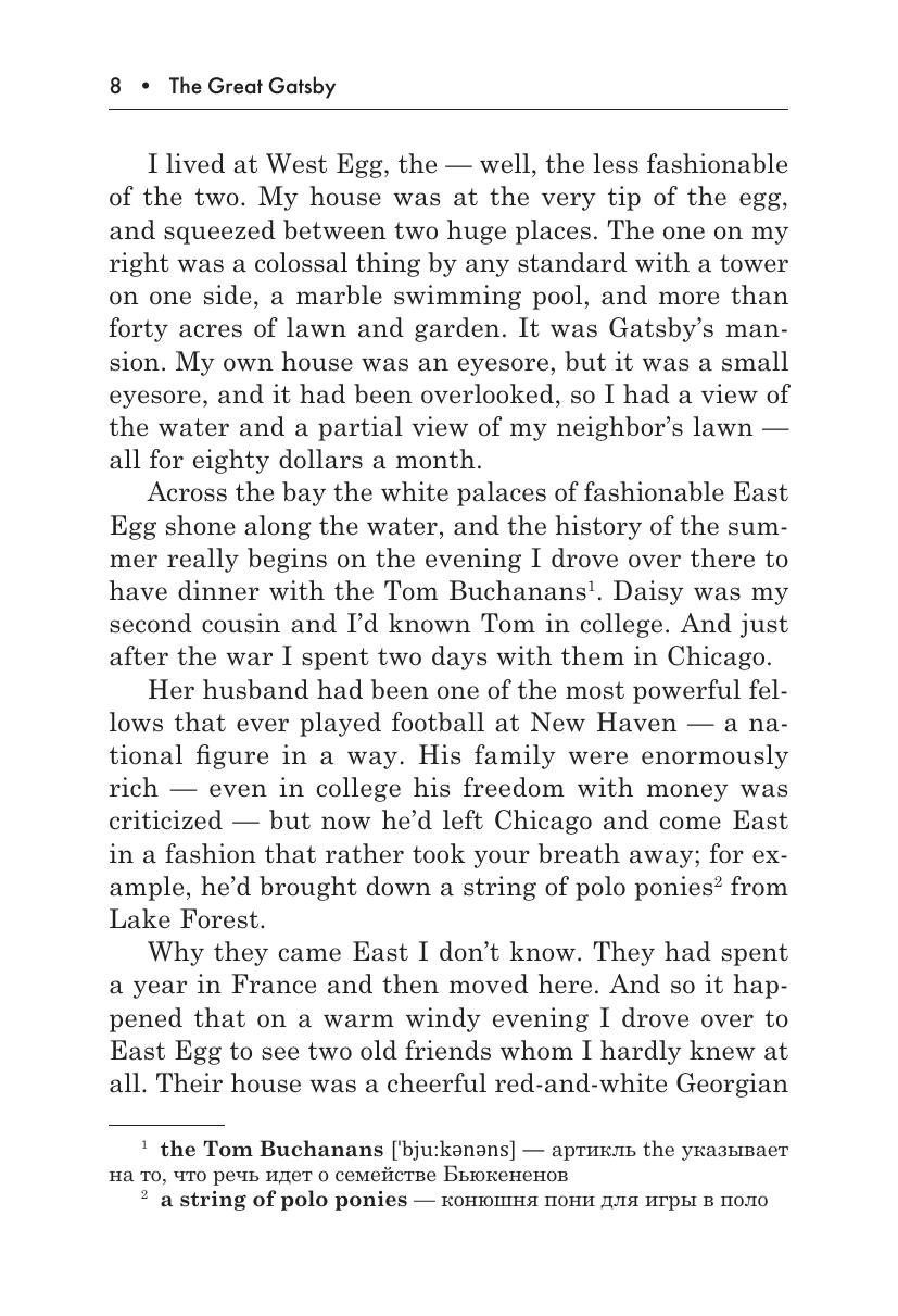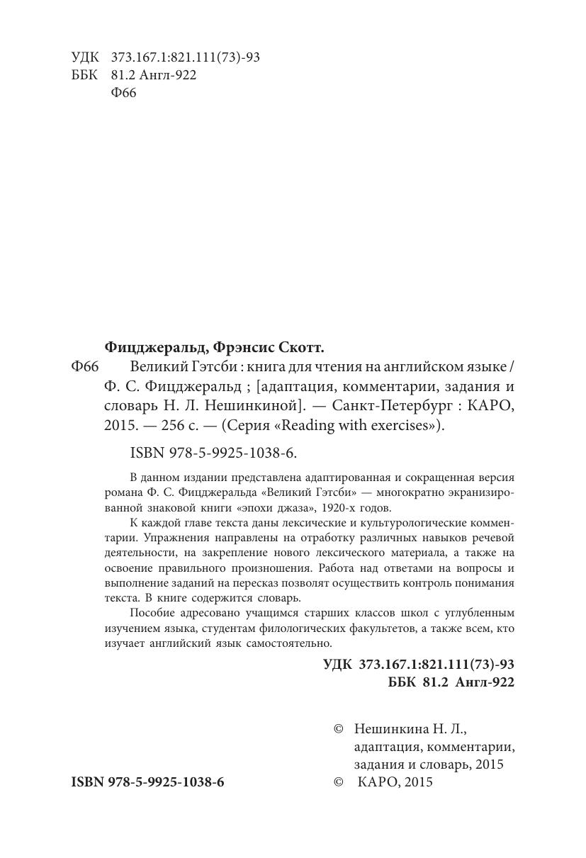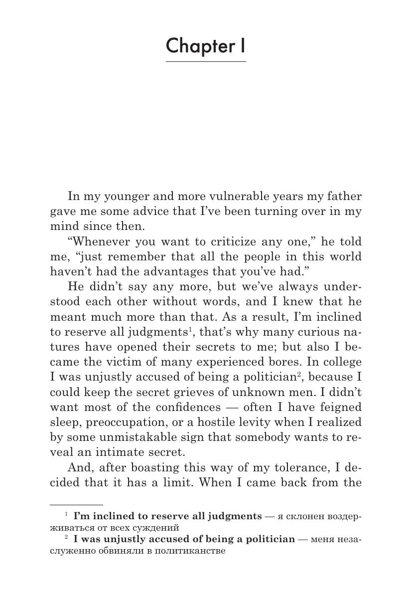 В данном издании представлена адаптированная и сокращенная версия романа Ф. С. Фицджеральда «Великий Гэтсби» — многократно экранизированной знаковой книги «эпохи джаза», 1920-х годов. К каждой главе текста даны лексические и культурологические комментарии. Упражнения направлены на отработку различных навыков речевой деятельности, на закрепление нового лексического материала, а также на освоение правильного произношения. Работа над ответами на вопросы и