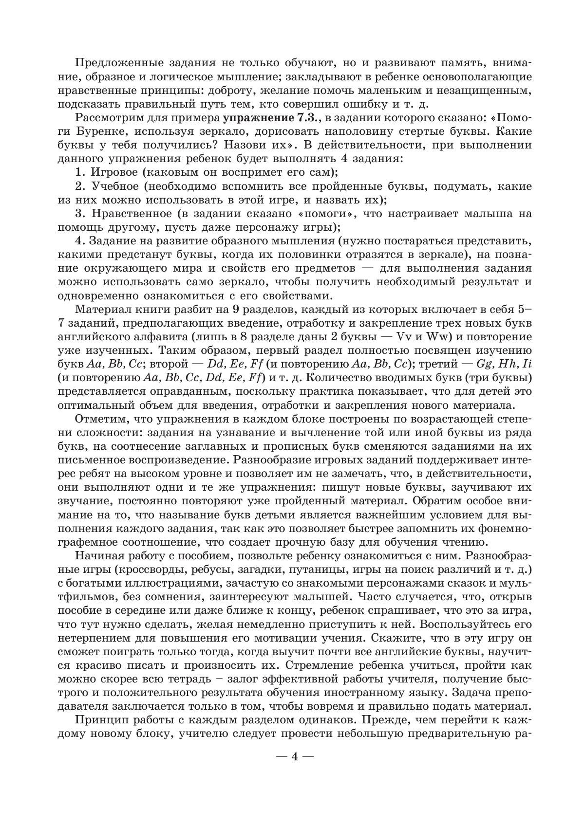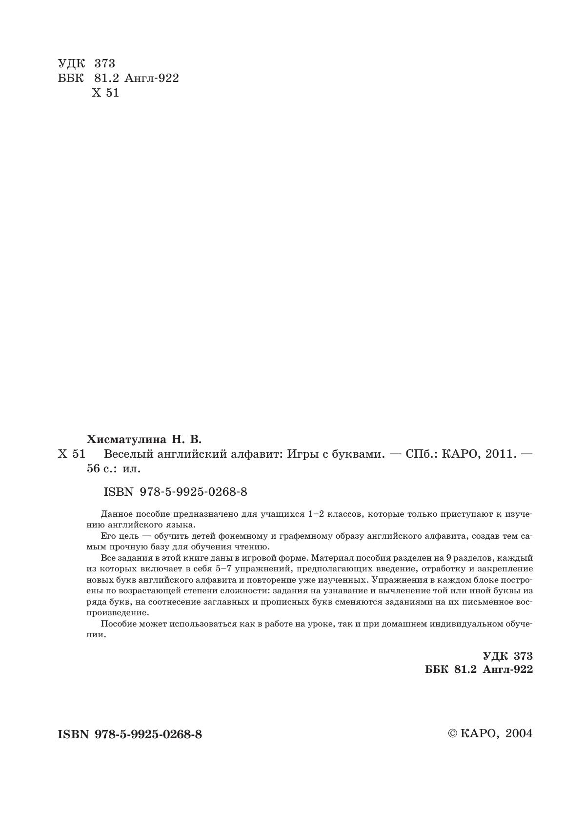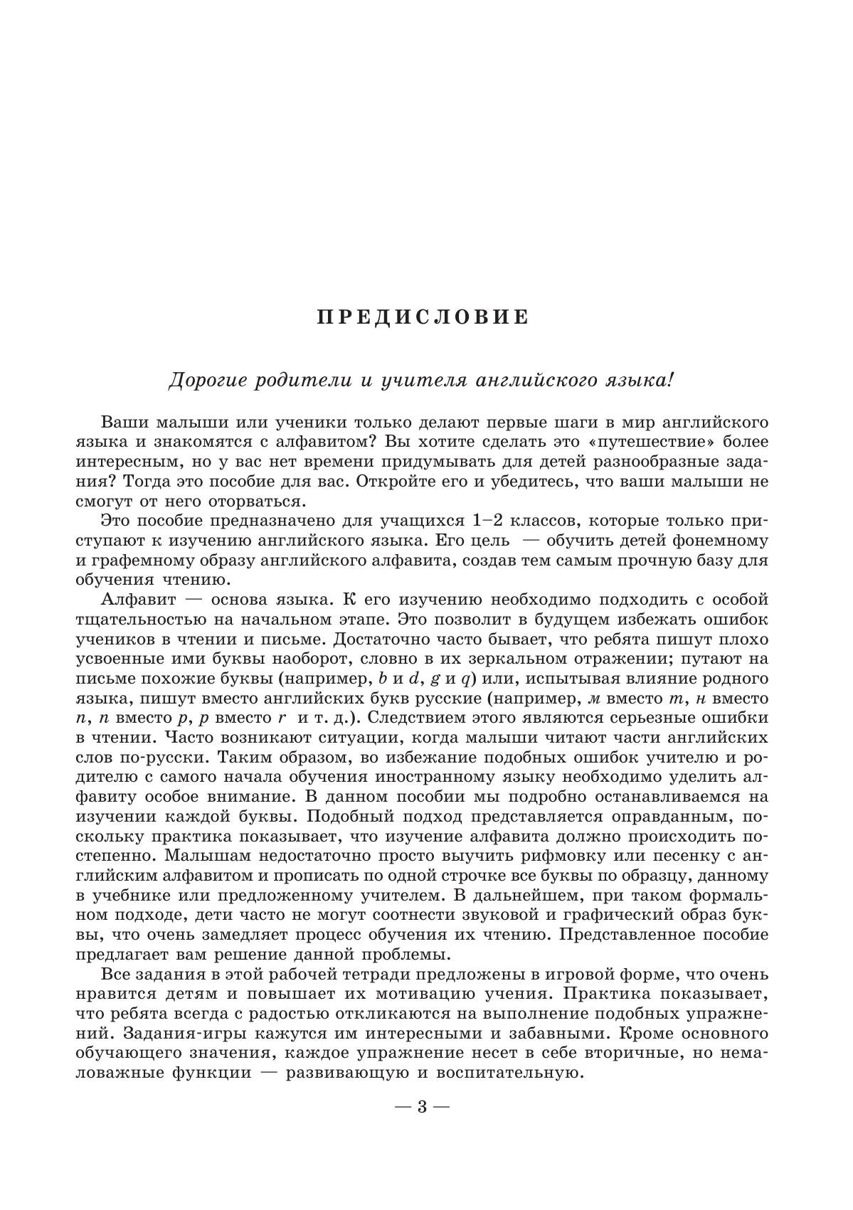 Данное пособие предназначено для учащихся 1–2 классов, которые только приступают к изучению английского языка. Его цель — обучить детей фонемному и графемному образу английского алфавита, создав тем самым прочную базу для обучения чтению. Все задания в этой книге даны в игровой форме. Материал пособия разделен на 9 разделов, каждый из которых включает в себя 5–7 упражнений, предполагающих введение, отработку и закрепление новых букв английского алфавита и повторение уже изученных. Упражнения в каждом блоке построены по возрастающей степени сложности: задания на узнавание и вычленение той или иной буквы из ряда букв, на соотнесение заглавных и прописных букв сменяются заданиями на их письменное воспроизведение. Пособие может использоваться как в работе на уроке, так и при домашнем индивидуальном обучении.