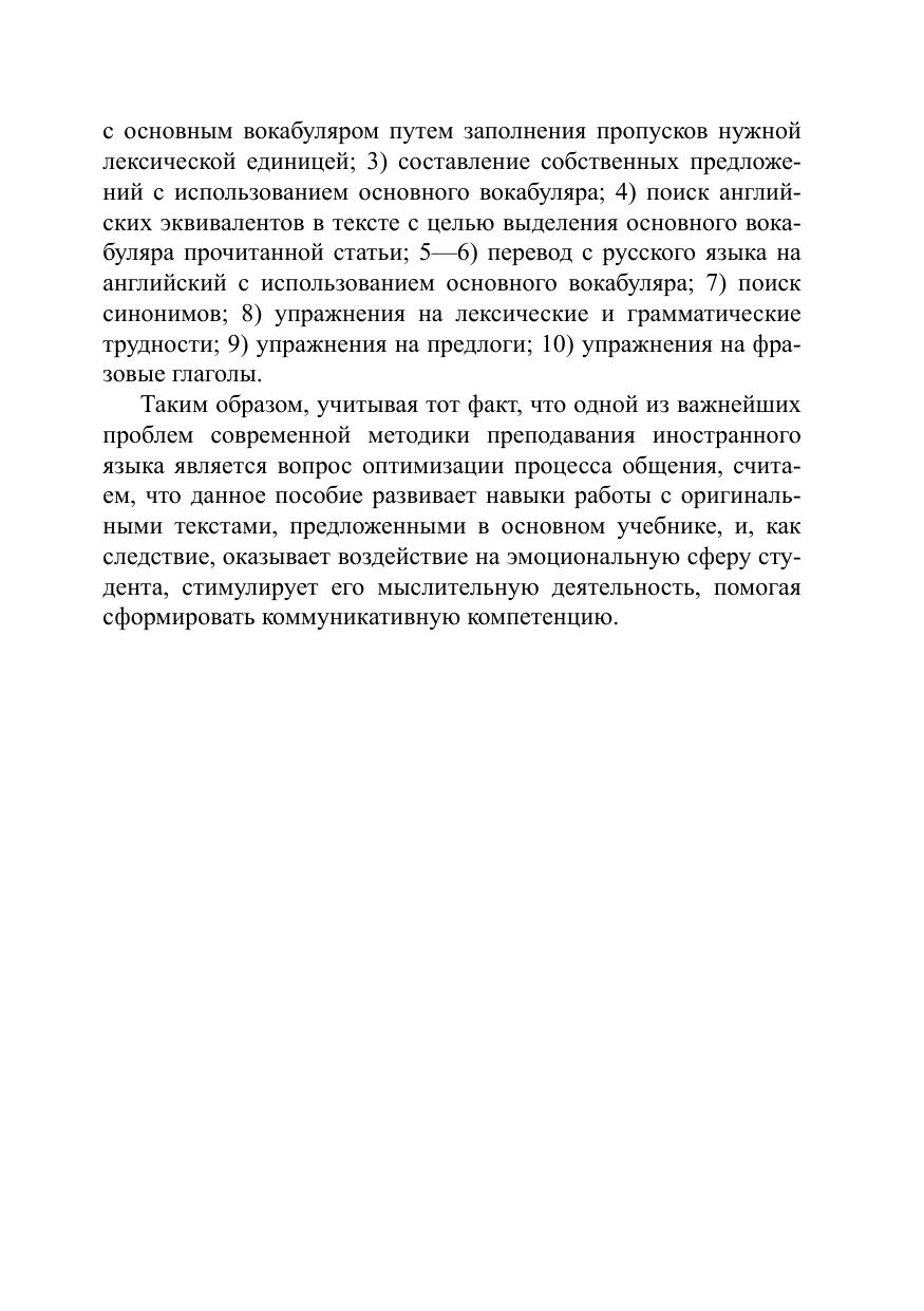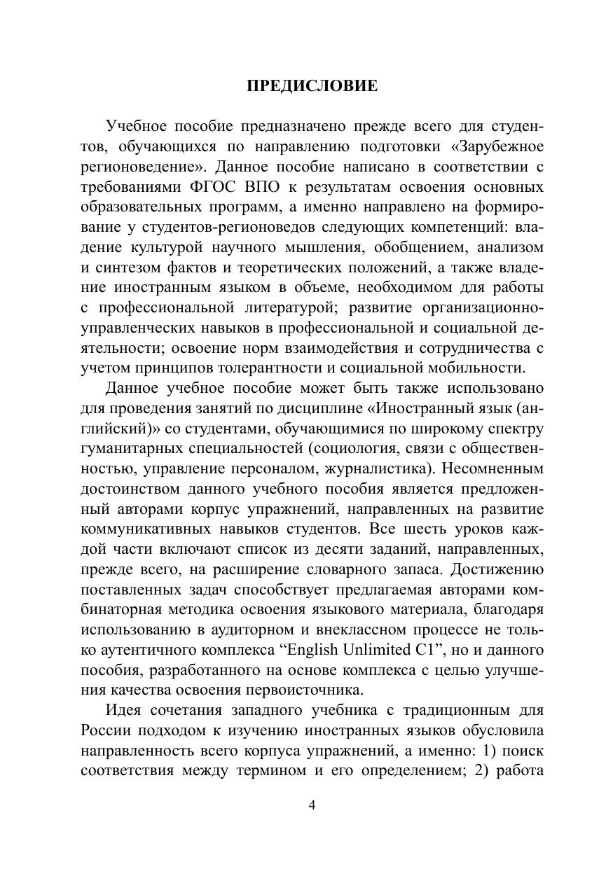 Учебное пособие предназначается для студентов направления подготовки «Зарубежное регионоведение» с уровнем владения английским языком не ниже уровня Upper-Intermediate. Тематика упражнений, выступающих в качестве основы данного учебного пособия, весьма разнообразна. Пособие состоит из двух частей, в каждой из которых содержится 6 уроков, являющихся дополнительным материалом для студентов, занимающихся по учебному комплексу “English Unlimited C1”.