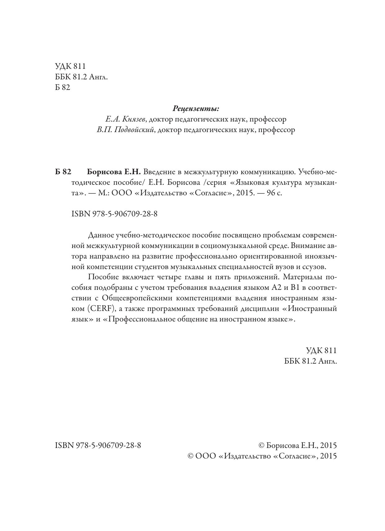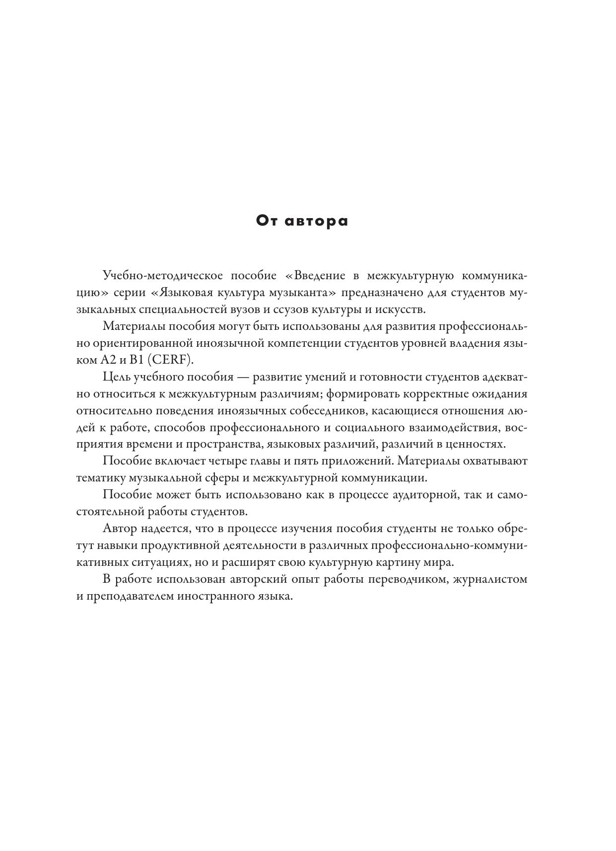 Данное учебно-методическое пособие посвящено проблемам современной межкультурной коммуникации в социомузыкальной среде. Внимание автора направлено на развитие профессионально ориентированной иноязычной компетенции студентов музыкальных специальностей вузов и ссузов.