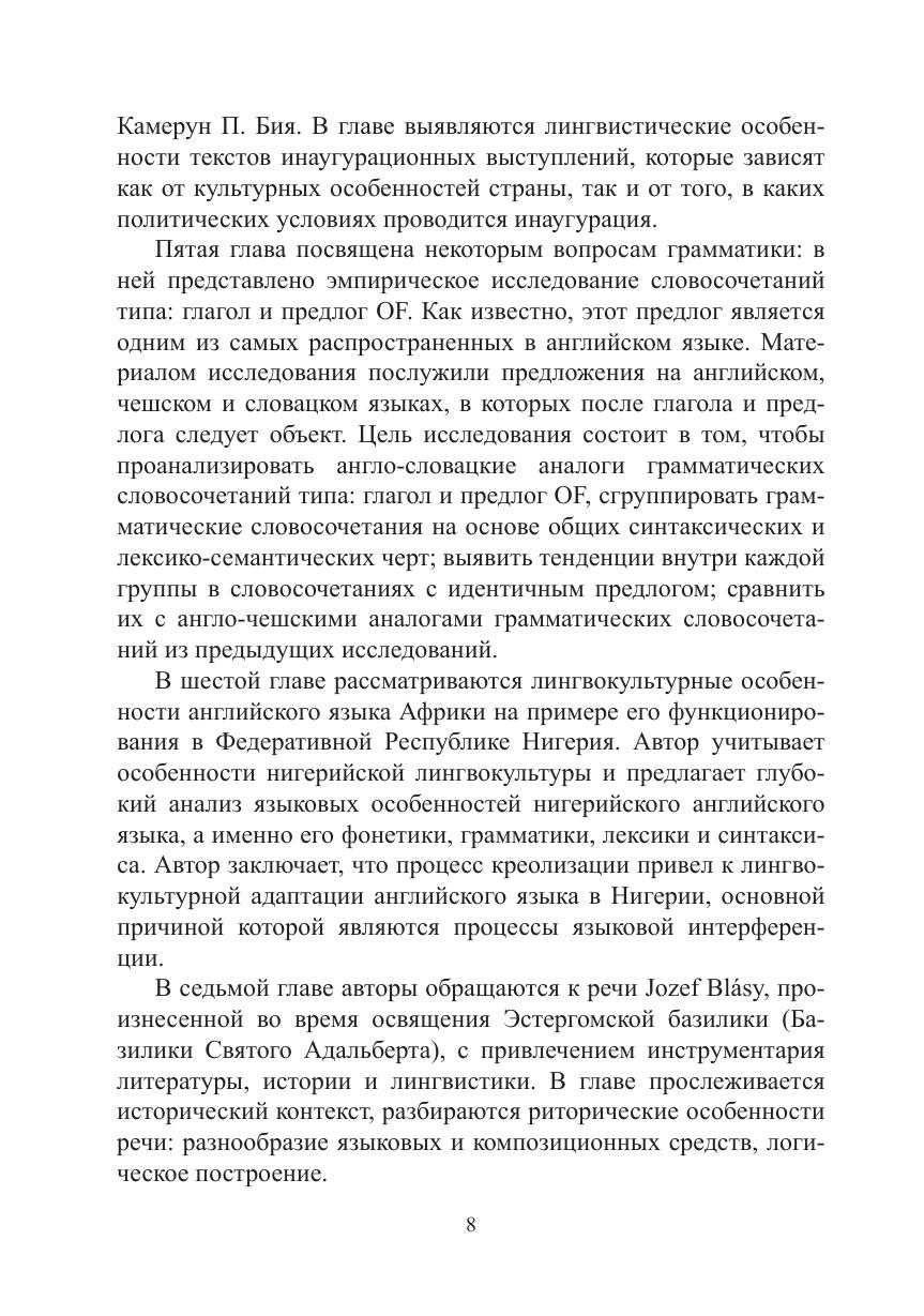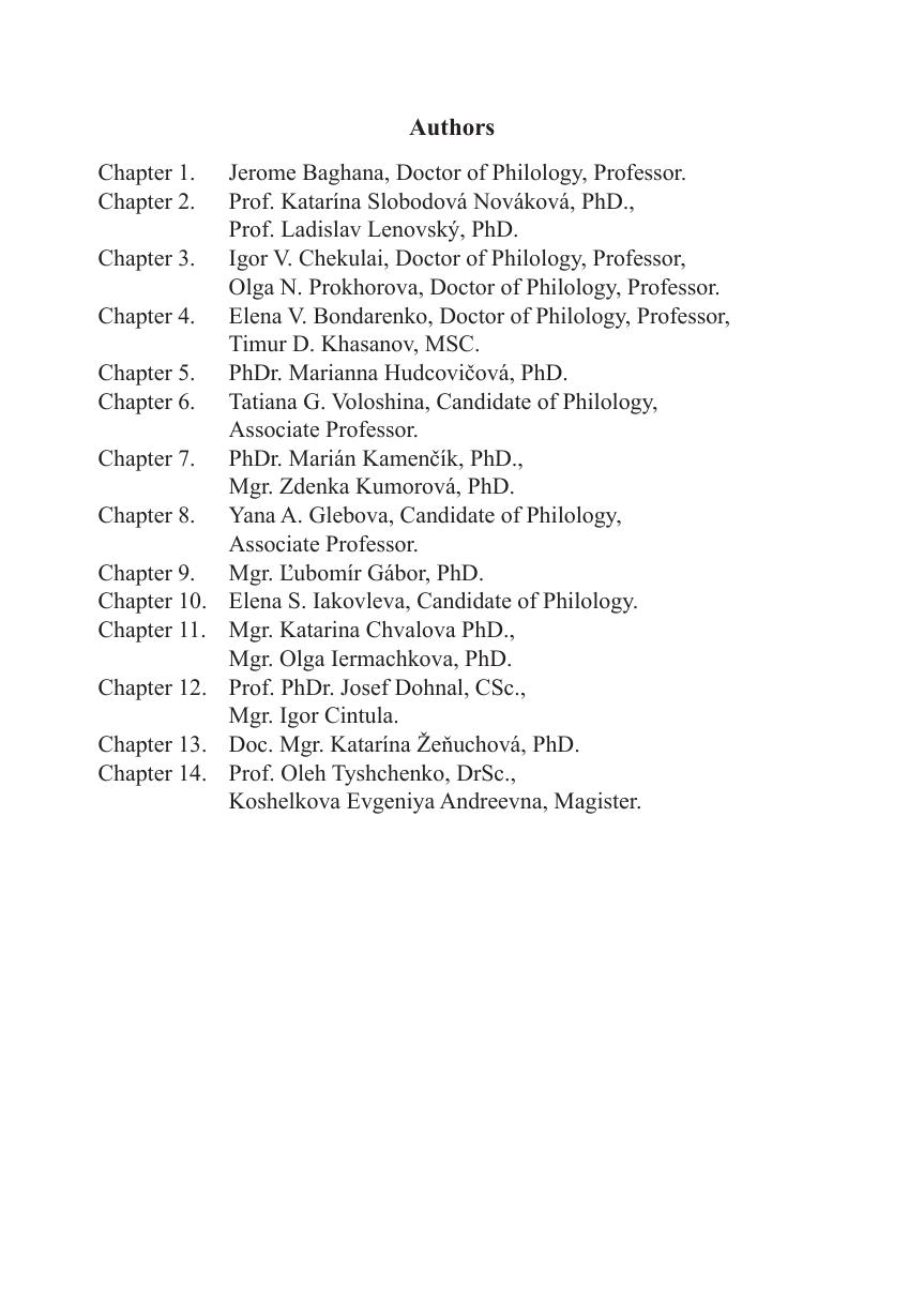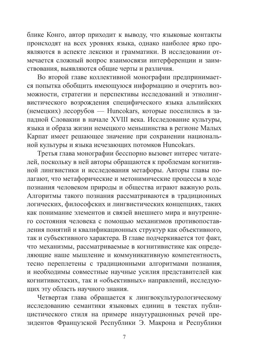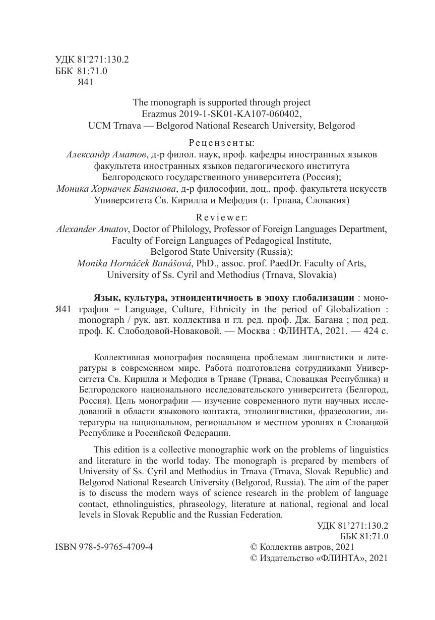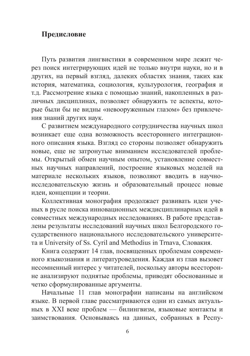 Коллективная монография посвящена проблемам лингвистики и литературы в современном мире. Работа подготовлена сотрудниками Университета Св. Кирилла и Мефодия в Трнаве (Трнава, Словацкая Республика) и Белгородского национального исследовательского университета (Белгород, Россия). Цель монографии — изучение современного пути научных исследований в области языкового контакта, этнолингвистики, фразеологии, ли-тературы на национальном, региональном и местном уровнях в Словацкой Республике и Российской Федерации.