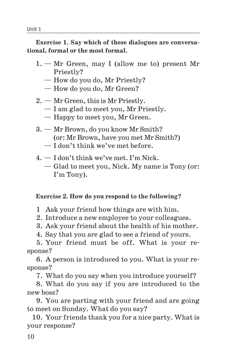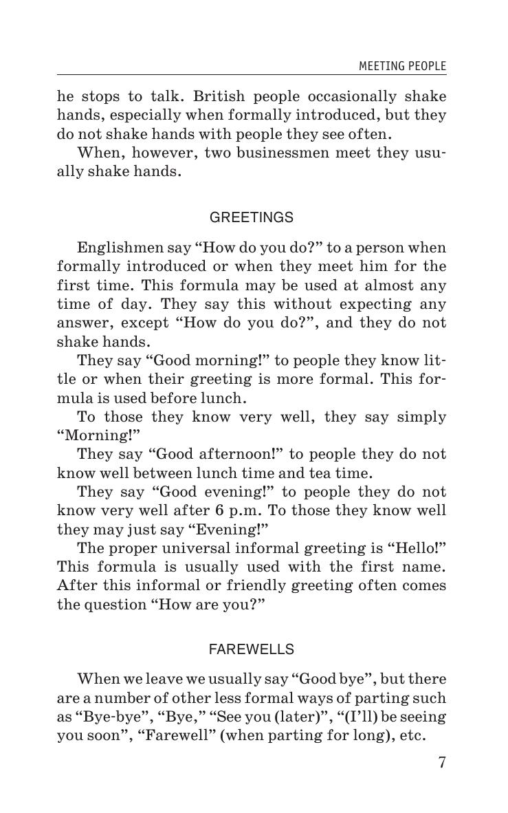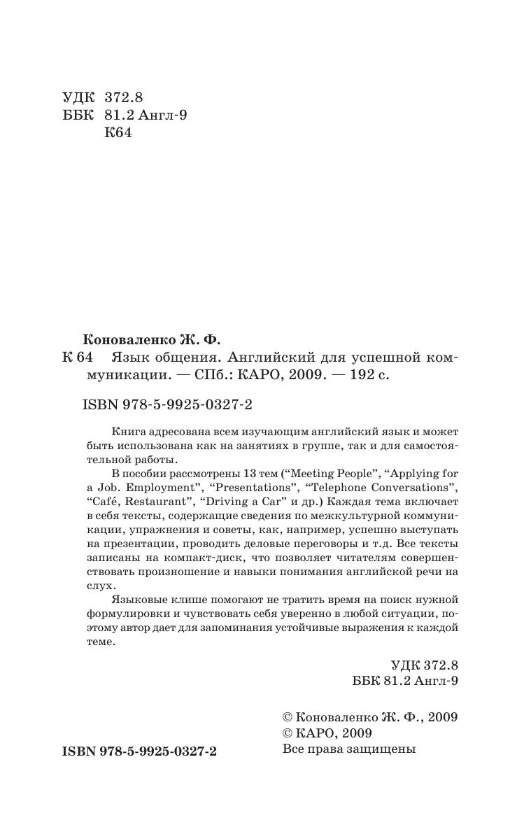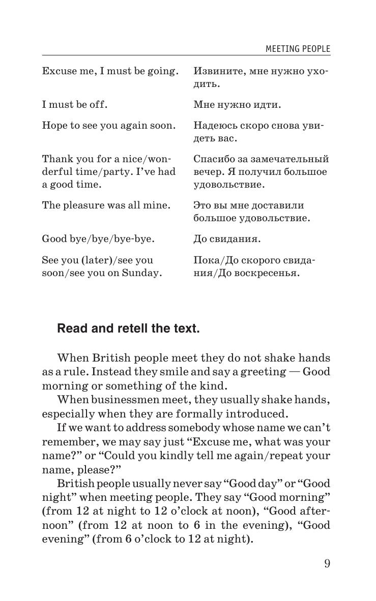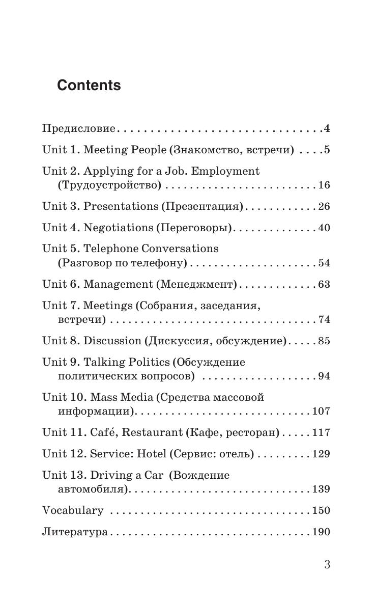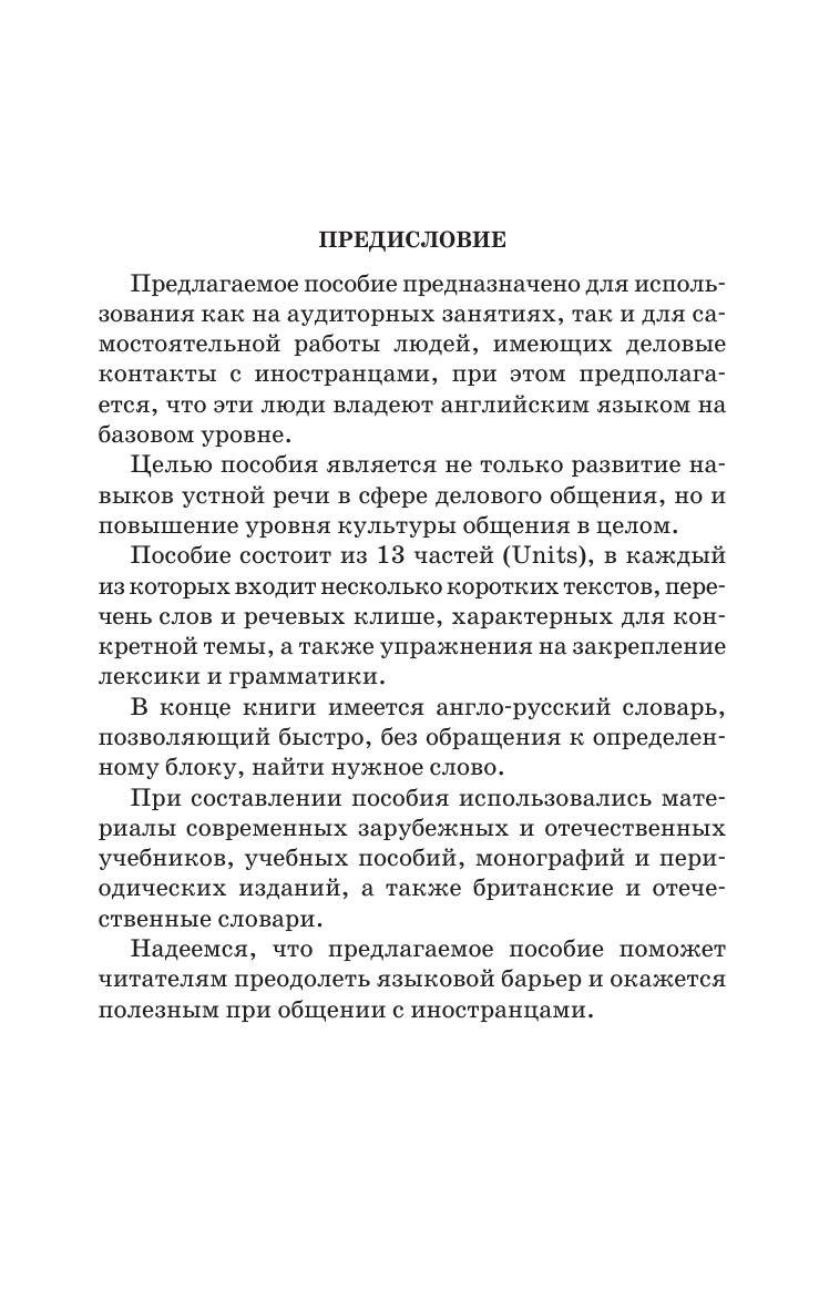Книга адресована всем изучающим английский язык и может быть использована как на занятиях в группе, так и для самостоятельной работы. В пособии рассмотрены 13 тем (“Meeting People”, “Applying for a Job. Employment”, “Presentations”, “Telephone Conversa ti ons”, “Cafe, Restaurant”, “Driving a Car” и др.) Каждая тема включает в себя тексты, содержащие сведения по межкультурной коммуникации, упражнения и советы, как, например, успешно выступать на презентации, проводить деловые переговоры и т.д. Все тексты записаны на компакт-диск, что позволяет читателям совершенствовать произношение и навыки понимания английской речи на слух. Языковые клише помогают не тратить время на поиск нужной формулировки и чувствовать себя уверенно в любой ситуации, поэтому автор дает для запоминания устойчивые выражения к каждой теме.