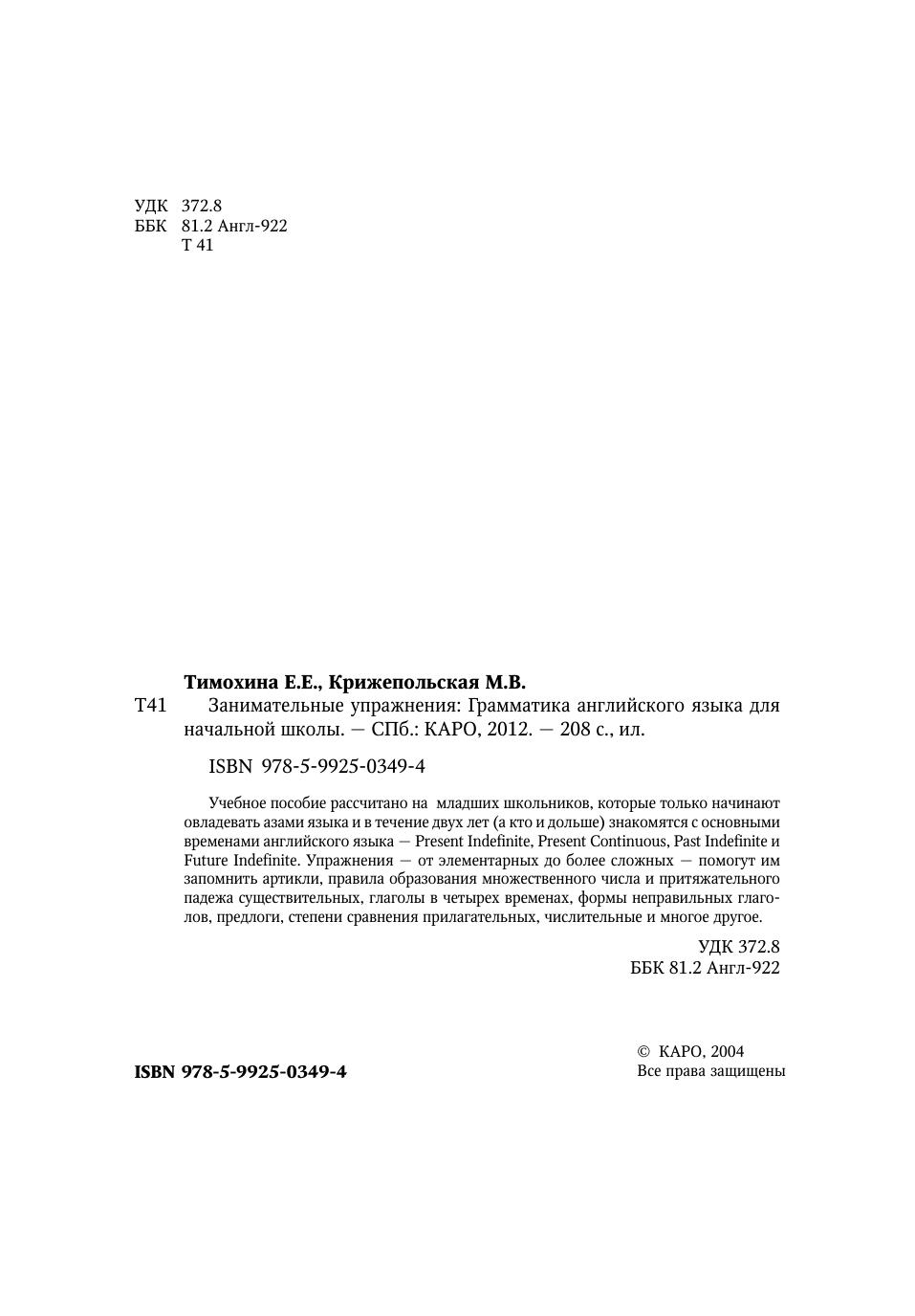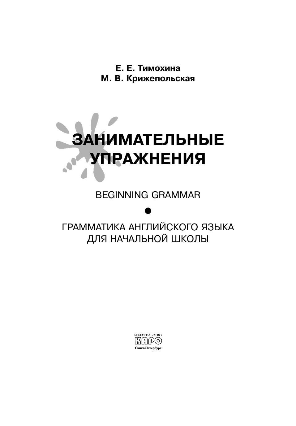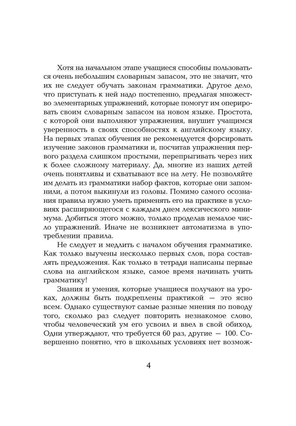 Учебное пособие рассчитано на младших школьников, которые только начинают овладевать азами языка и в течение двух лет (а кто и дольше) знакомятся с основными временами английского языка — Present Indefinite, Present Continuous, Past Indefinite и Future Indefinite. Упражнения — от элементарных до более сложных — помогут им запомнить артикли, правила образования множественного числа и притяжательного падежа существительных, глаголы в четырех временах, формы неправильных глаголов, предлоги, степени сравнения прилагательных, числительные и многое другое.