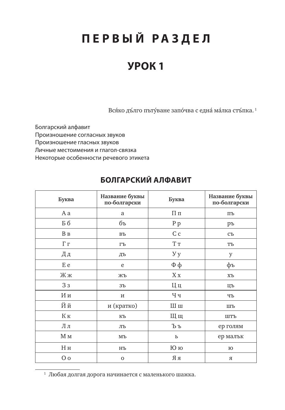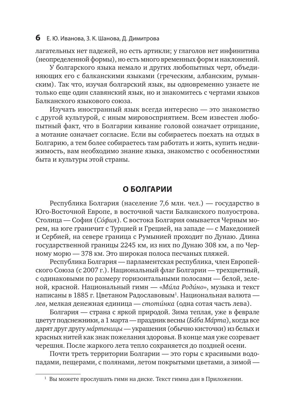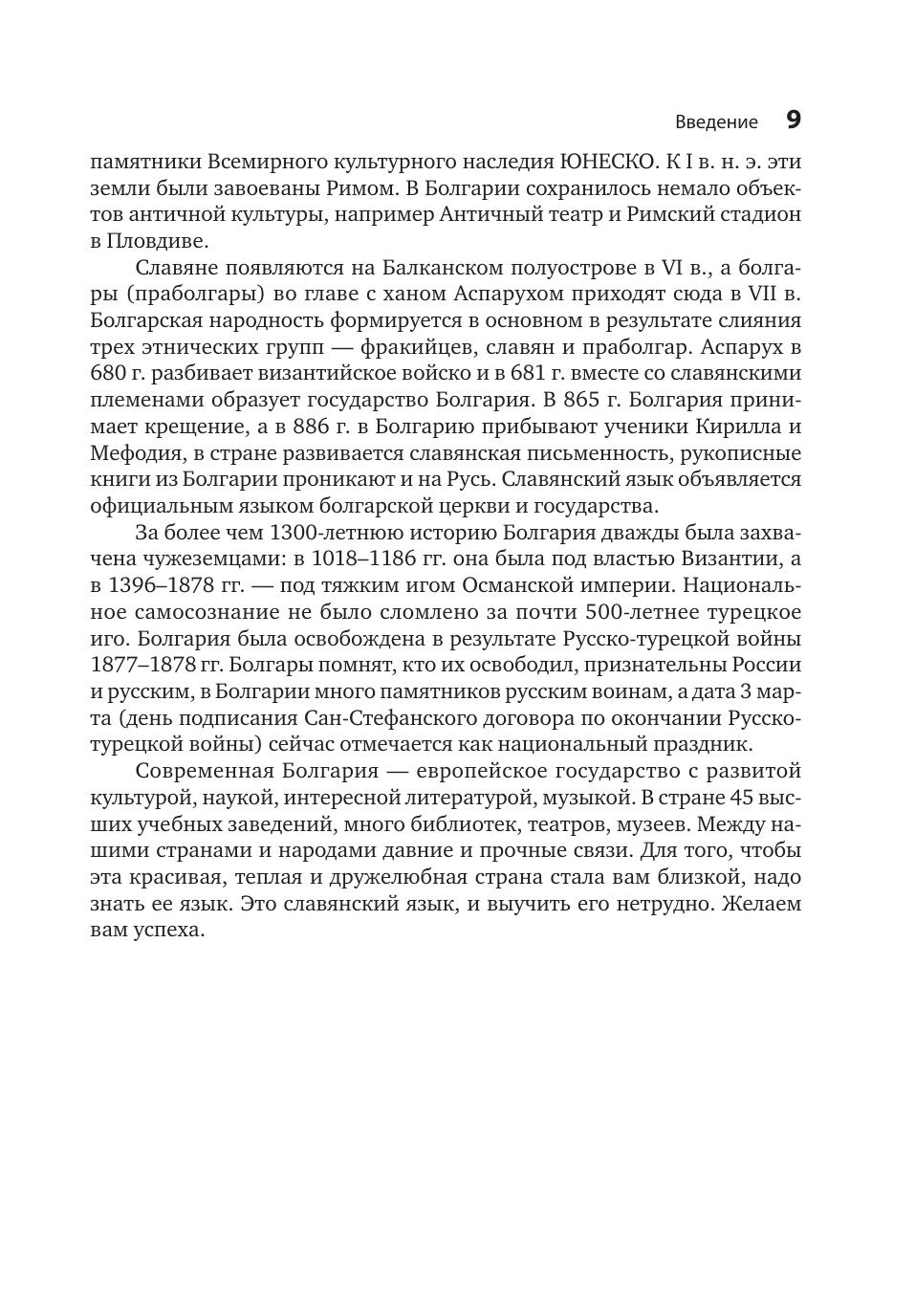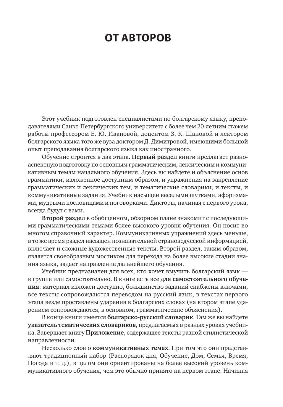 Предлагаемое учебное пособие предназначено для всех, кто хочет выучить болгарский язык — в группе или самостоятельно. В книге, состоящей из двух разделов, есть все для самостоятельного обучения: материал изложен доступно, большинство заданий снабжены ключами, все тексты сопровождаются переводом на русский язык, в текстах первого раздела везде проставлены ударения в болгарских словах (во втором разделе ударением сопровождаются, в основном, грамматические объяснения). Учебник насыщен веселыми шутками, афоризмами, мудрыми пословицами и поговорками.В конце книги имеется болгарско-русский словарик и указатель тематических словариков, предлагаемых в разных уроках учебника.Тексты и диалоги записаны на компакт-диск в формате mp3, прослушивание его облегчит усвоение болгарского произношения и поможет научиться извлекать информацию из устной речи.
