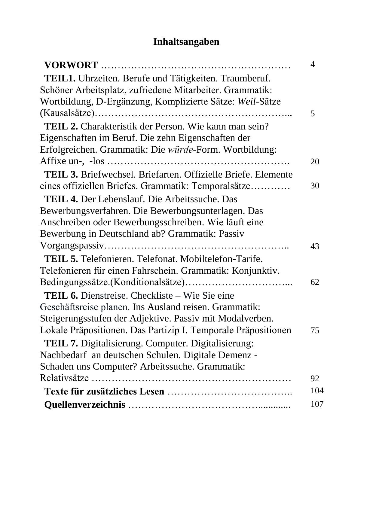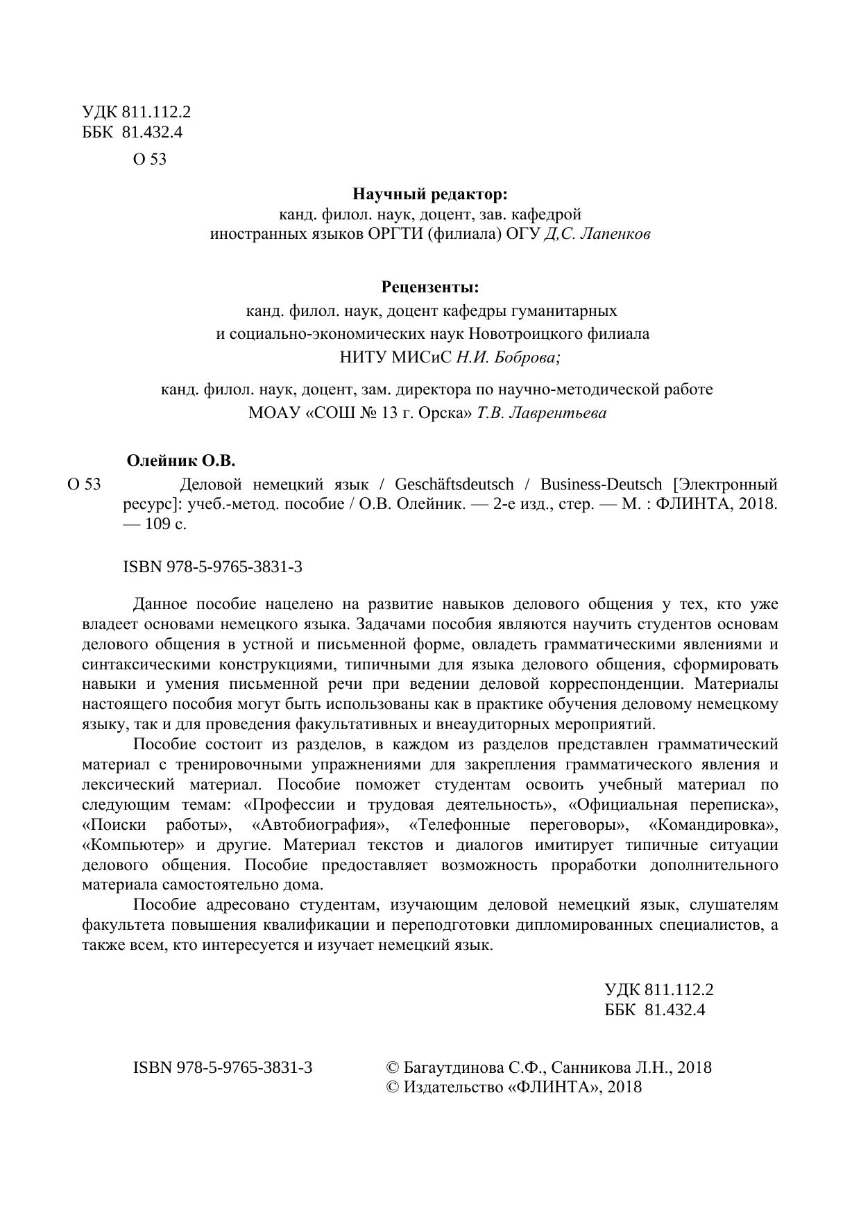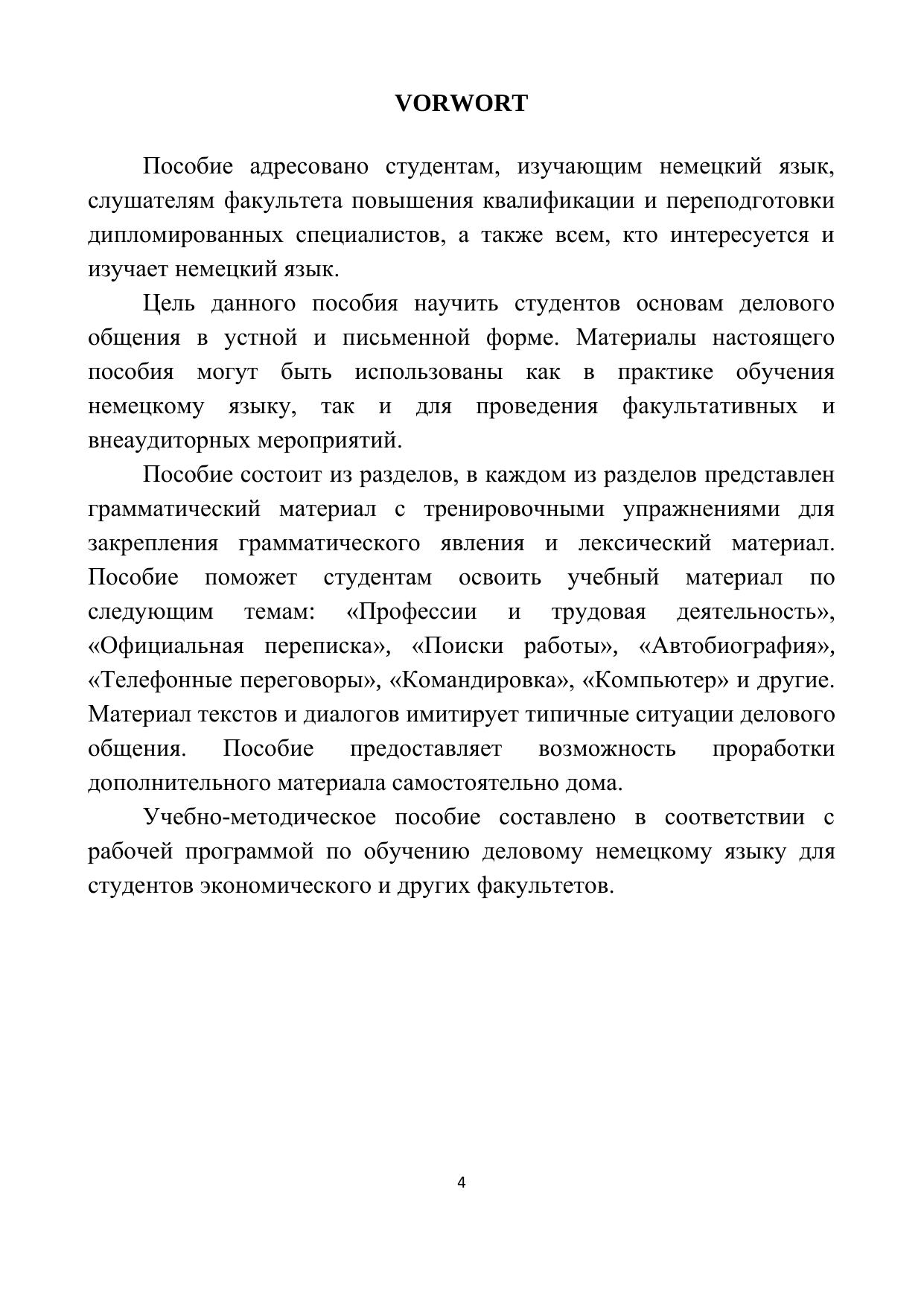 Данное пособие нацелено на развитие навыков делового общения у тех, кто уже владеет основами немецкого языка. Задачами пособия являются научить студентов основам делового общения в устной и письменной форме, овладеть грамматическими явлениями и синтаксическими конструкциями, типичными для языка делового общения, сформировать навыки и умения письменной речи при ведении деловой корреспонденции. Материалы настоящего пособия могут быть использованы как в практике обучения деловому немецкому языку, так и для проведения факультативных и внеаудиторных мероприятий. Пособие состоит из разделов, в каждом из разделов представлен грамматический материал с тренировочными упражнениями для закрепления грамматического явления и лексический материал. Пособие поможет студентам освоить учебный материал по следующим темам: «Профессии и трудовая деятельность», «Официальная переписка», «Поиски работы», «Автобиография», «Телефонные переговоры», «Командировка», «Компьютер» и другие. Материал текстов и диалогов имитирует типичные ситуации делового общения. Пособие предоставляет возможность проработки дополнительного материала самостоятельно дома. Пособие адресовано студентам, изучающим деловой немецкий язык, слушателям факультета повышения квалификации и переподготовки дипломированных специалистов, а также всем, кто интересуется и изучает немецкий язык.