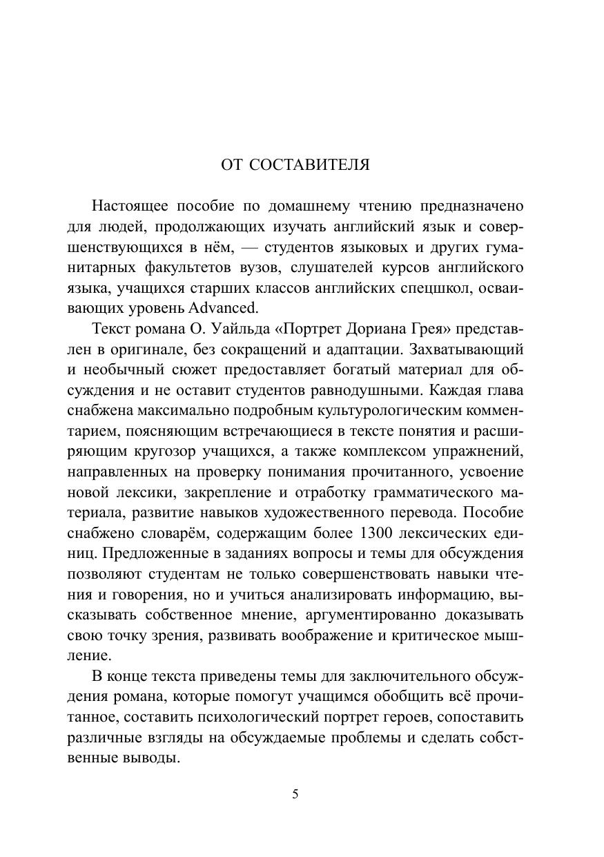 Пособие по домашнему чтению на английском языке, разработанное к оригинальной неадаптированной версии романа О. Уайльда «Портрет Дориана Грея» с самыми полными и подробными культурологическими комментариями к тексту, которые сделают чтение этого увлекательного произведения ещё более интересным. Комплекс упражнений, вопросов для обсуждения и дополнительных заданий помогает формировать и развивать языковые навыки (лексические и грамматические) и речевые умения в таких видах речевой деятельности, как чтение, говорение и письмо. Для студентов, аспирантов и преподавателей филологических факультетов вузов, а также всех изучающих английский язык самостоятельно.