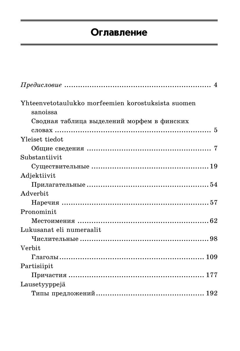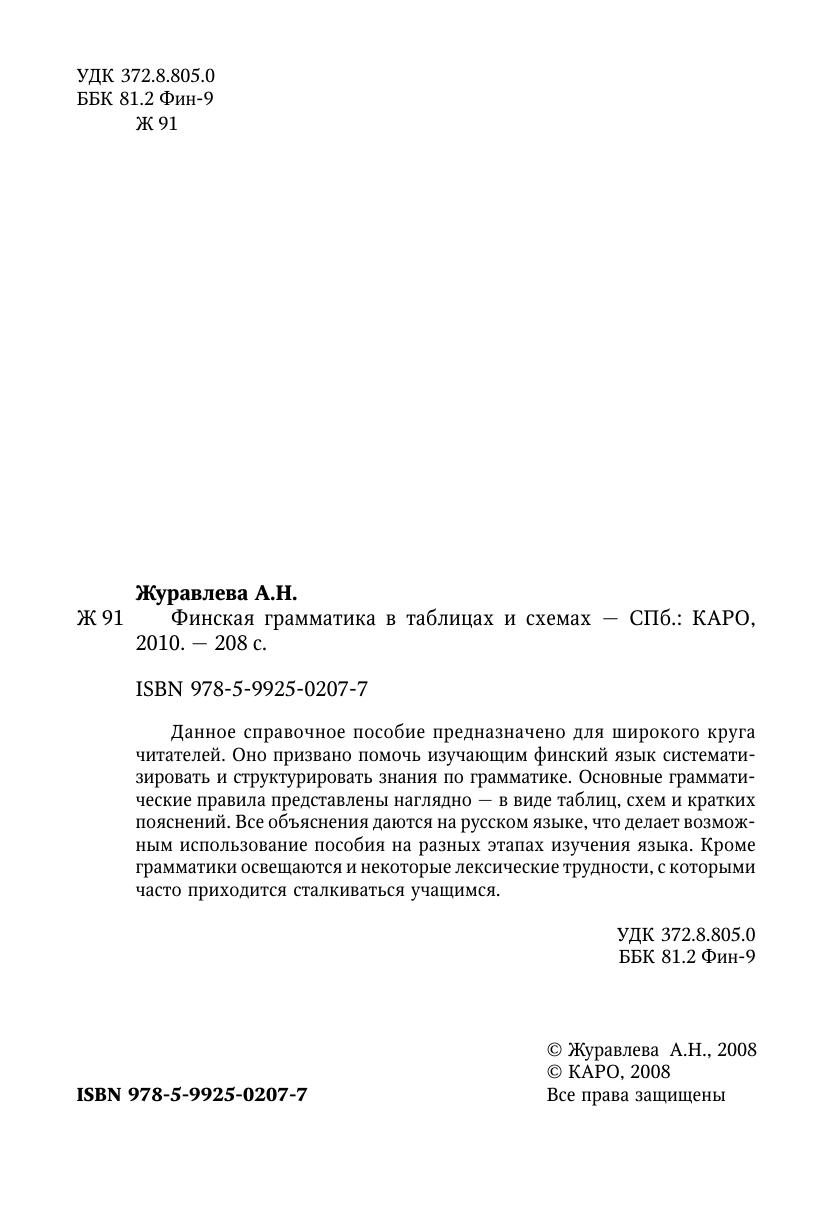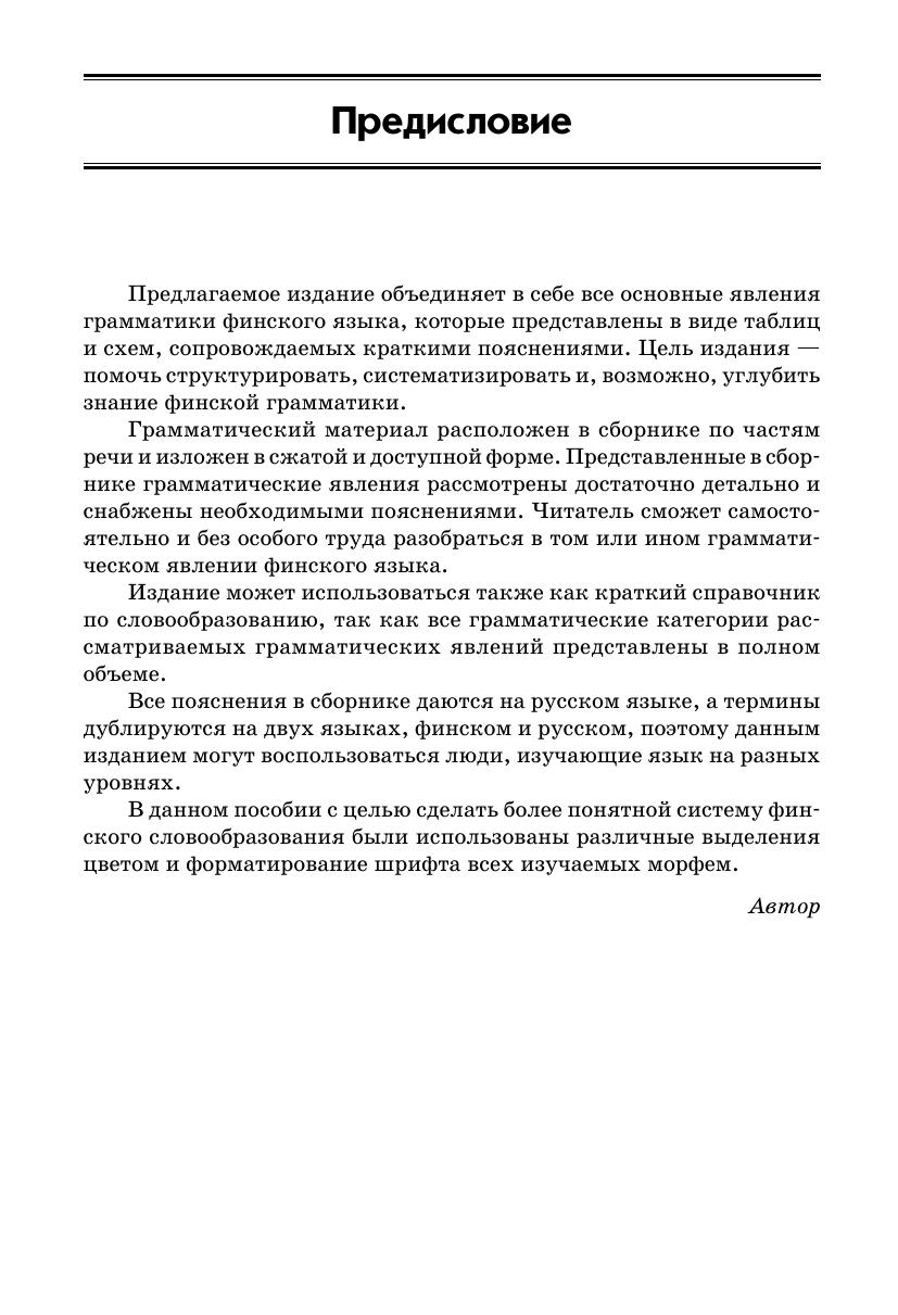 Данное справочное пособие предназначено для широкого круга читателей. Оно призвано помочь изучающим финский язык систематизировать и структурировать знания по грамматике. Основные грамматические правила представлены наглядно — в виде таблиц, схем и кратких пояснений. Все объяснения даются на русском языке, что делает возможным использование пособия на разных этапах изучения языка. Кроме грамматики освещаются и некоторые лексические трудности, с которыми часто приходится сталкиваться учащимся.